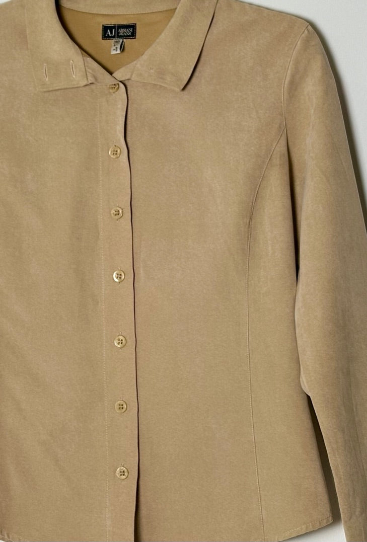 Vintage Armani Jeans skyrta í ljósbrúnum lit. Skyrtan er úr mjúku efni, með tölum að framan og kraga. Skyrtan er aðsniðin.