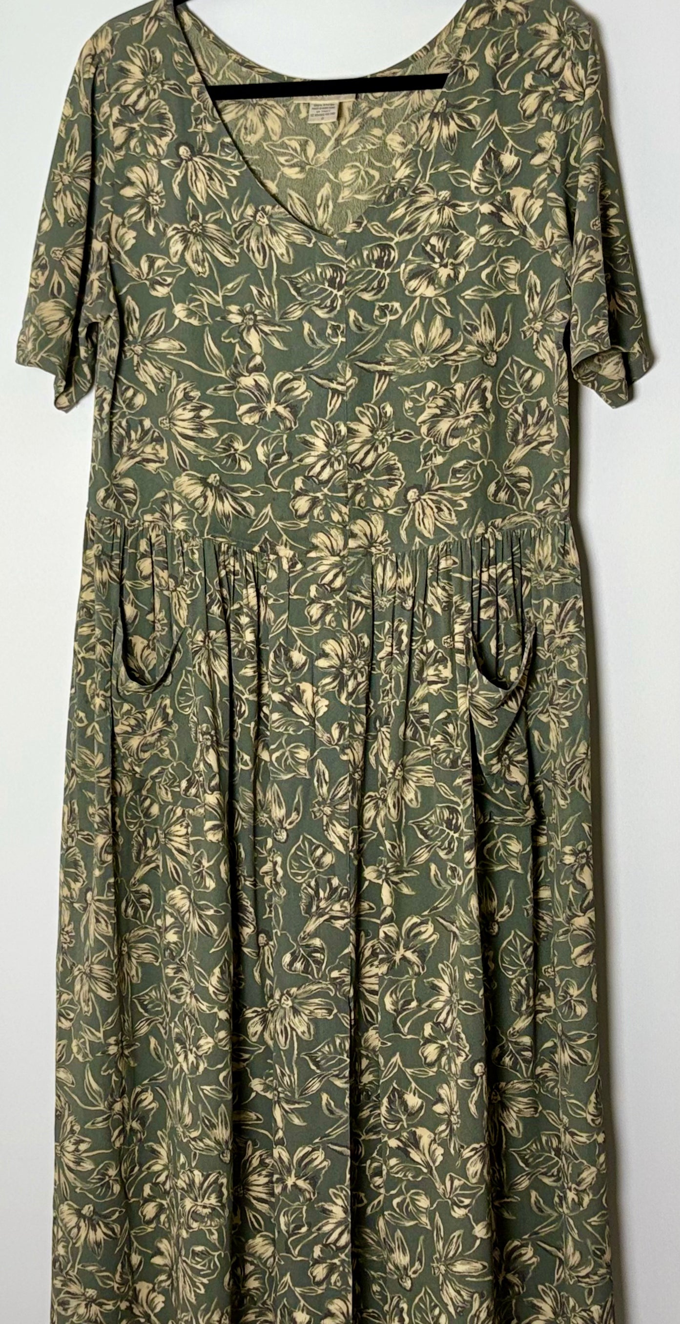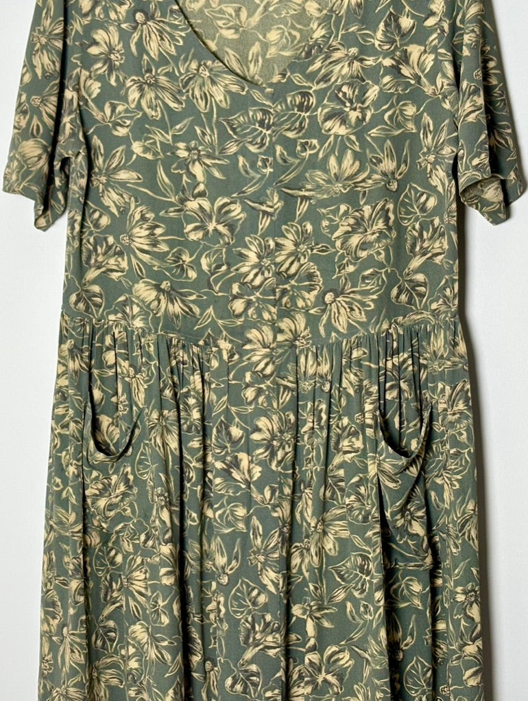 Sætur vintage Banana Kjóll. Kjóllinn er stutterma, með v-hálsmáli og blómamunstri. Tveir litlir vasar eru framan á kjólnum. Klauf í miðjunni. Síddin er midi.