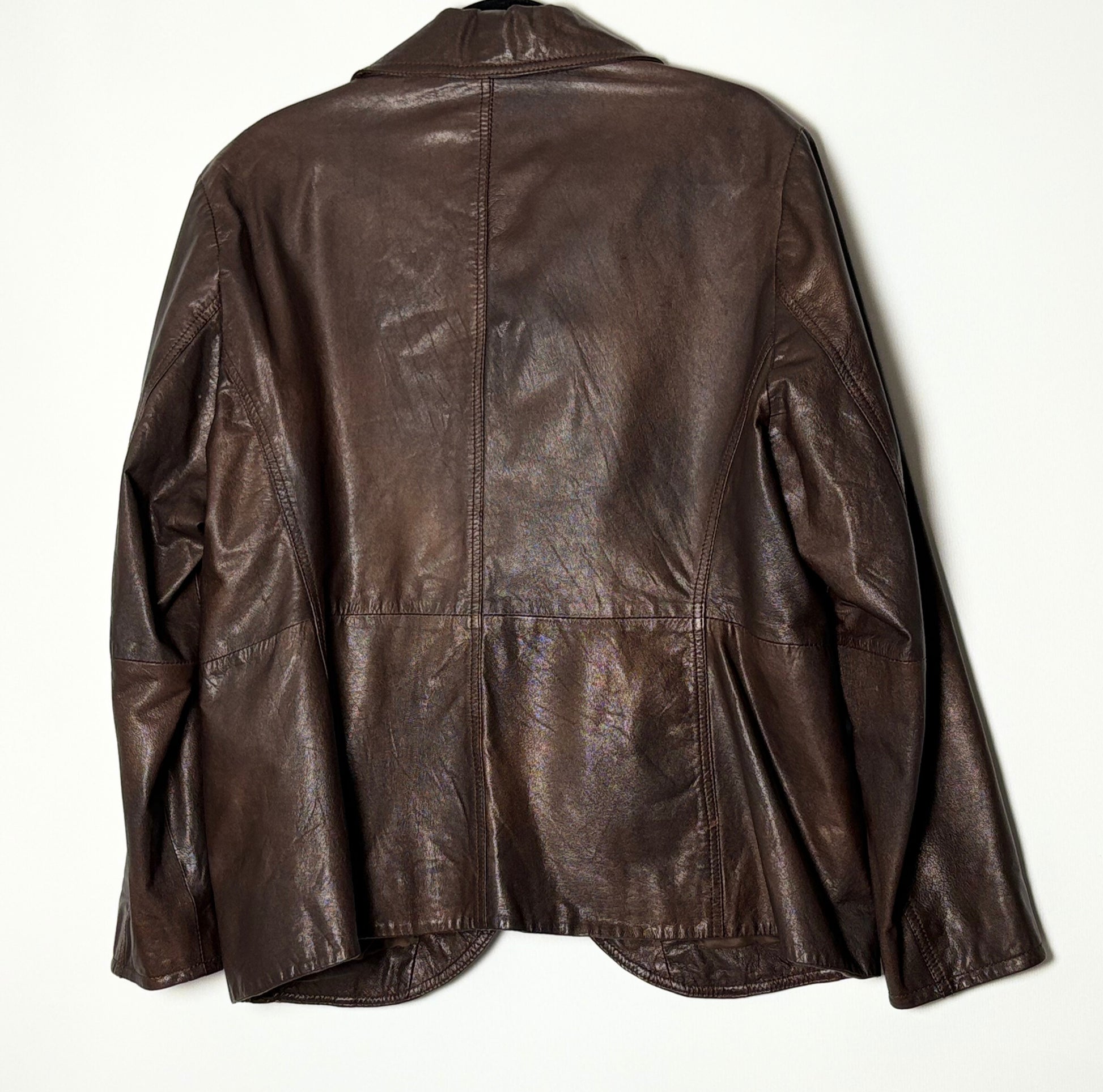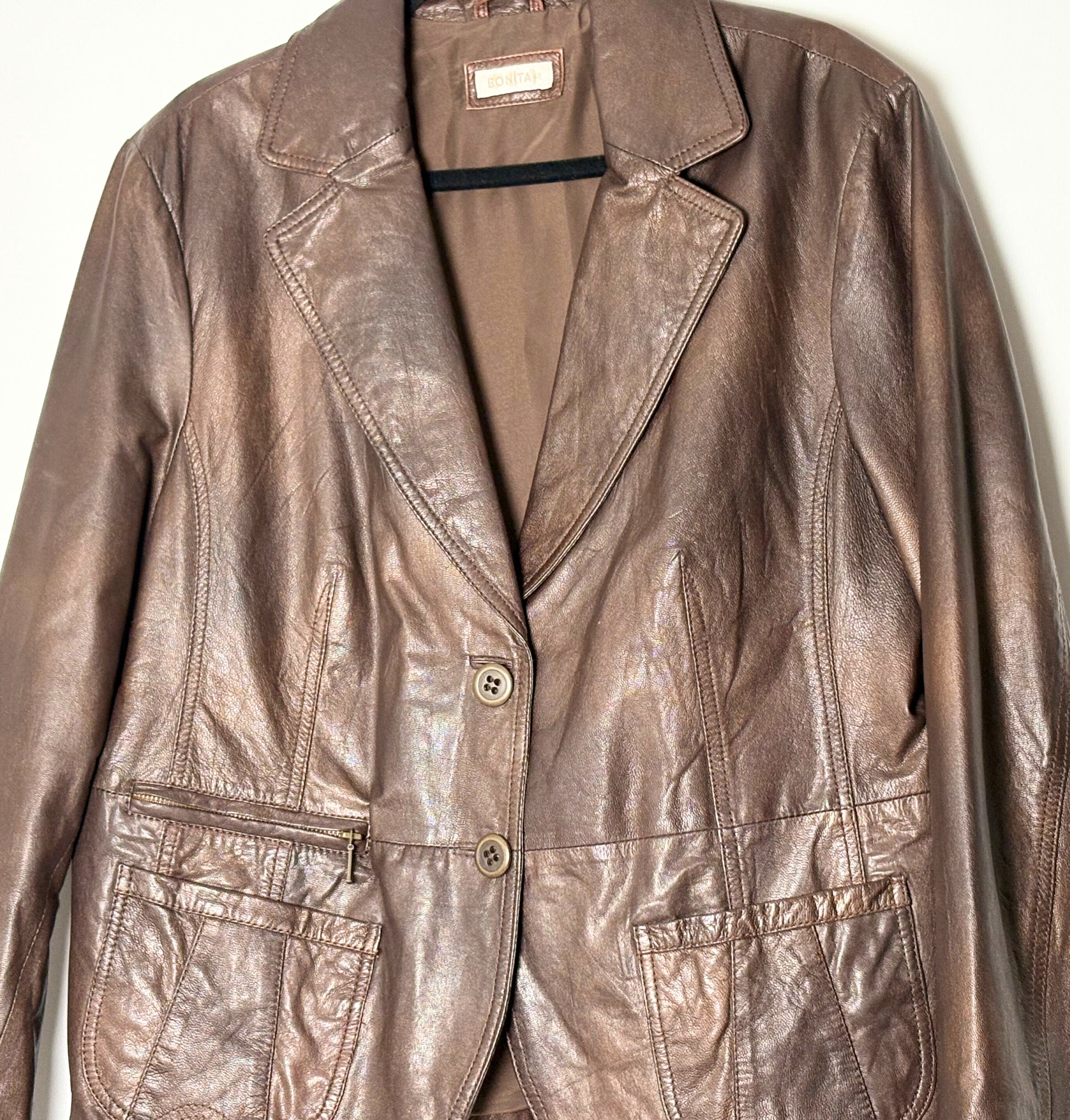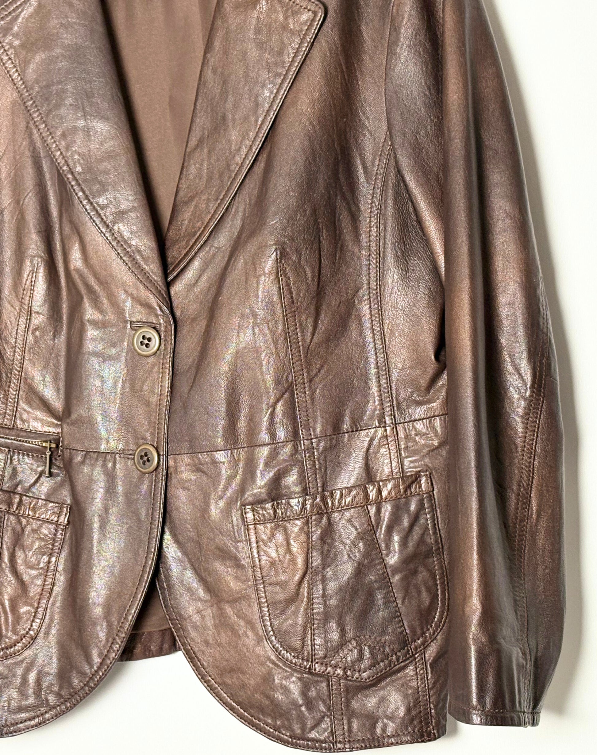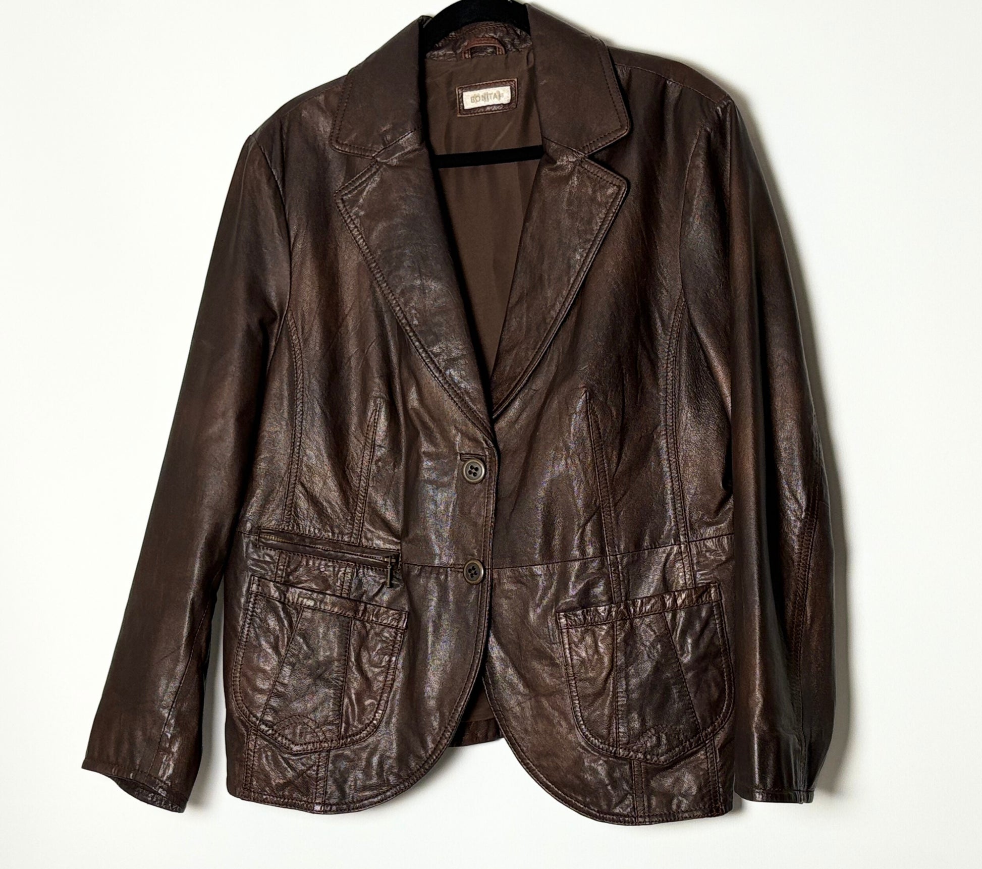 Vintage leðurjakki í dökkbrúnum lit. Jakkinn hneppist að framan og er með tveim opnum vösum og einum renndum vasa. Sniðið er hefðbundið.