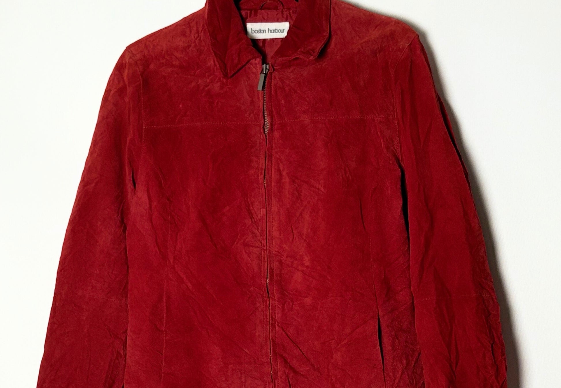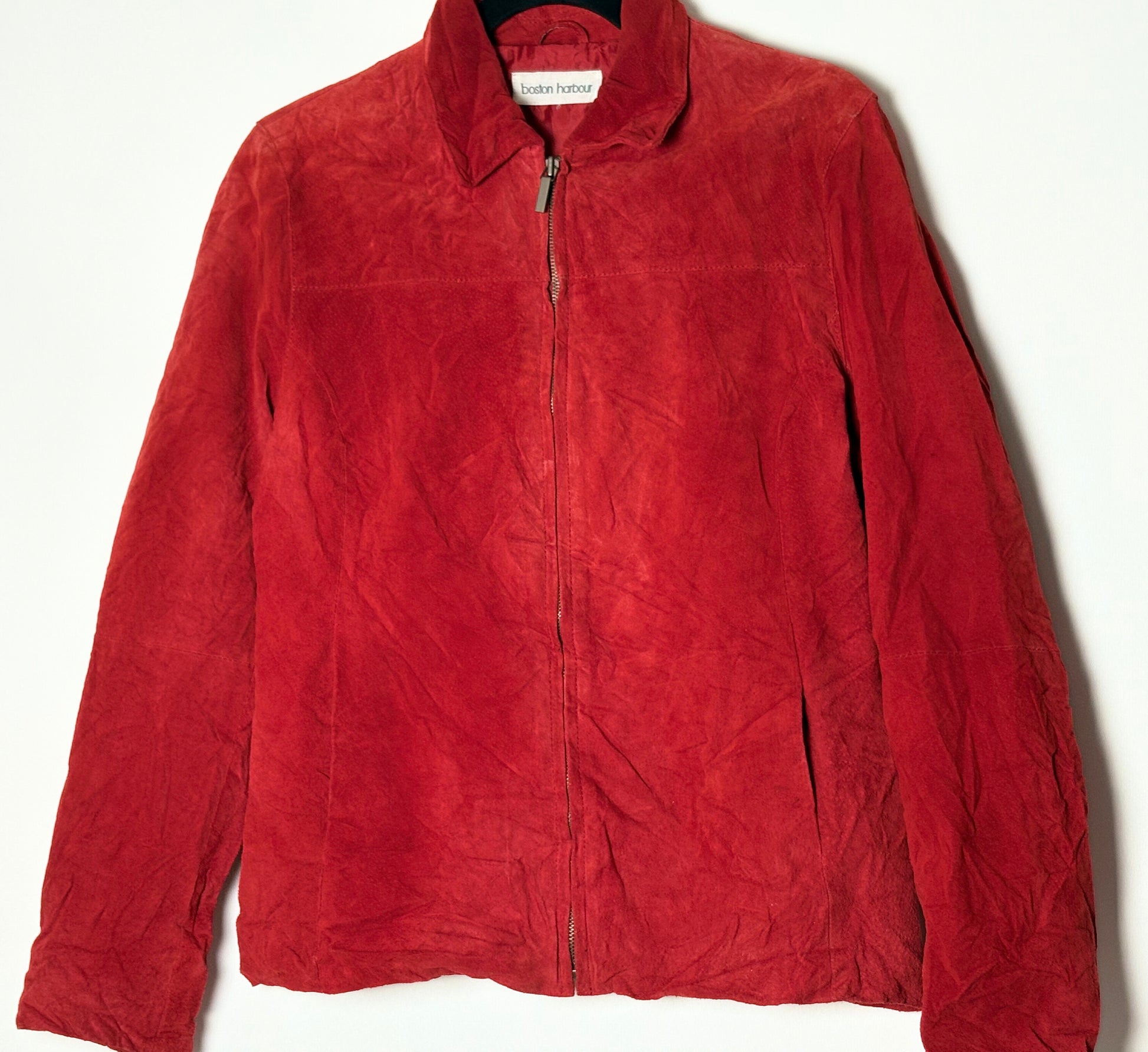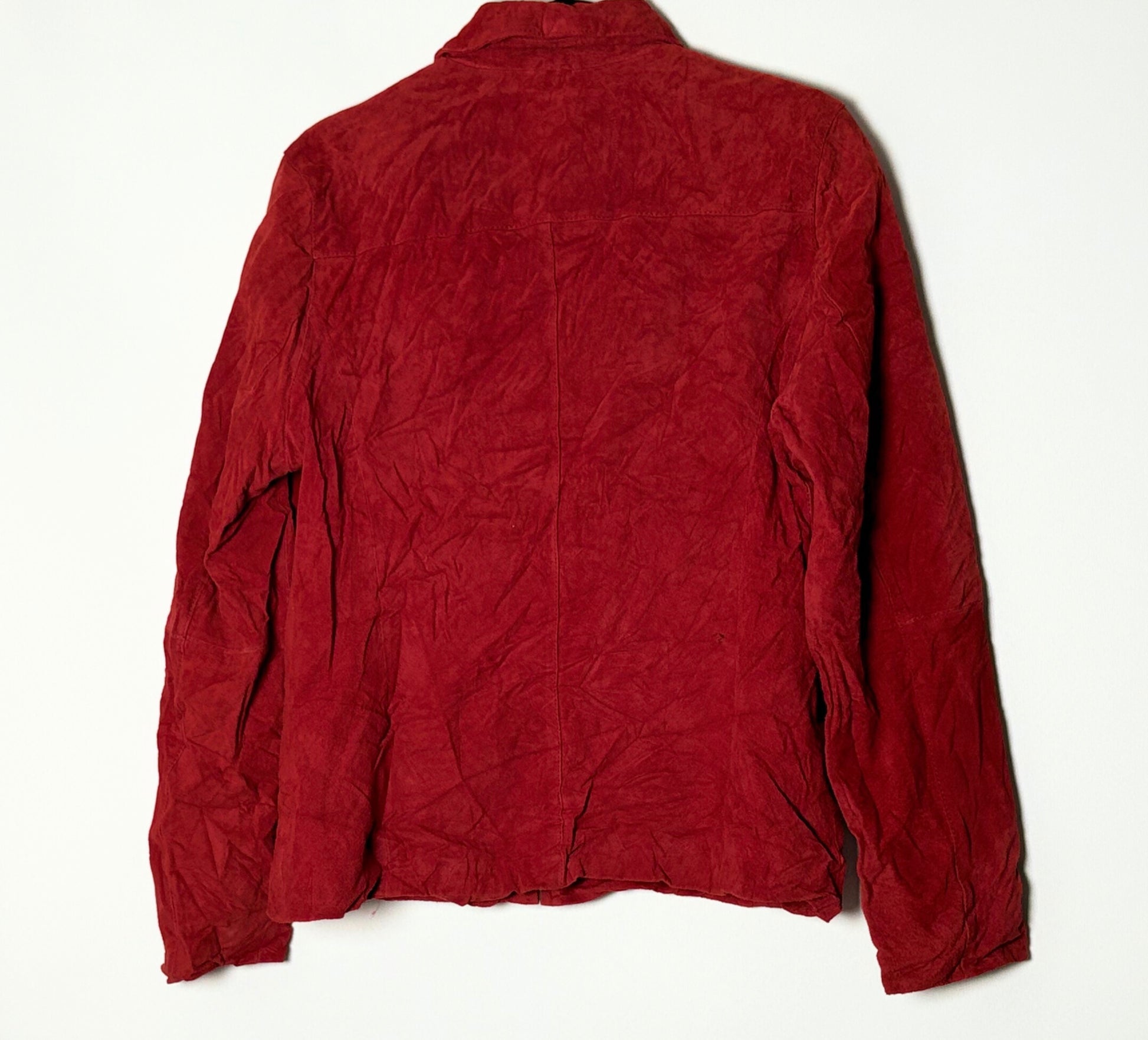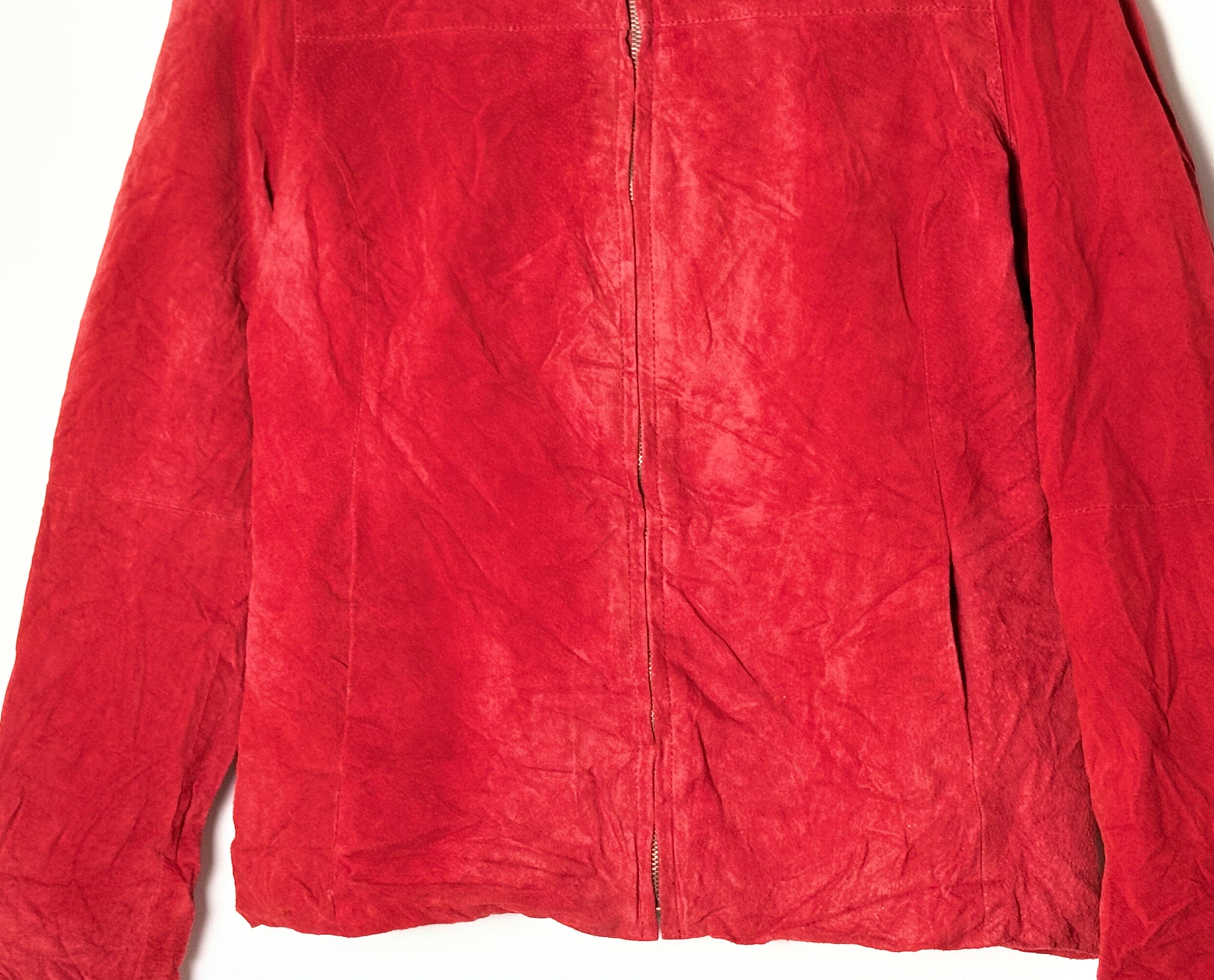 Vintage rússkinns leðurjakki. Jakkinn er með kraga og rennilás að framan. Tveir nothæfir vasar. Hefðbundið snið.
