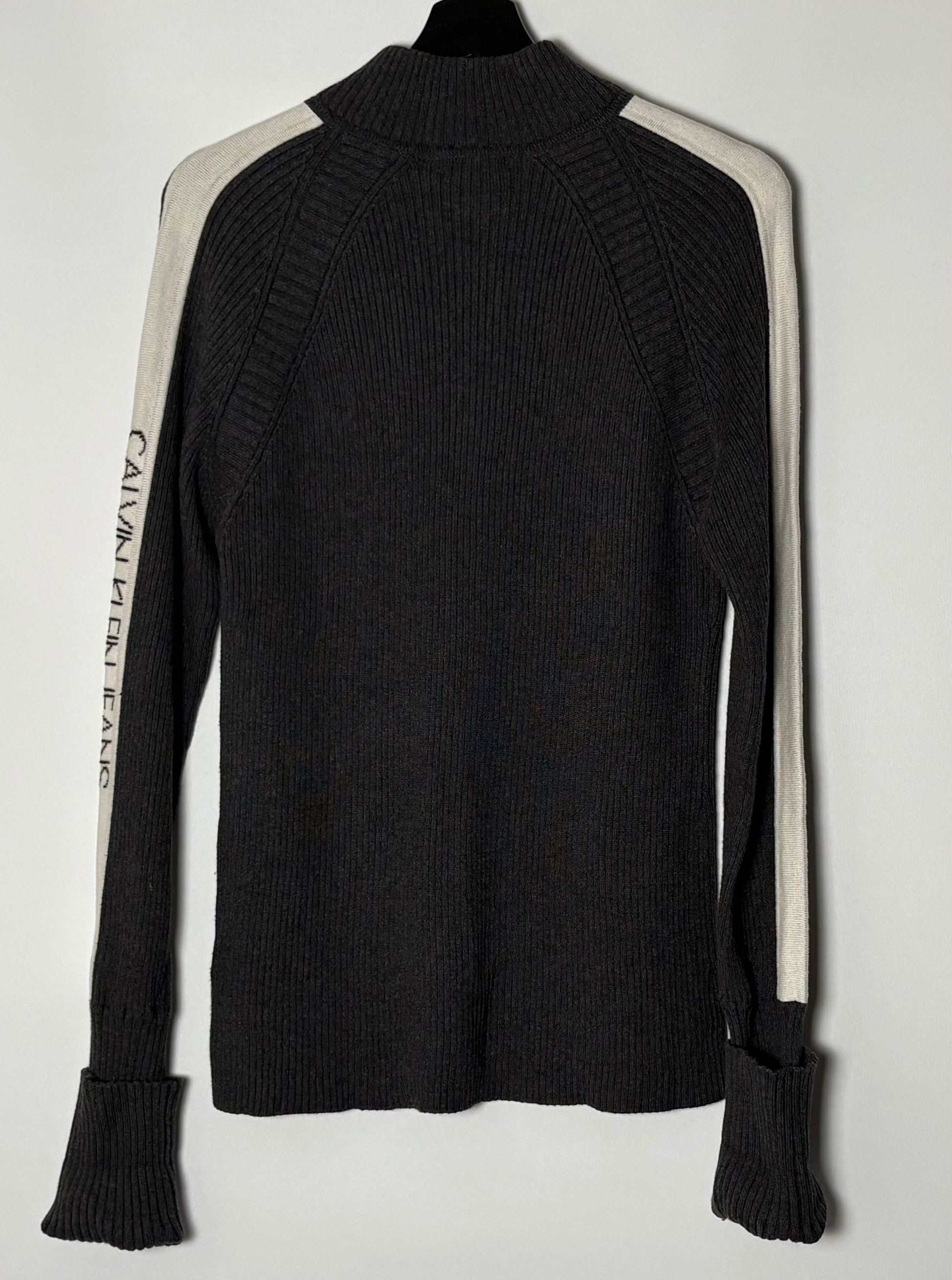 Vintage Y2K Calvin Klein peysa. Peysan er grá á litinn með hálfum rennilás og Calvin Klein logo á vinstri erminni. Mjúk og teygist vel.