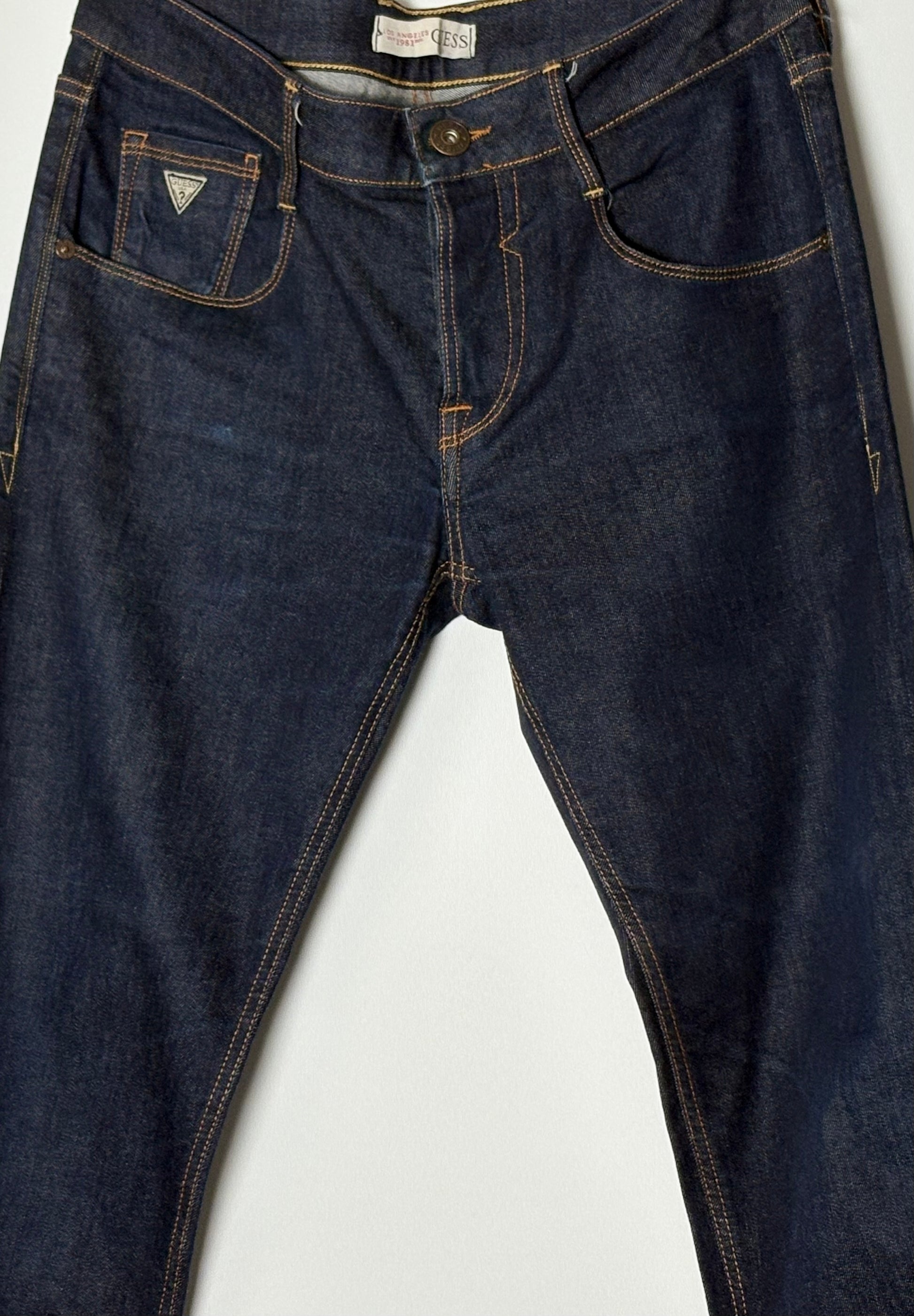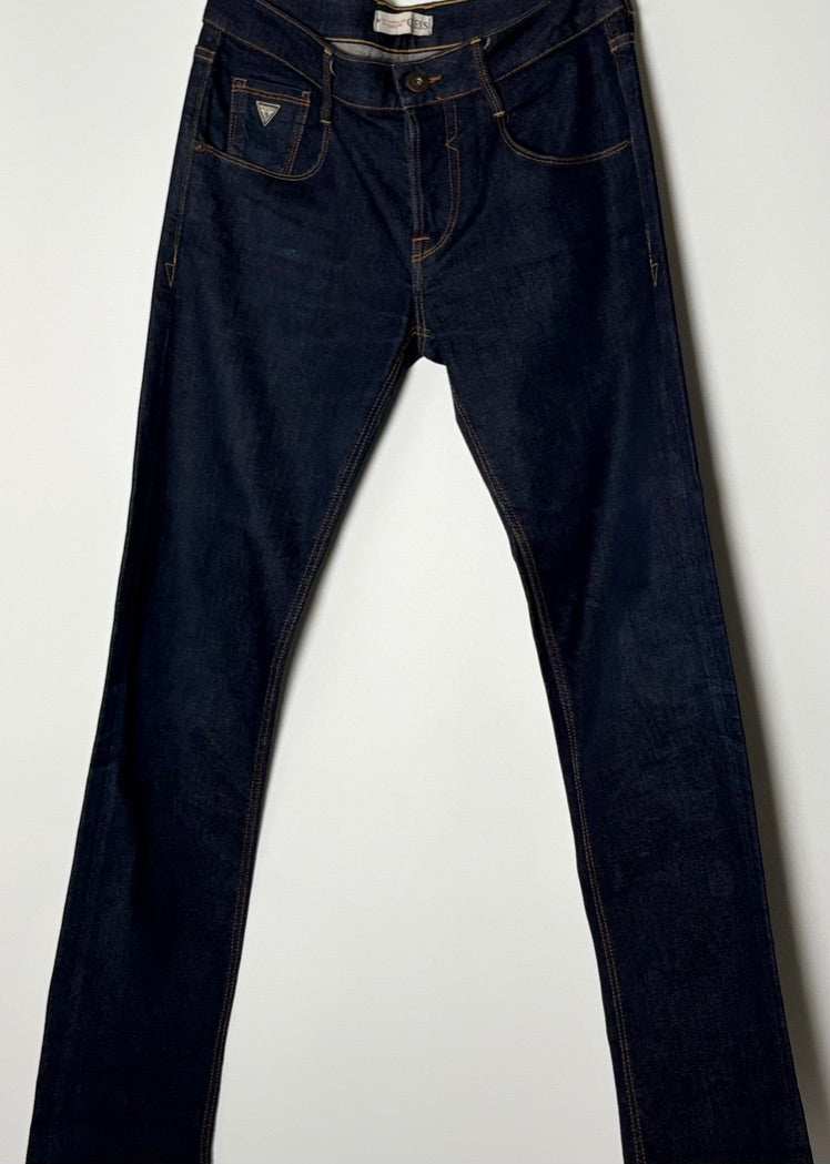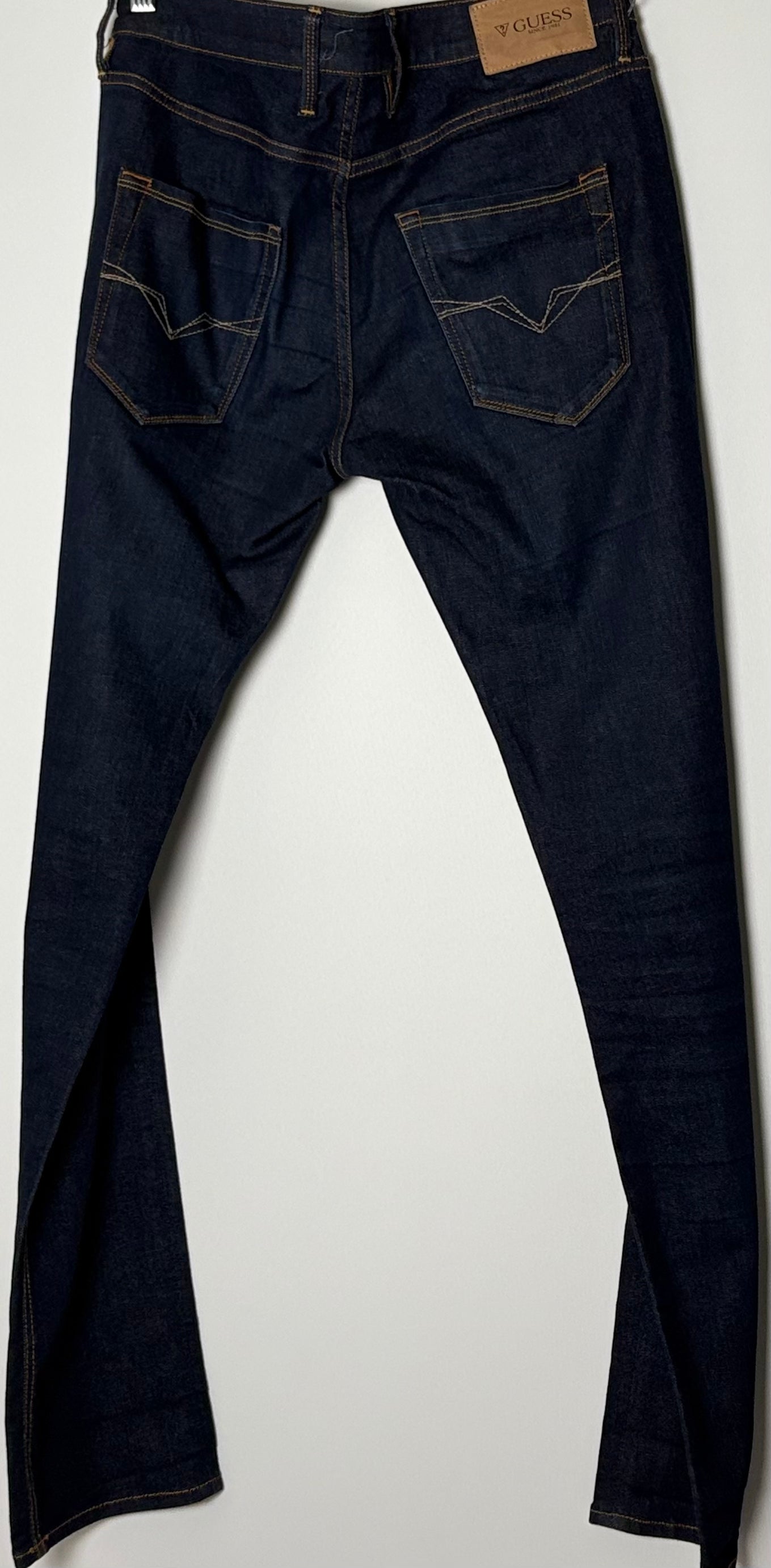 Slim fit gallabuxur frá merkinu Guess. Gallabuxurnar eru dökkbbláar og miðlungsháar í mittið. Tölufestingar að framan. Það er teygja í buxunum.
