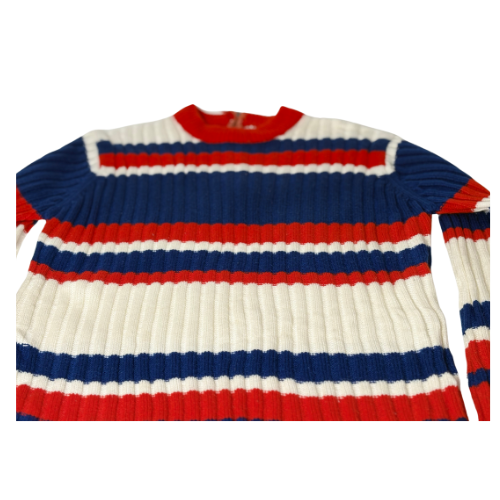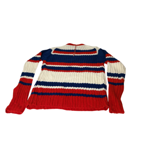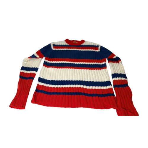 Vintage rauð, dökkblá og hvít peysa. Engin stærðarmerking en passar vel á M. Rennilás aftan á.