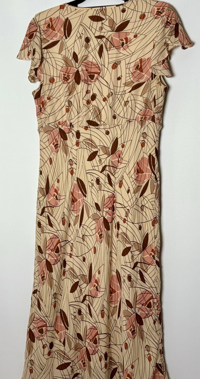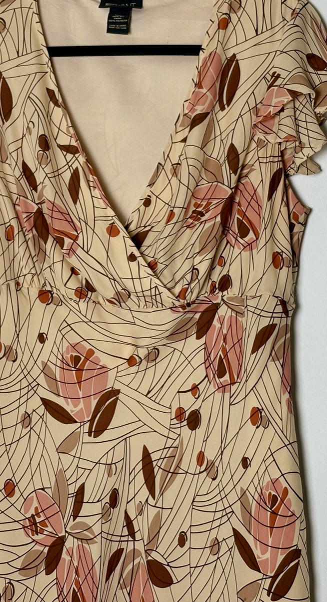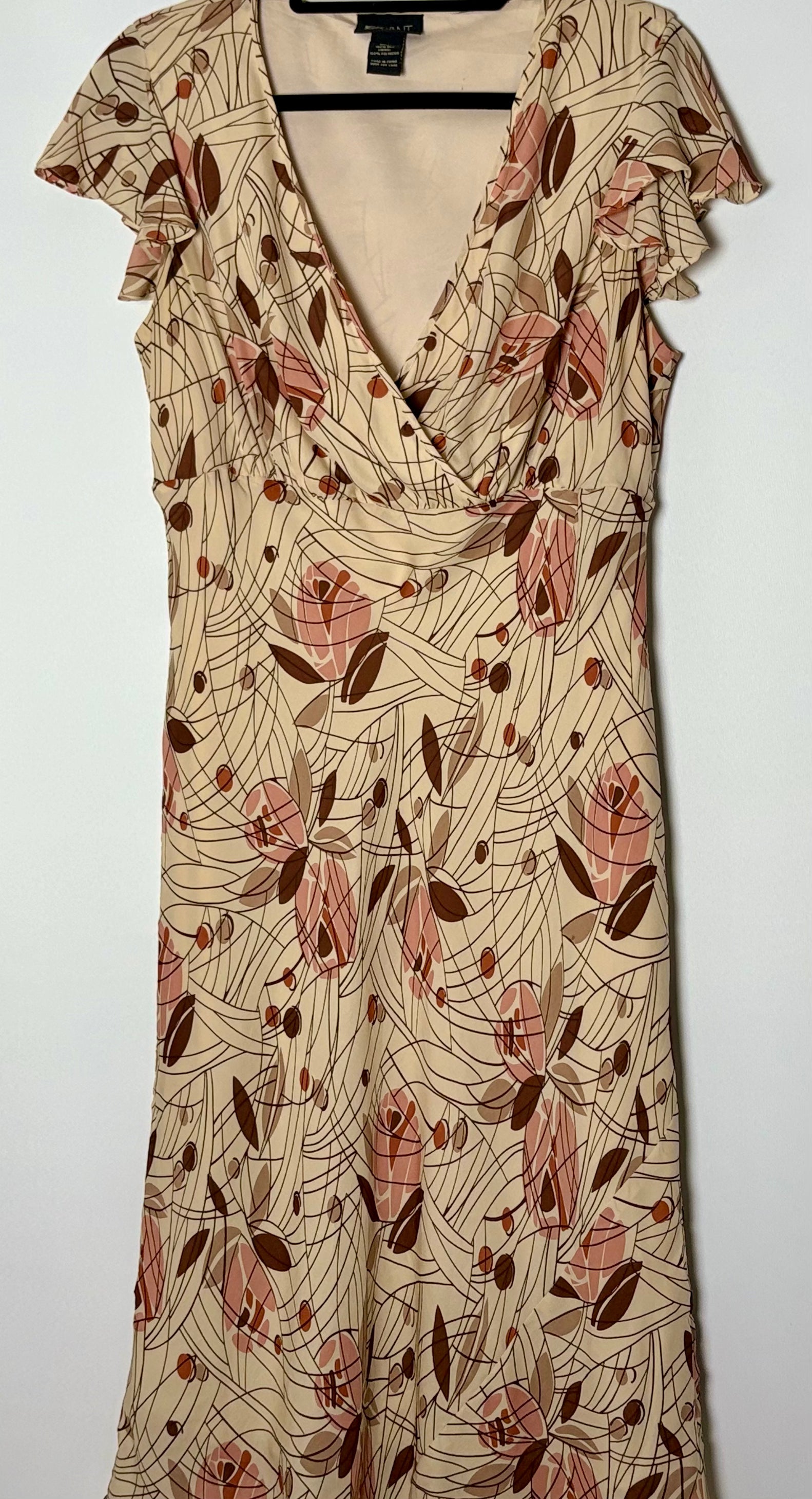Fallegur silkikjóll frá vörumerkinu Lane Bryant. Kjóllinn er með stuttum, gegnsæjum ermum og djúpu v-hálsmáli. Síddin er midi og sniðið hefðbundið.