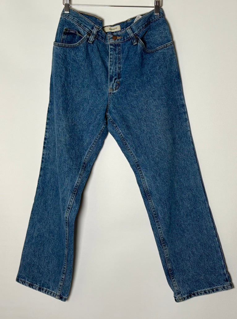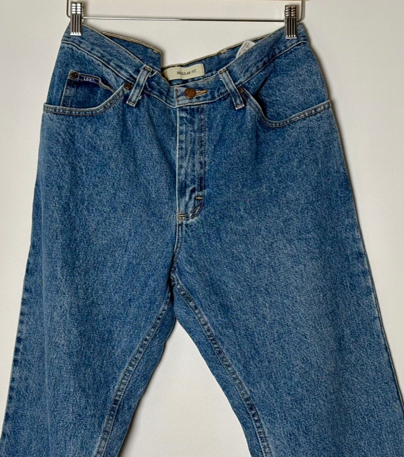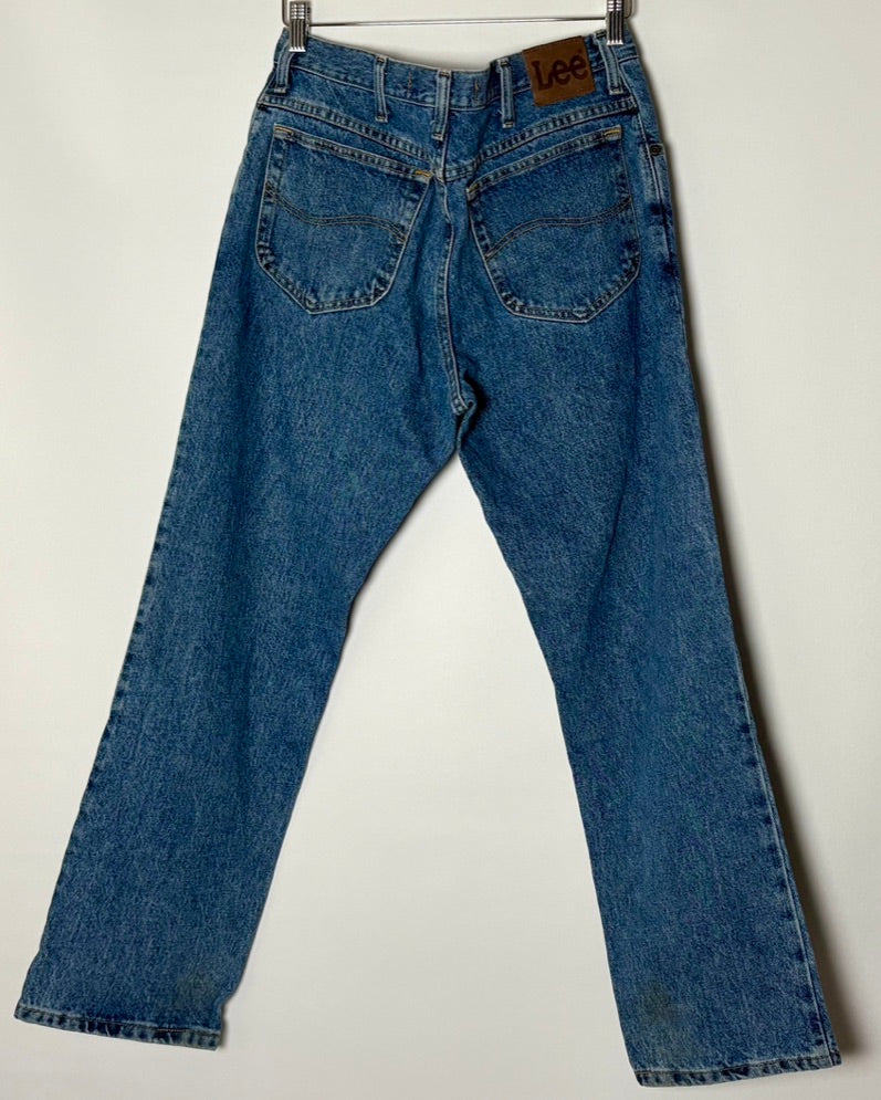 Vintage Lee gallabuxur. Buxurnar eru high-rise og með venjulegt snið. Þvotturinn er miðlungsblár. Buxurnar eru stífar.