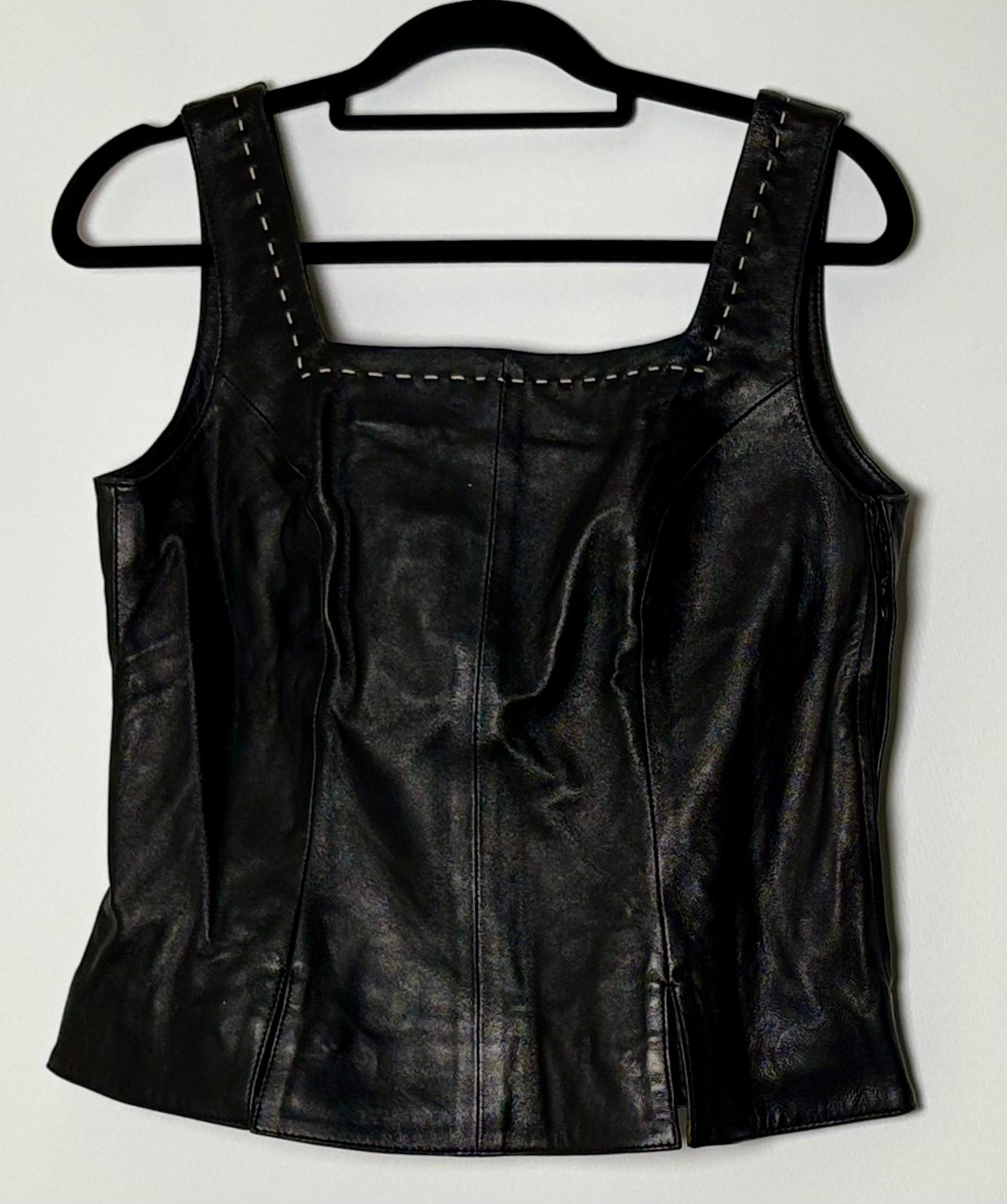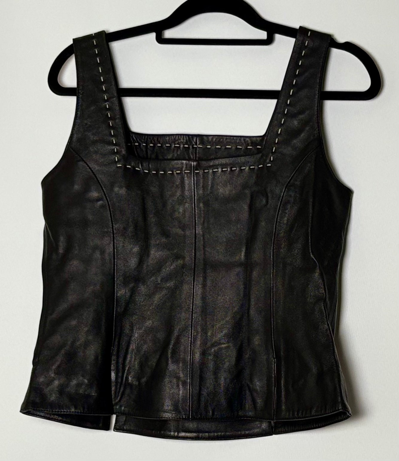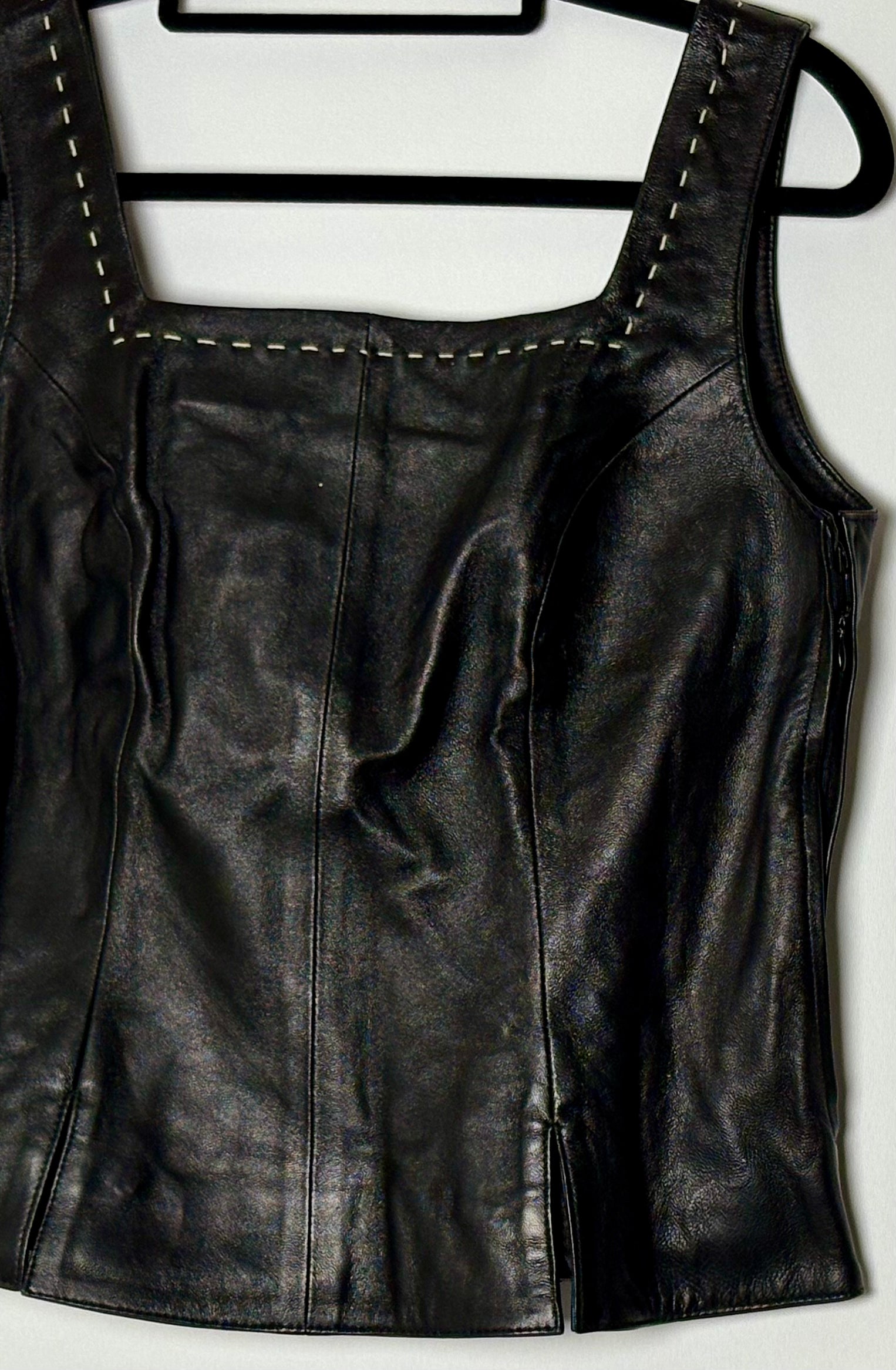 Geggjaður vintage leðurtoppur. Toppurinn er ermalaus, stuttur með kassalaga hálsmáli. Rennilás á hlið til að auðvelda að kláða sig í og úr.