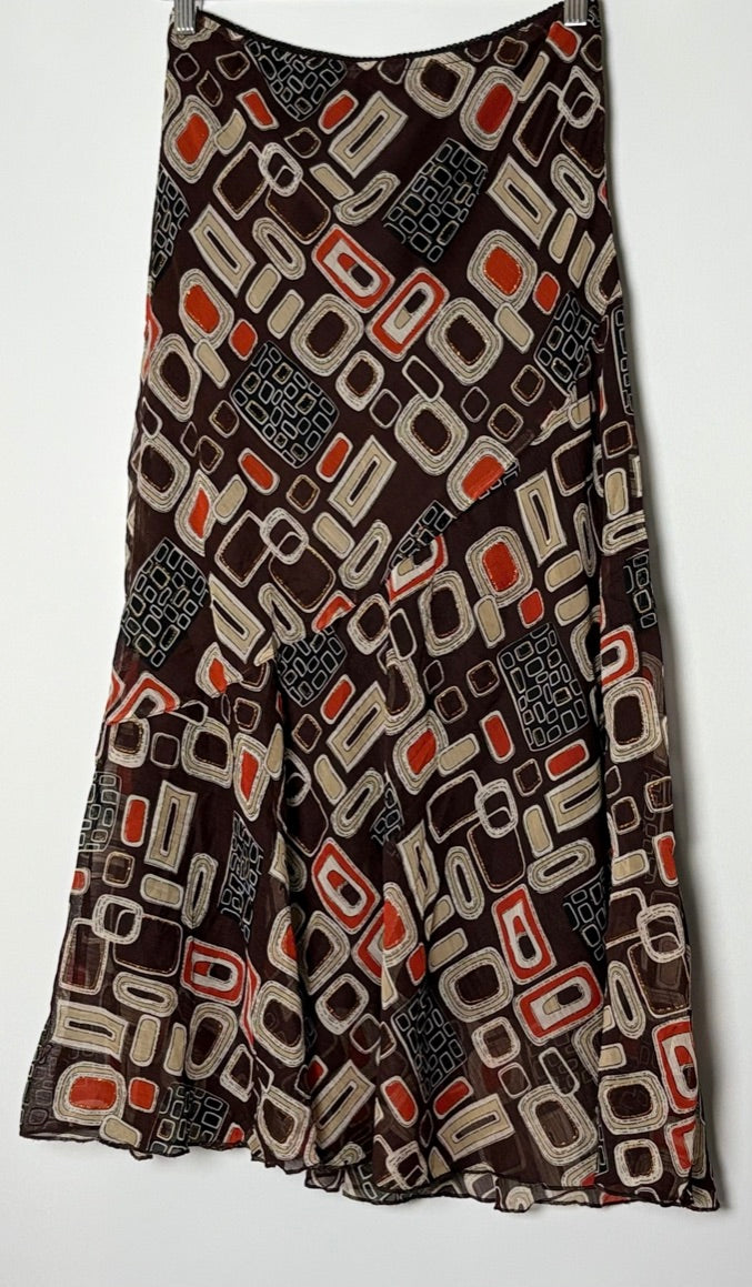Y2K pils með afar skemmtilegu og einstöku munstri. Pilsið er í midi lengd og með teygju í mitti.