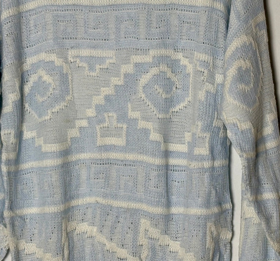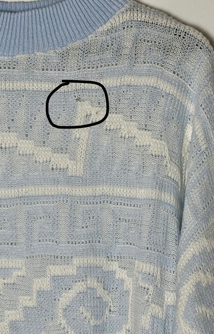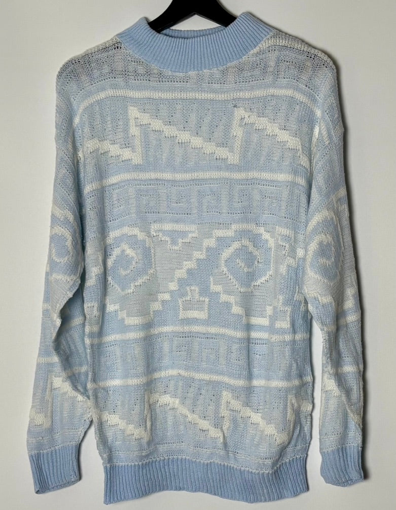 Vintage þunn peysa í flottum ljósbláum lit og með geometrískum munstri. Peysan mer með háu hálsmáli og nær niður fyrir rass.