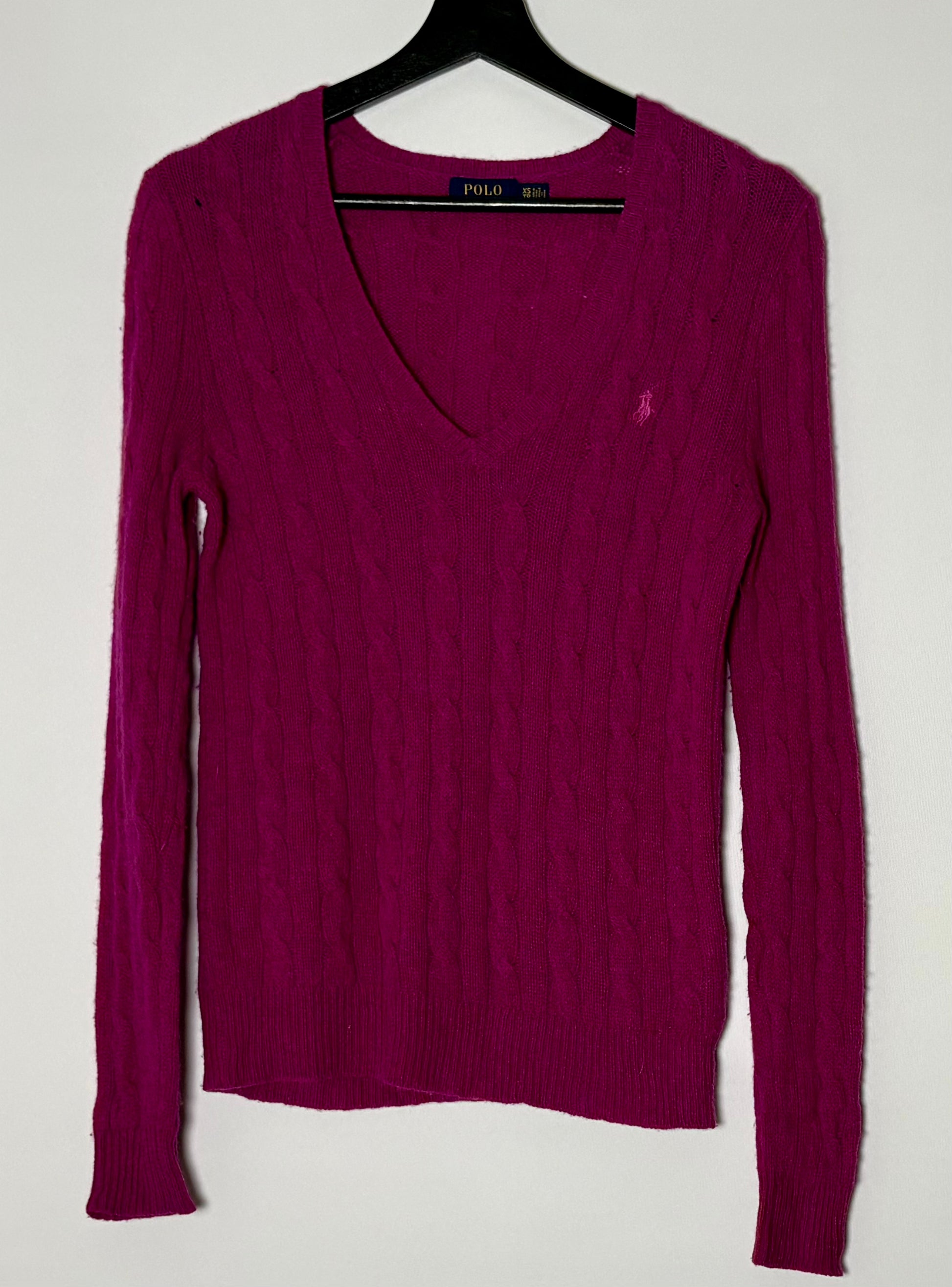 Vintage Polo Ralph Lauren peysa. Peysan er í fallegum bleikum lit með djúpu v-hálsmáli. Merkt stærð XS, venjuleg stærð.