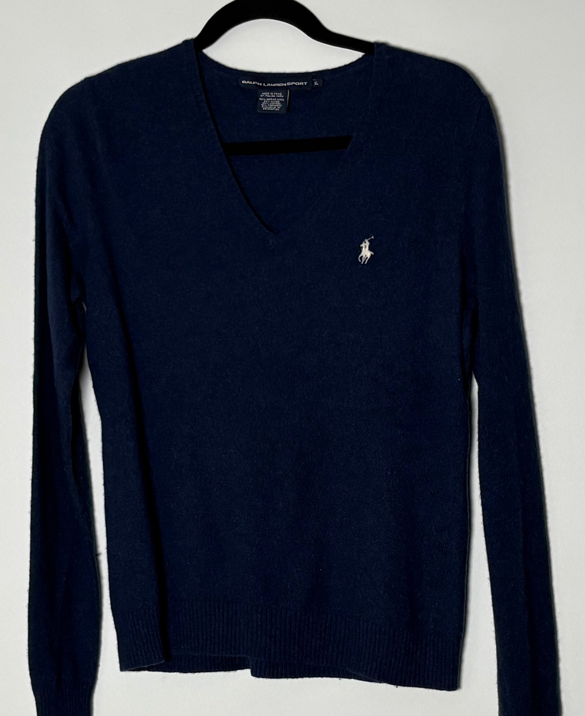 Klassísk vintage peysa frá Ralph Lauren Sport. Peysan er dökkblá með hvítu Polo merki og með v-hálsmáli.
