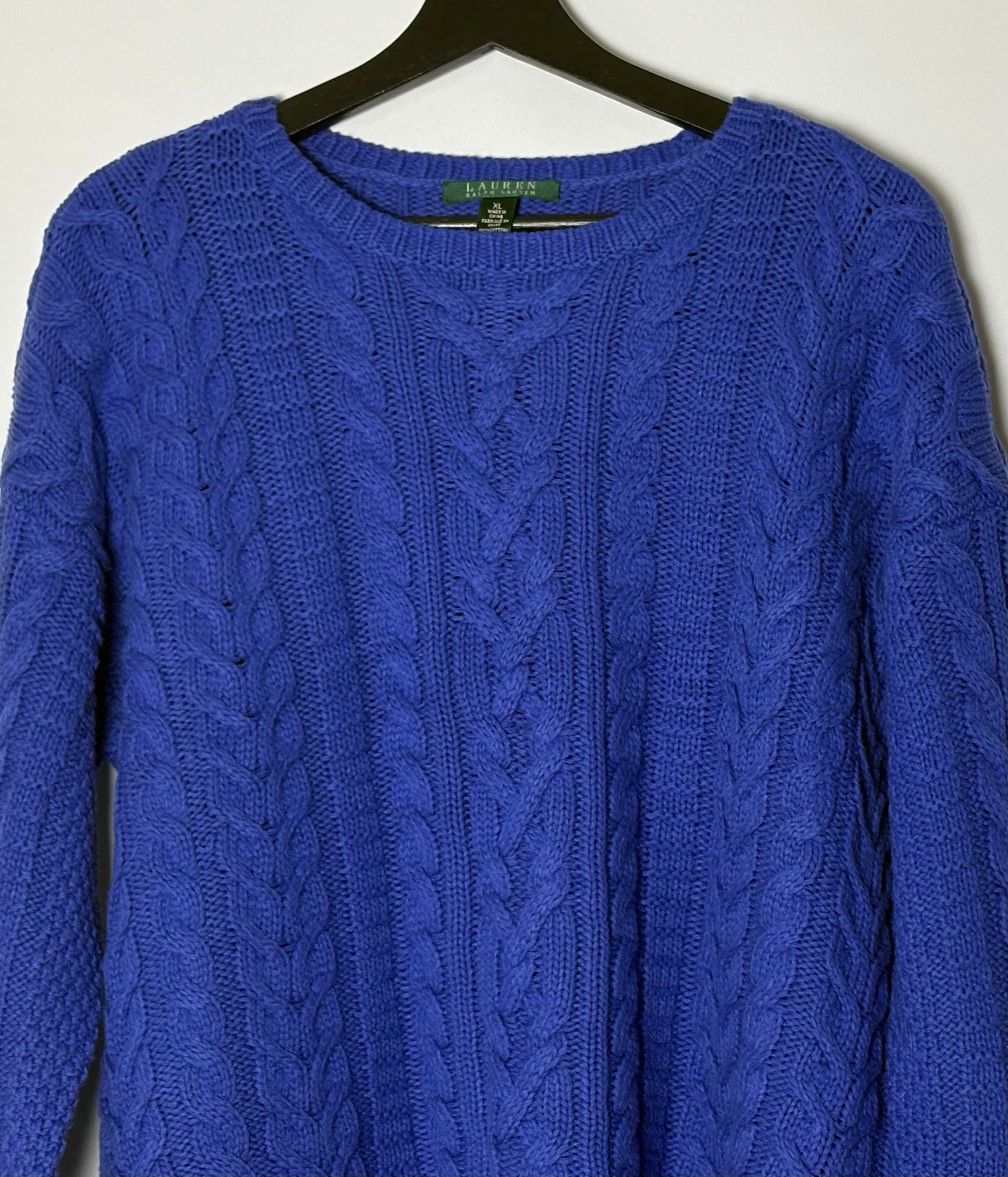 Vintage kaðlapeysa frá risa tískuhúsinu Ralph Lauren. Peysan er í fallegum bláum lit.