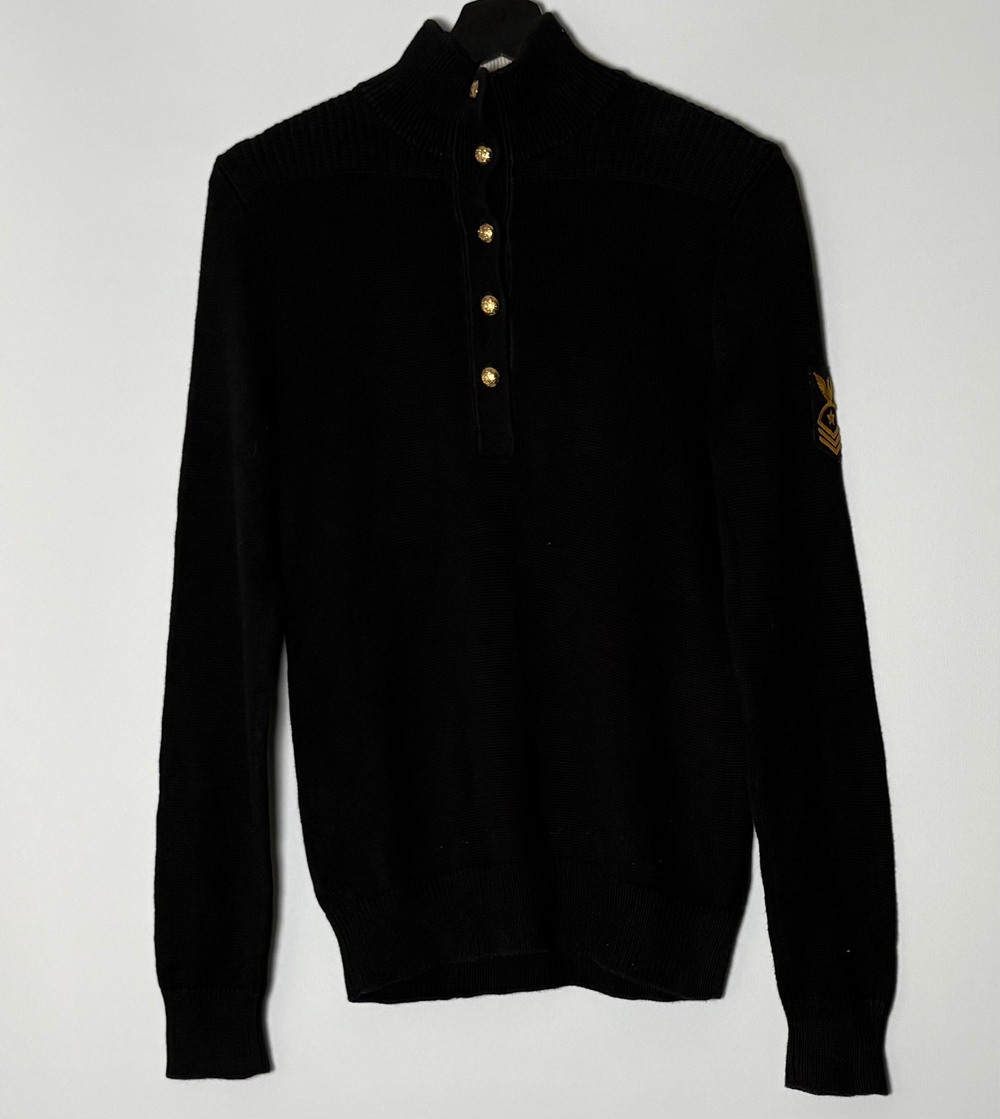 Vintage Y2K peysa frá Ralph Lauren. Peysan er svört með fallegum gylltum tölum sem hneppast hálfa leið niður.