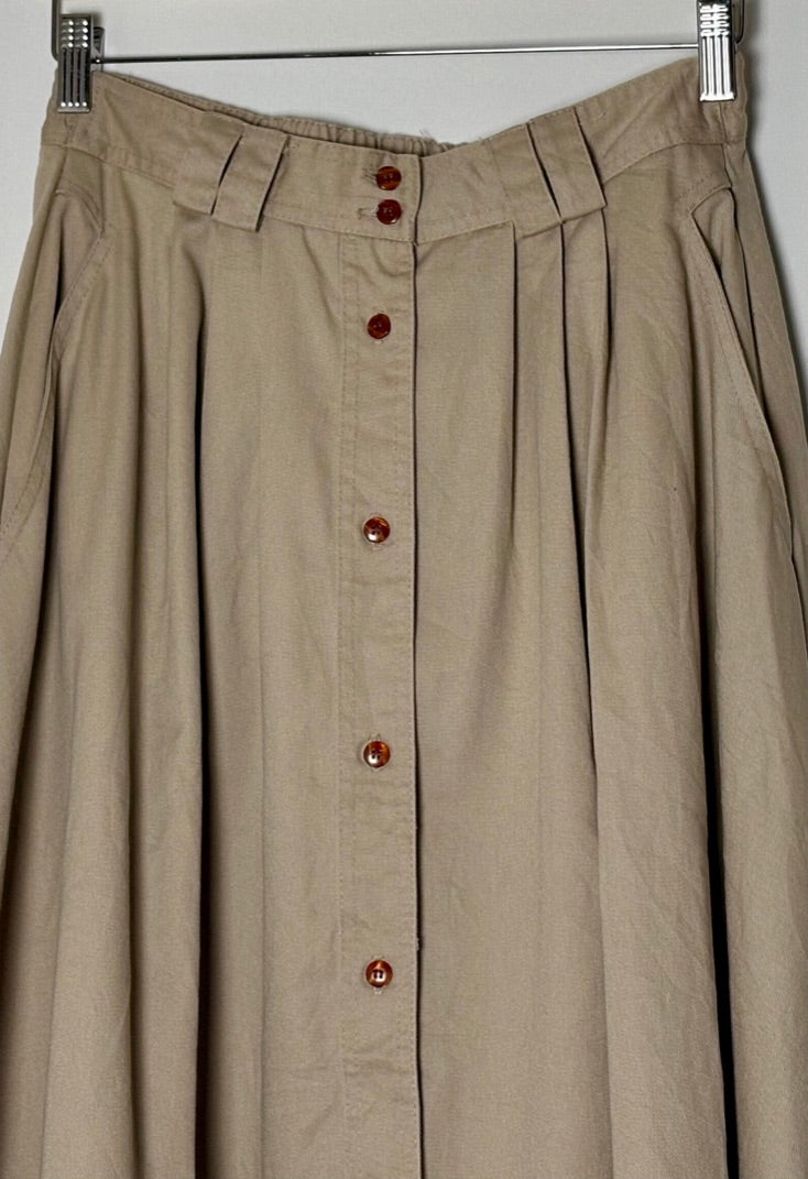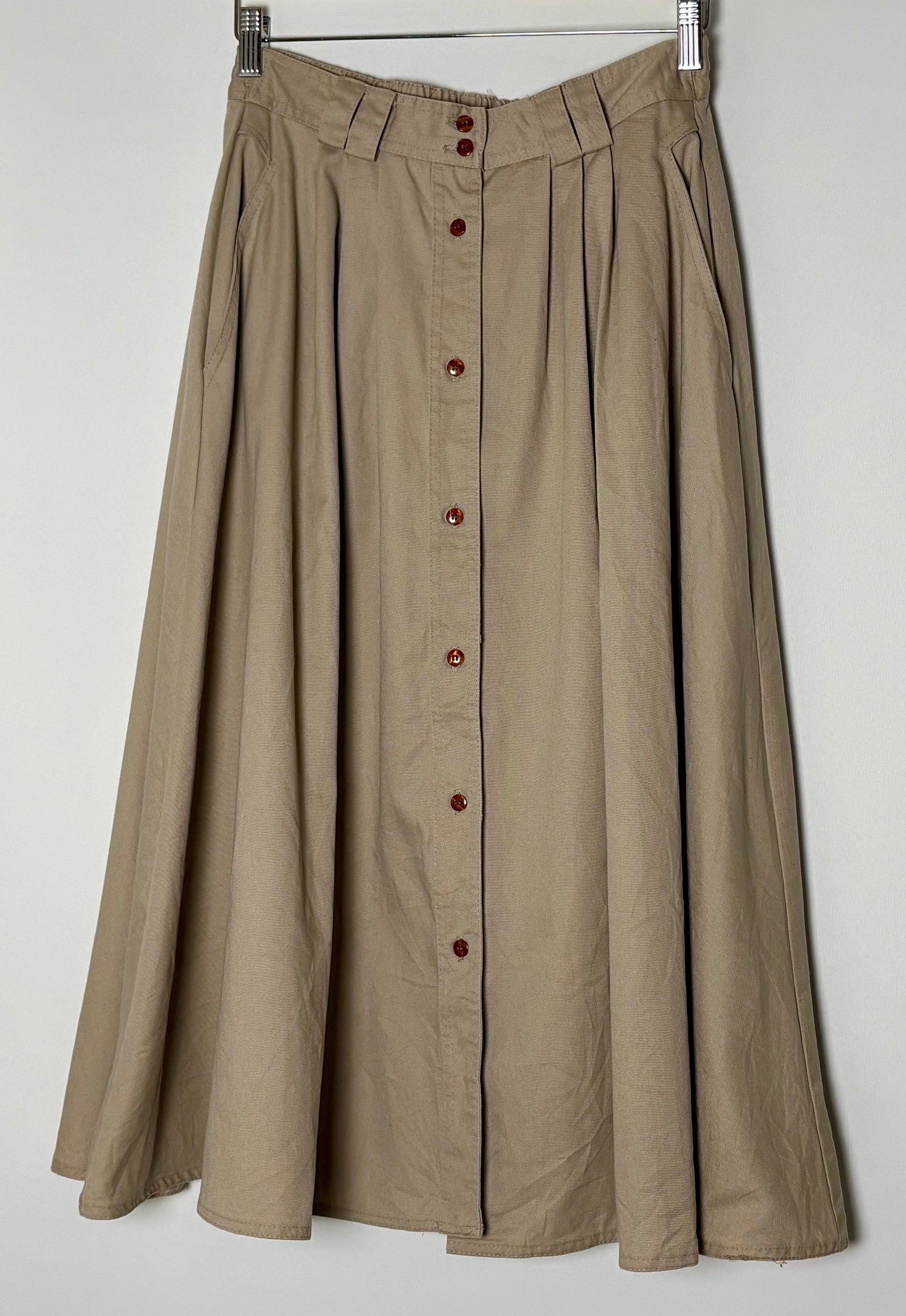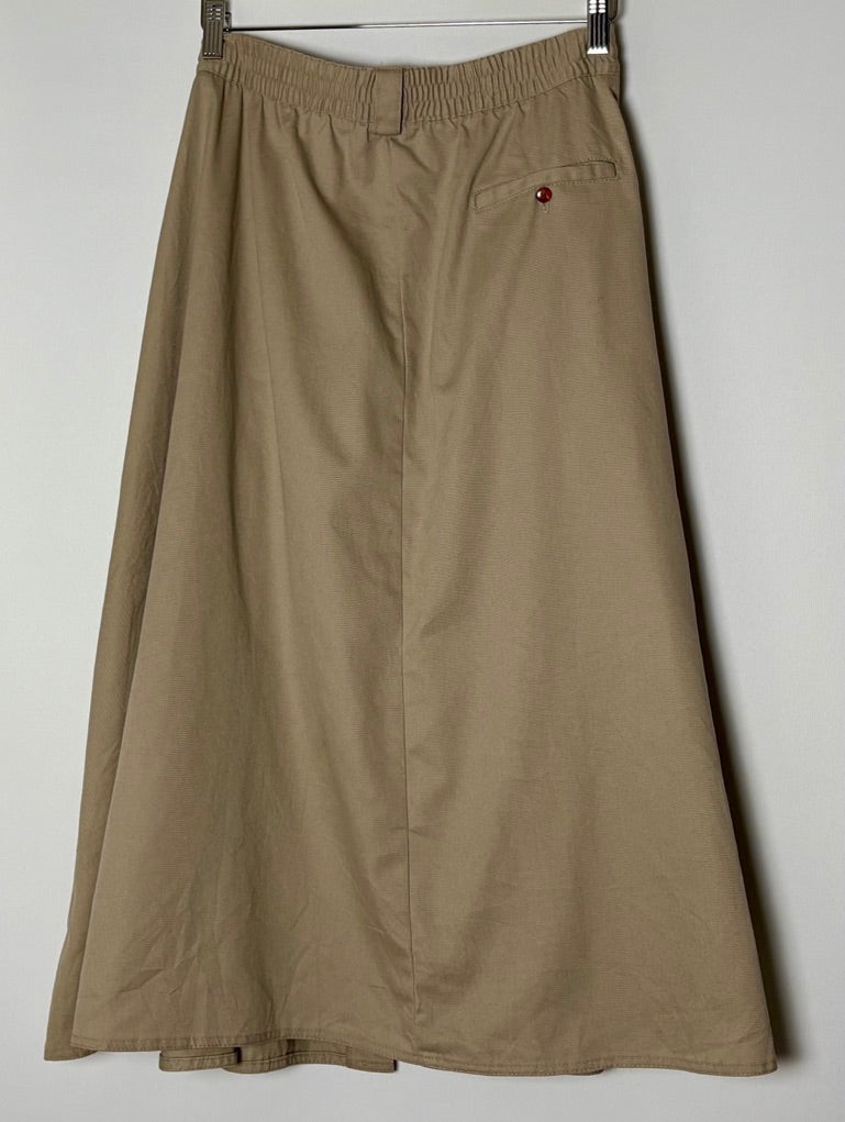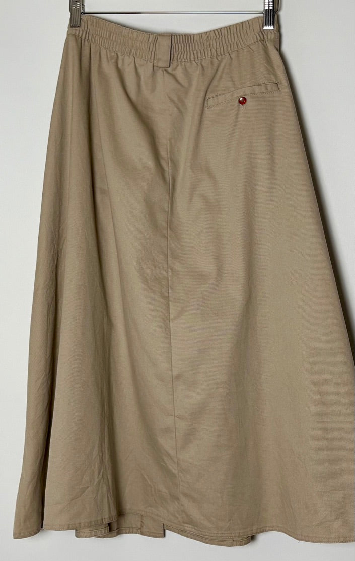 Vintage pils frá Eddie Haggar merkinu. Pilsið nær niður fyrir hné, er með teygju aftan á og tölur sem hægt er að hneppa frá alla leið framan á. Nothæfir vasar eru á pilsinu. Framleitt í Bandaríkjunum.