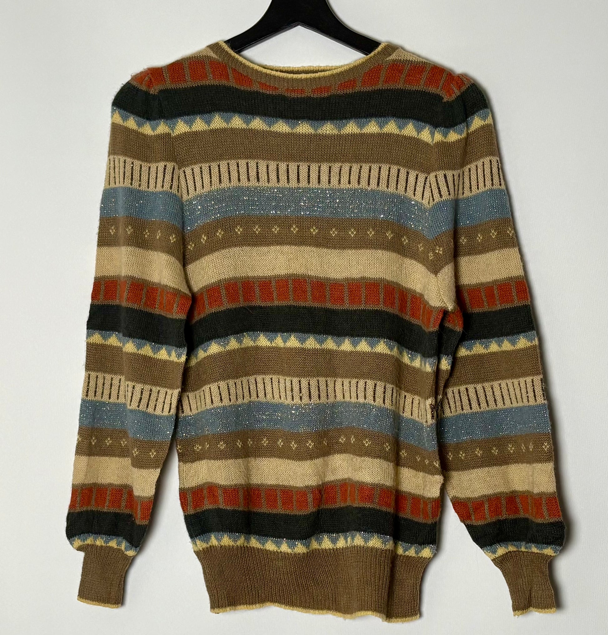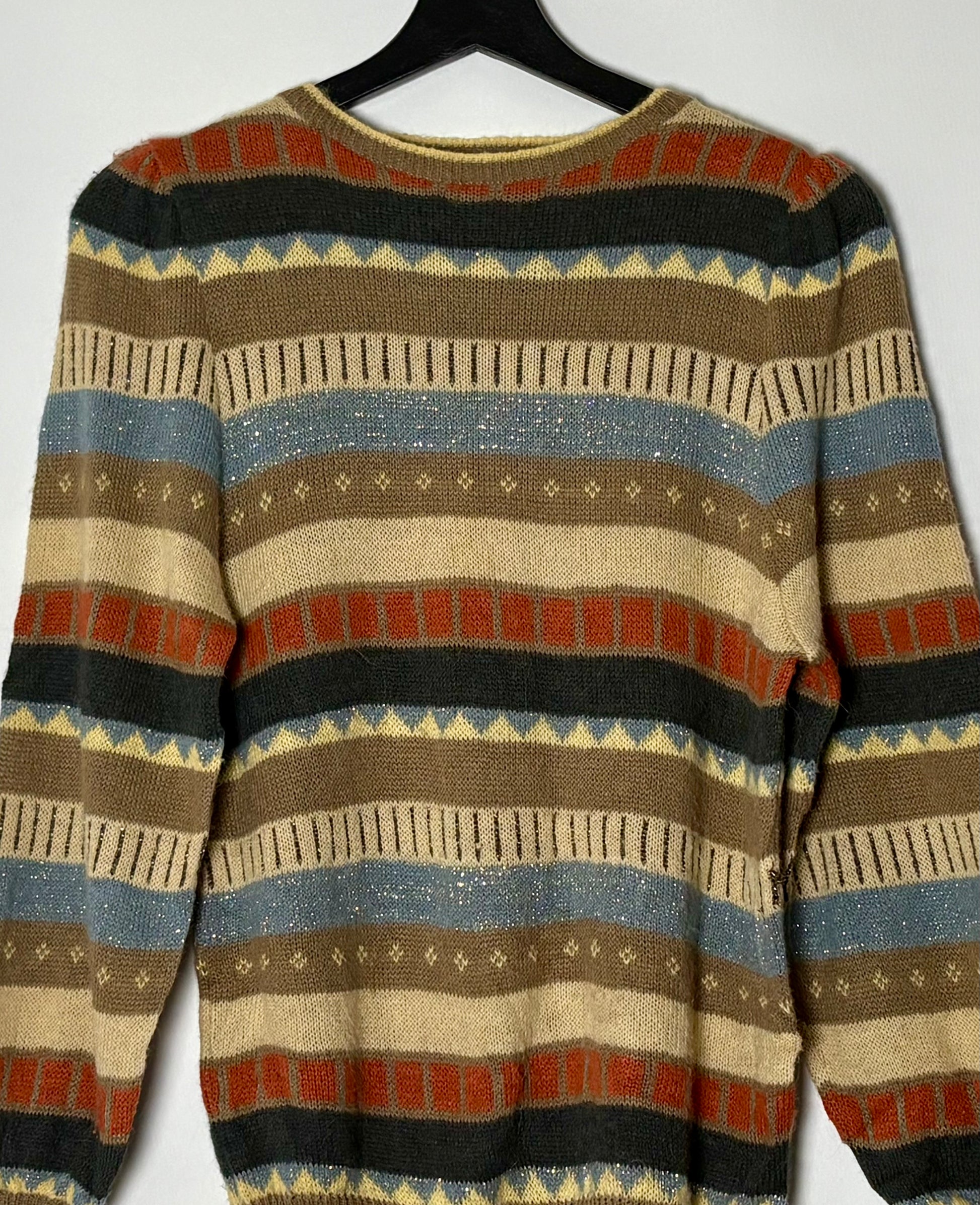 Vintage peysa með fallegu munstri. Peysan er í hlýjum litum og er m.a. saumuð með metallic þráðum.