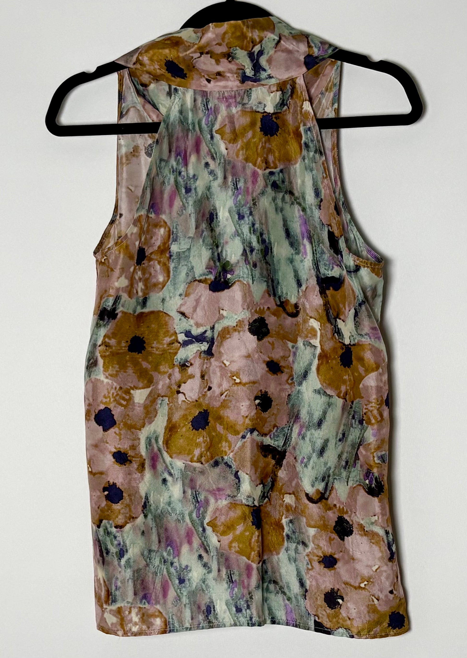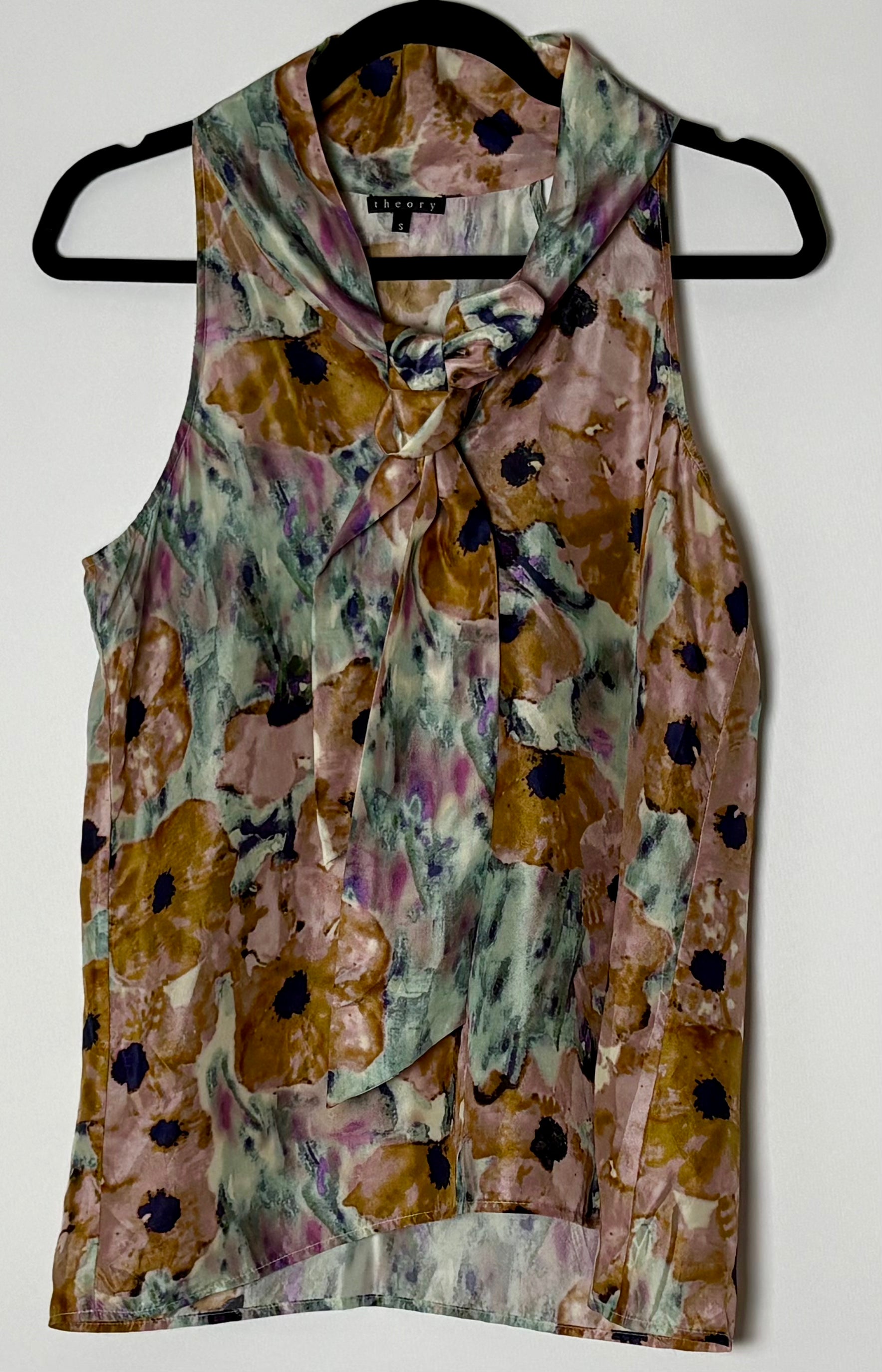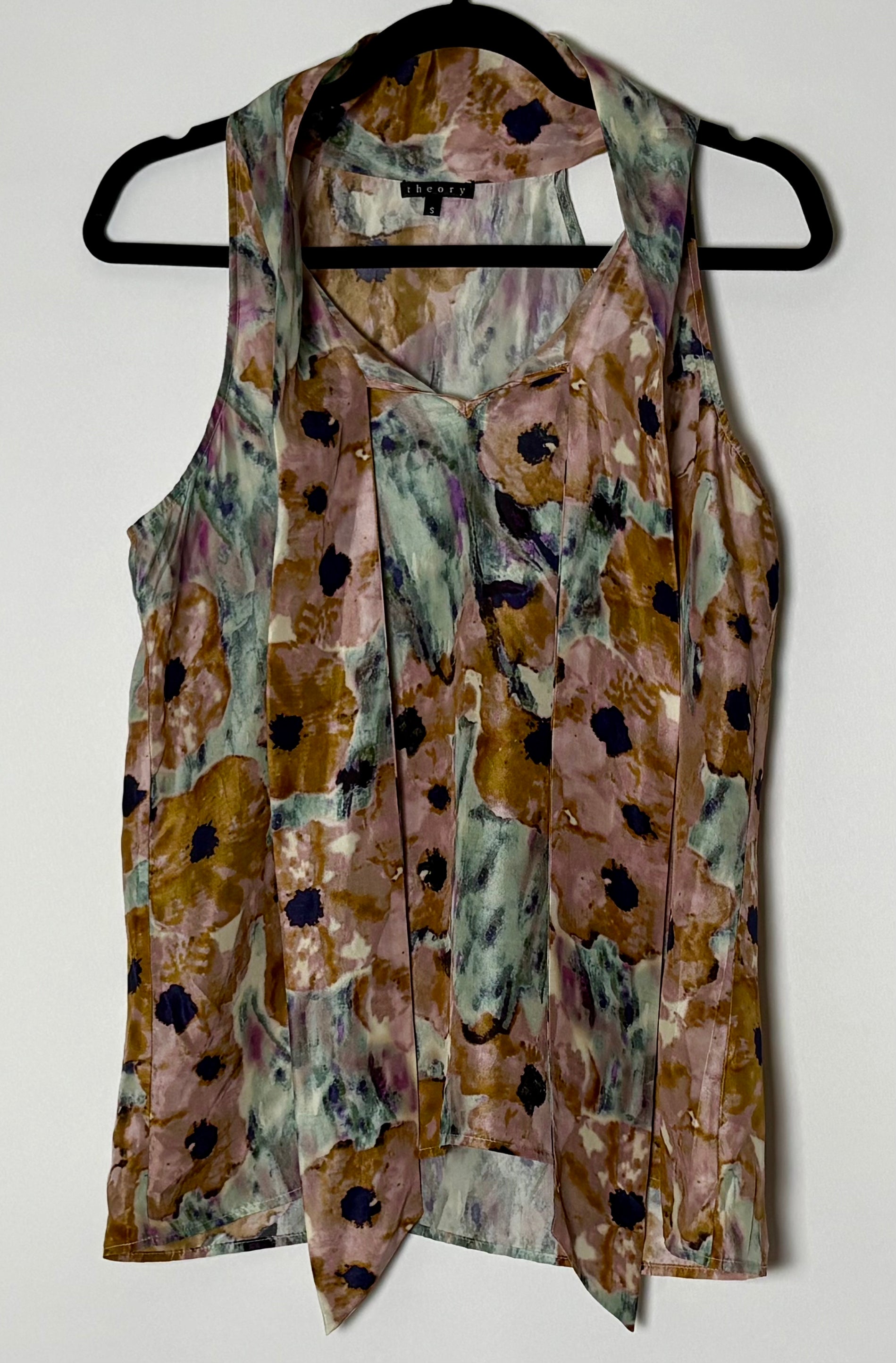 Falleg blússa frá vörumerkinu Theory. Blússan er ermalaus með líflegu blómamunstri. Hægt er að binda blússuna að framan. Einnig er möguleiki að klæðast henni öfugri.