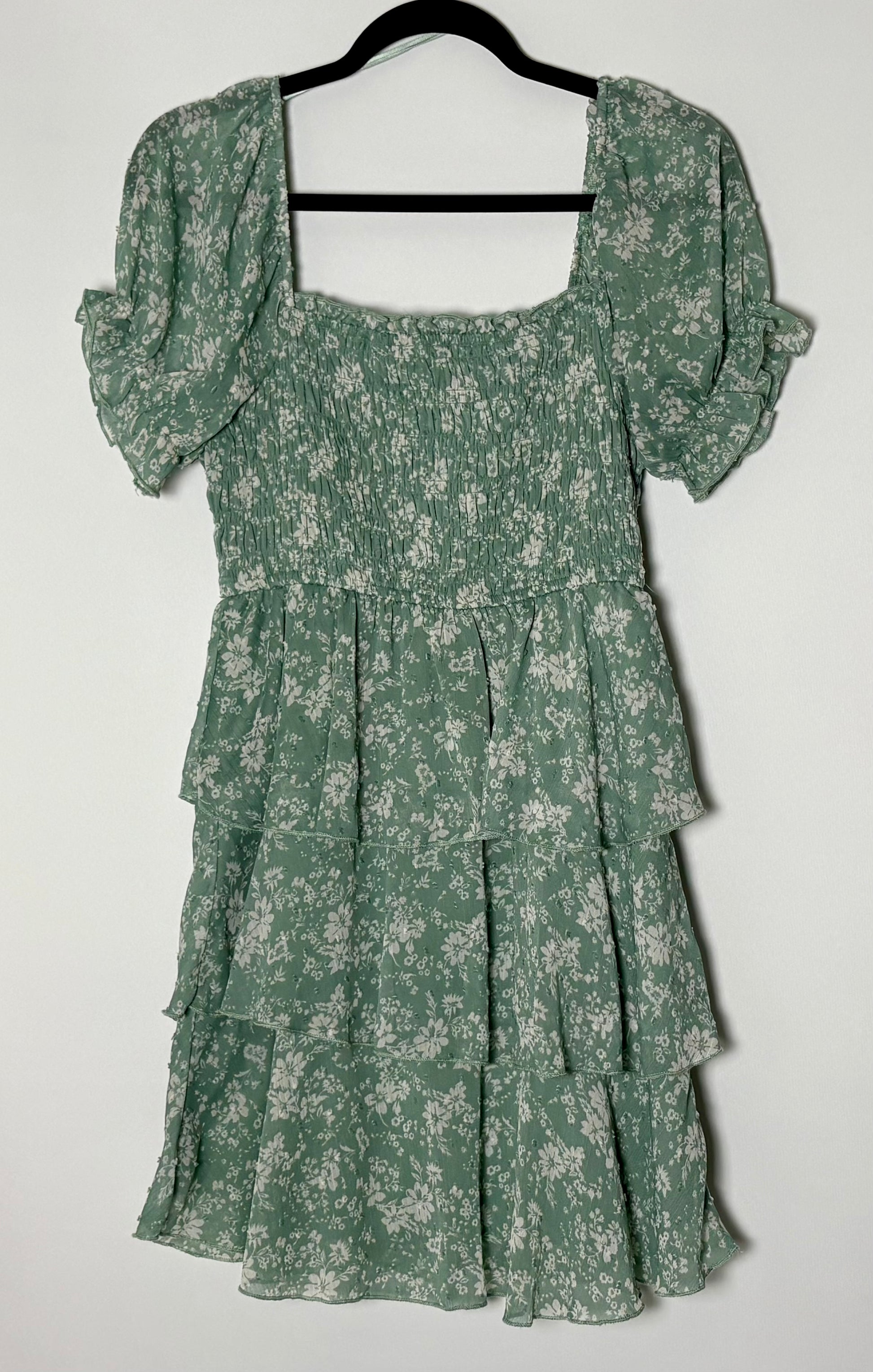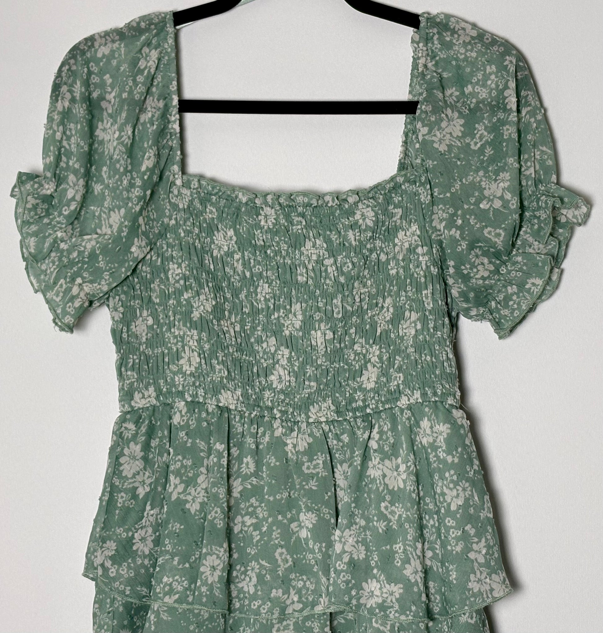 Retro sumarkjóll frá merkinu Thirty Thirty LA. Kjóllinn er með fallegu blómamunstri, gegnsæjum stuttum ermum og teygist vel yfir brjóstin.