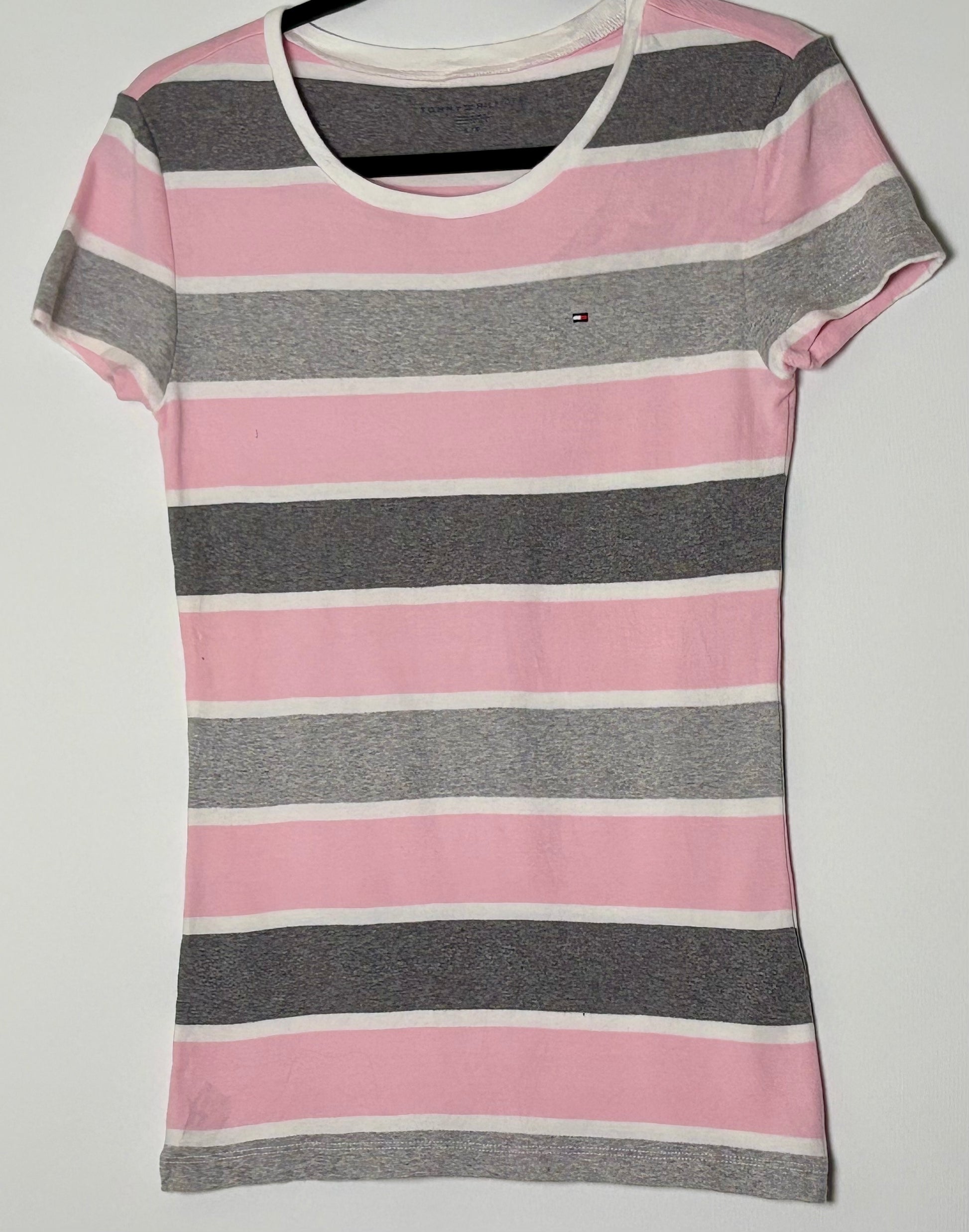 Y2K Tommy Hilfiger bolur. Bolurinn er röndóttur með þykkum ljósbleikum, gráum og mjóum hvítum röndum. Ermarnar eru stuttar. Venjulegt snið - teygja er í bolnum.
