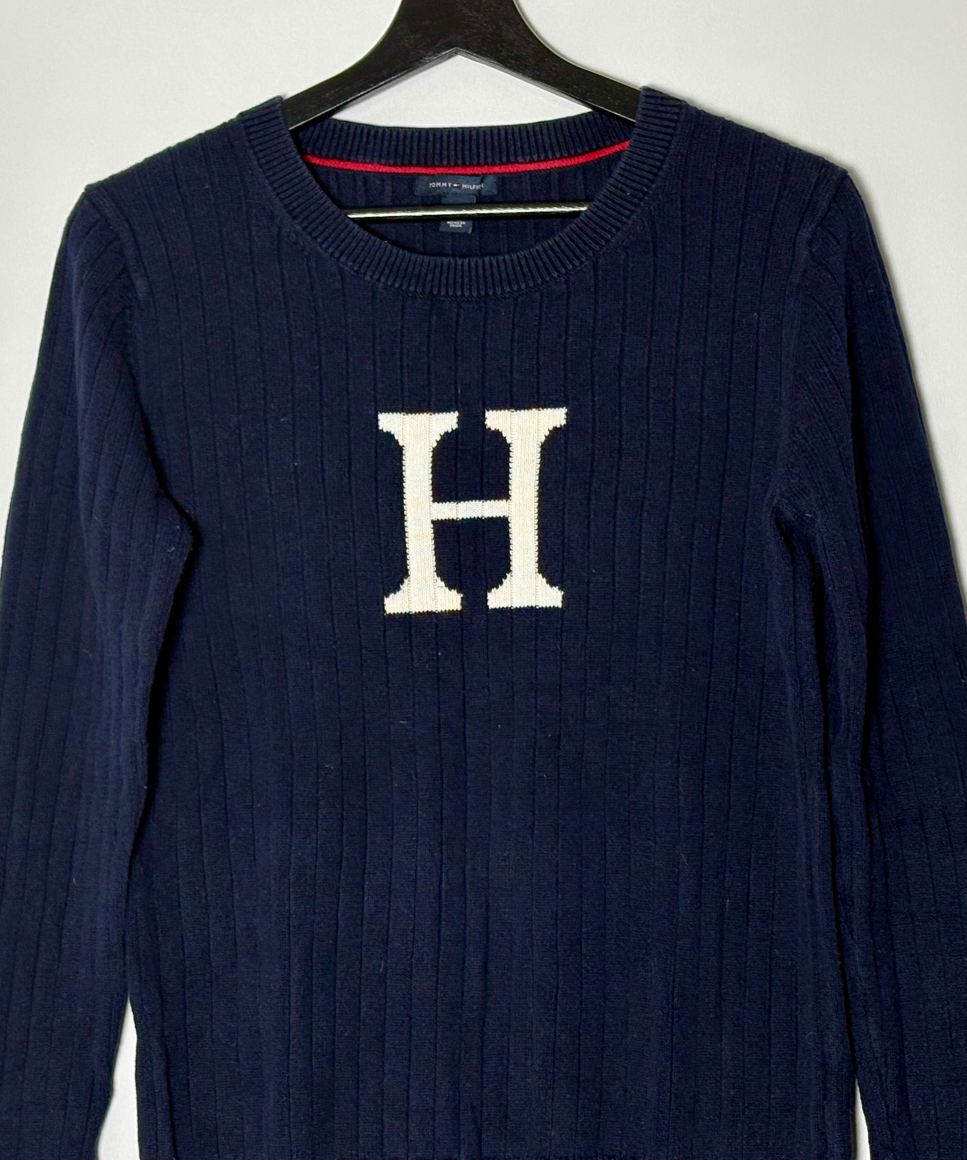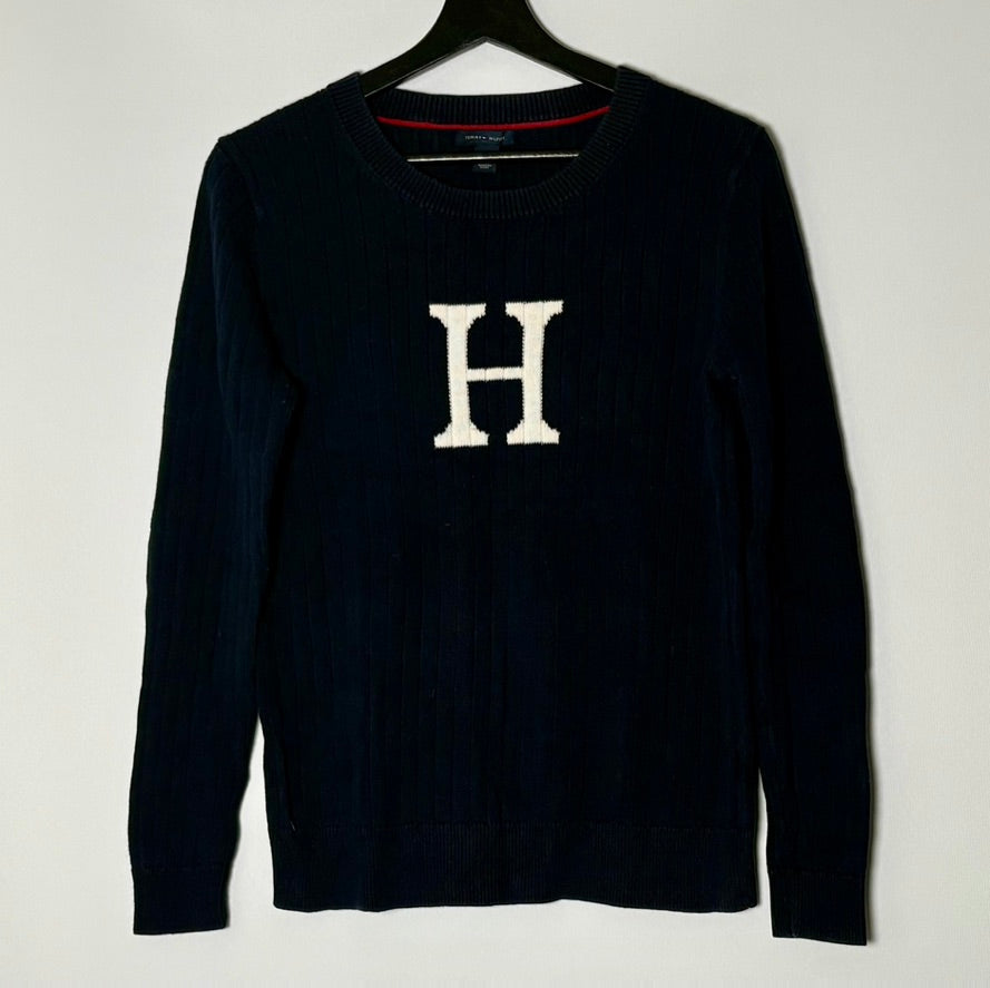 Vintage Y2k Tommy Hilfiger peysa. Peysan er dökkblá með stóru H framan á. Sniðið er venjulegt og peysan er létt og þægileg.
