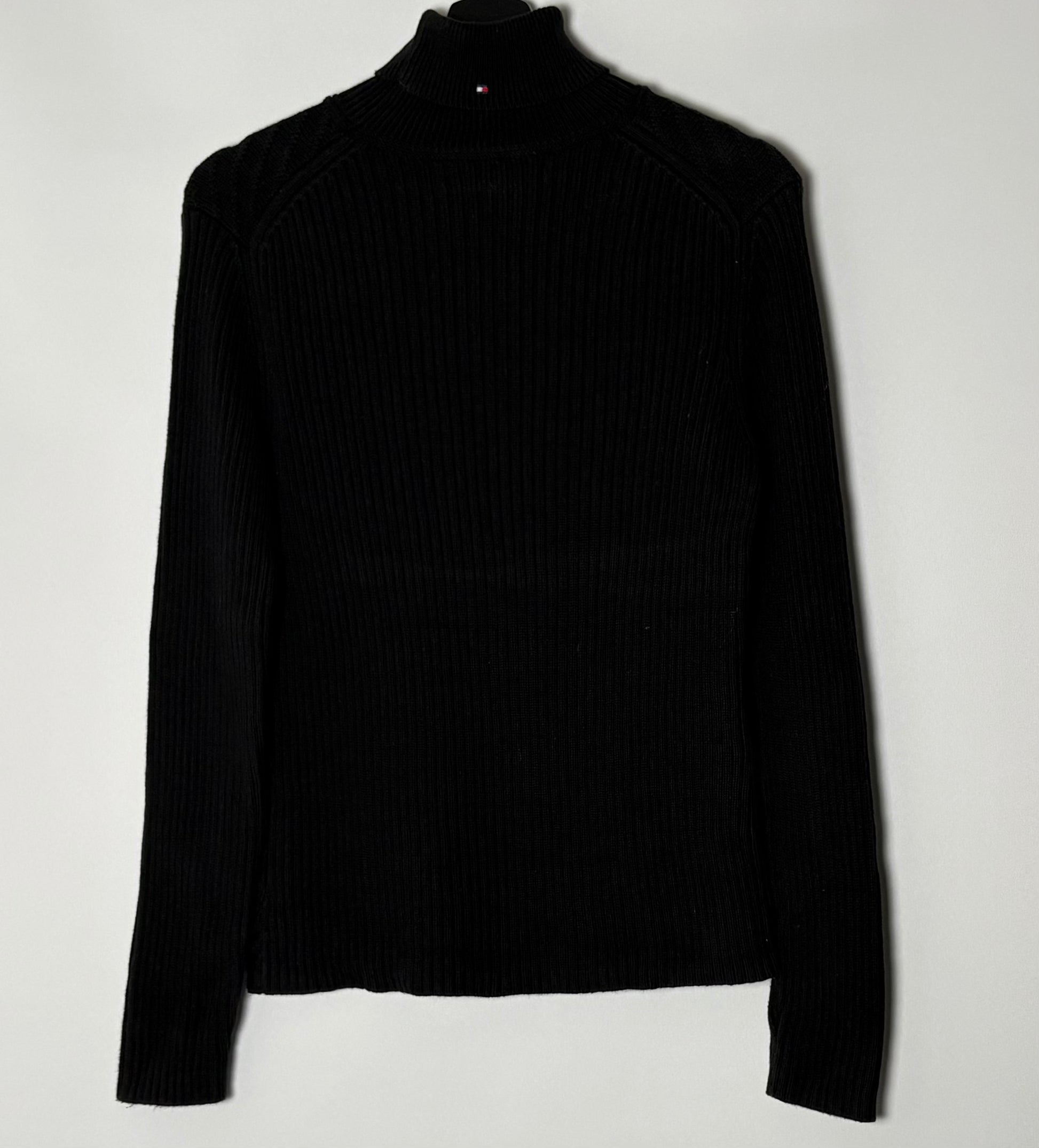 Vintage 90s Tommy Hilfiger rúllukragapeysa. Peysan er með einfalda hönnun, svört með chevron munstri. Lítið TH merki er aftan á til að gefa peysunni aðeins meiri persónuleika.