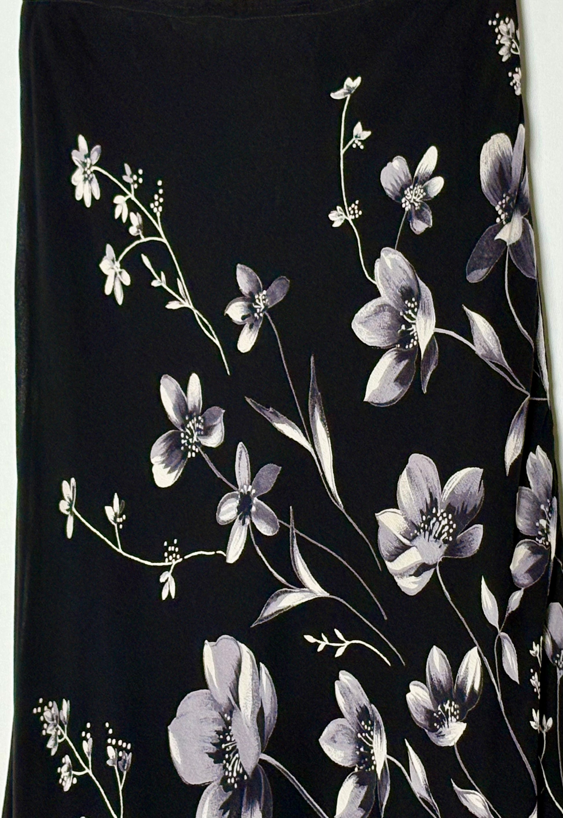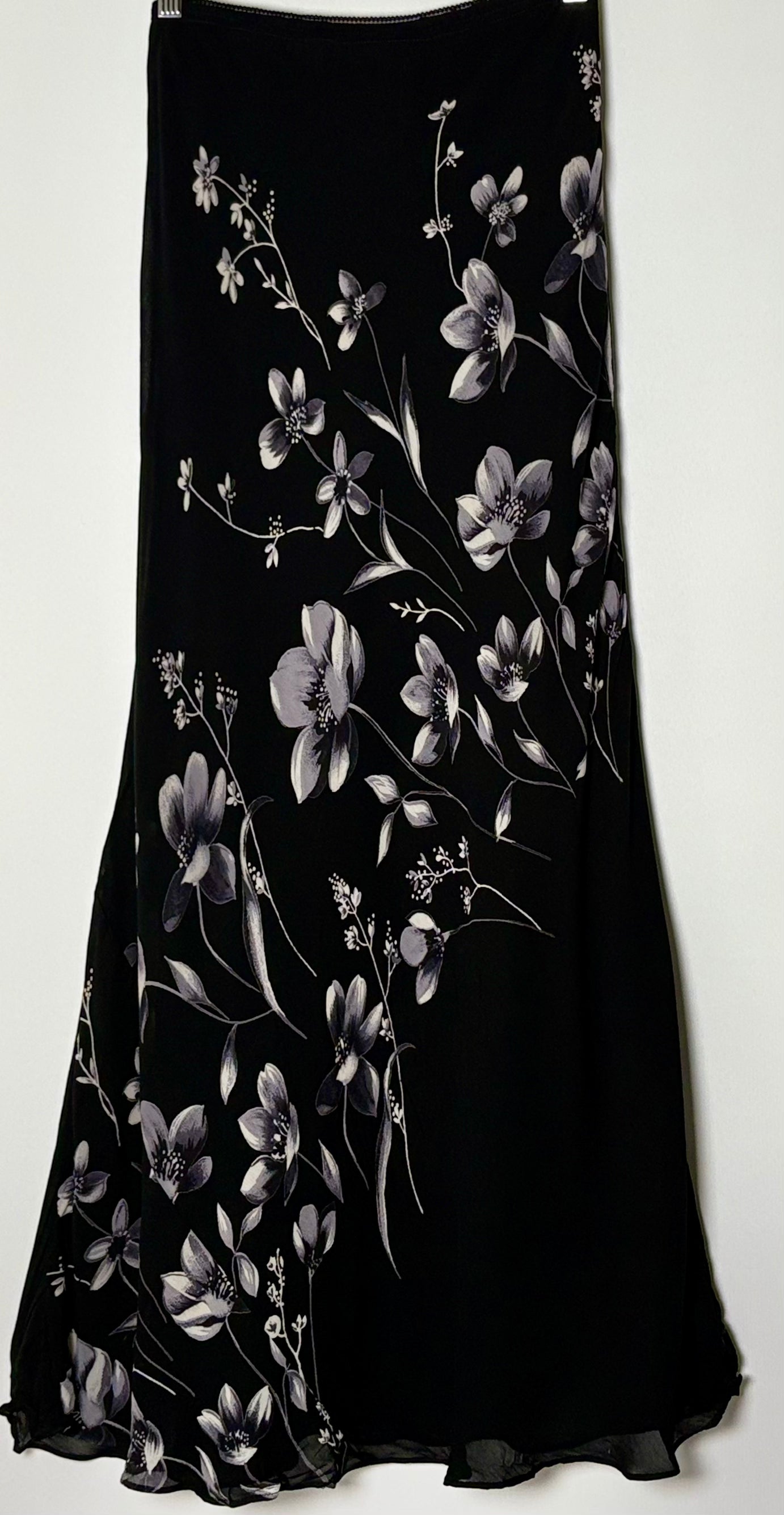 Fallegt vintage maxi pils. Pilsið er beint í sniði og með teygju í mitti. Blómamunstur er framan á pilsinu.