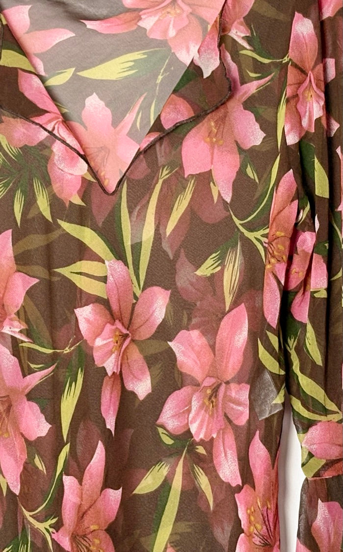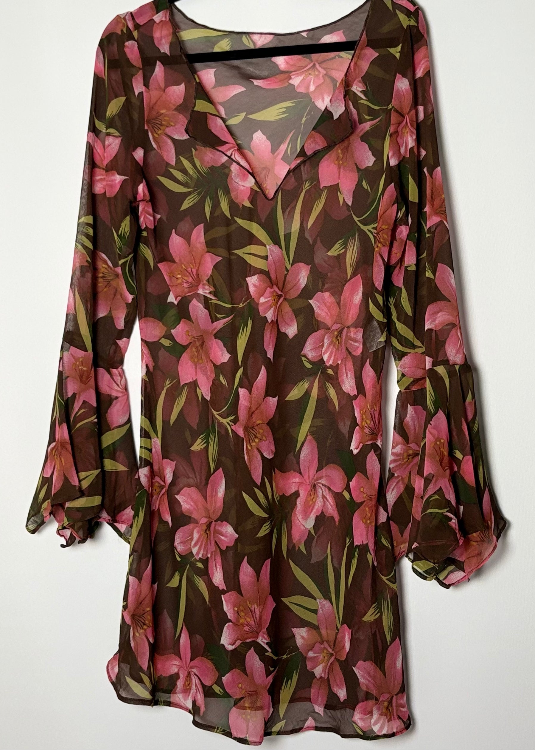 Falleg vintage túnikka með blómamunstri. Túnikkan er með v-hálsmáli og síðum útvíðum ermum. Efnið er þunnt og gegnsætt. Hefðbundið snið.