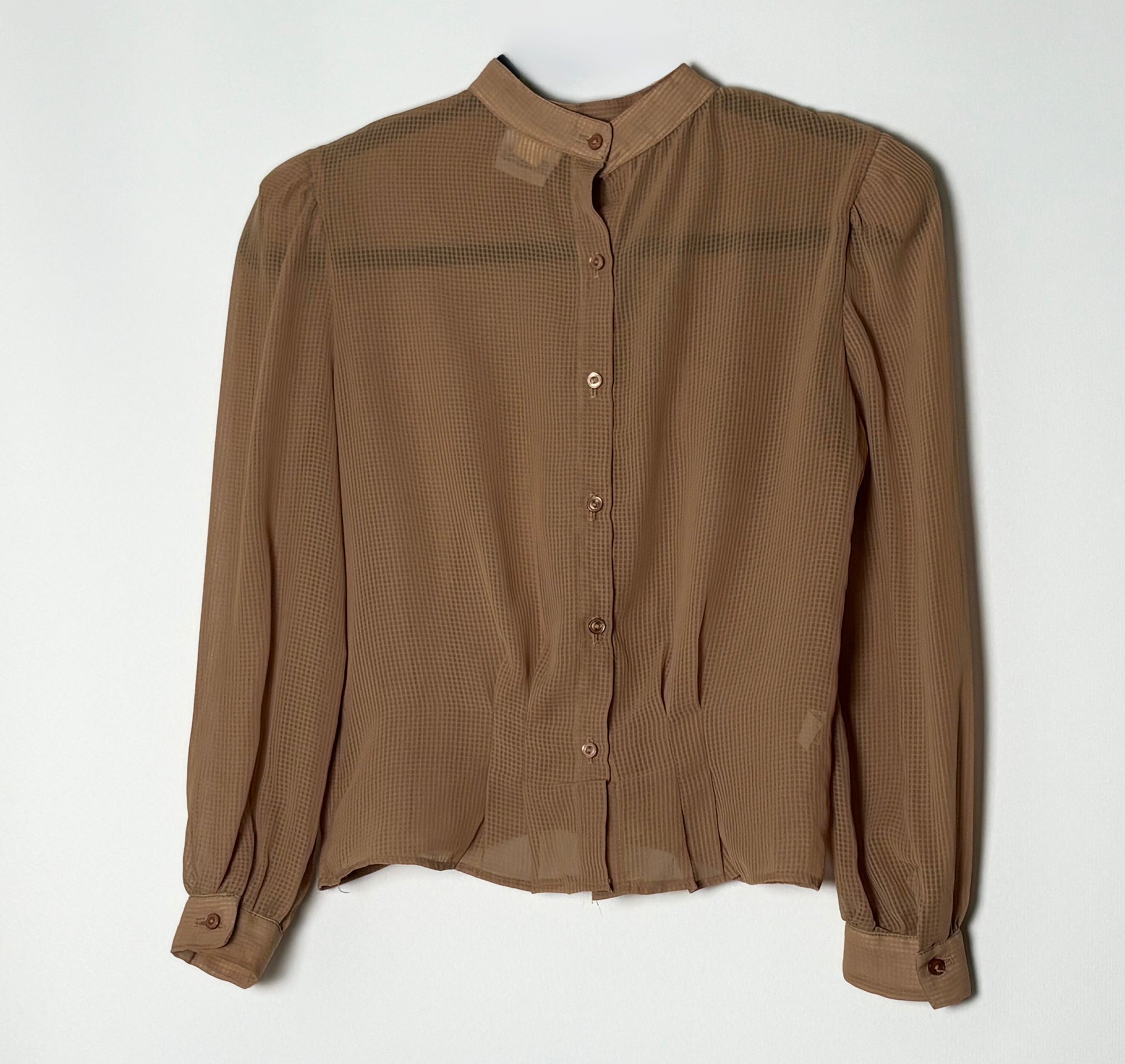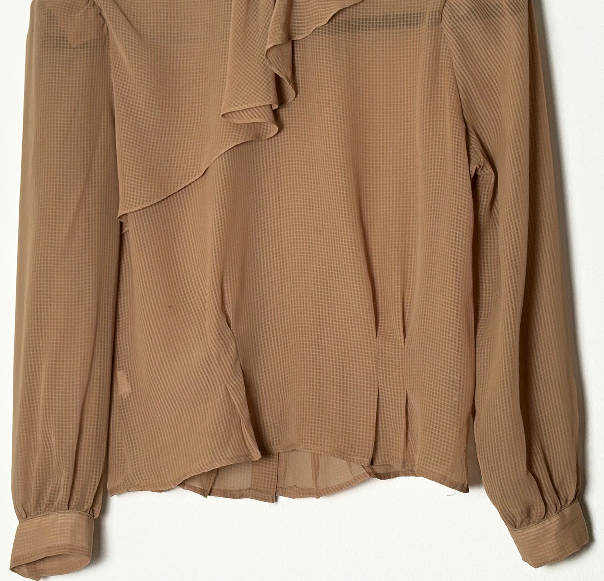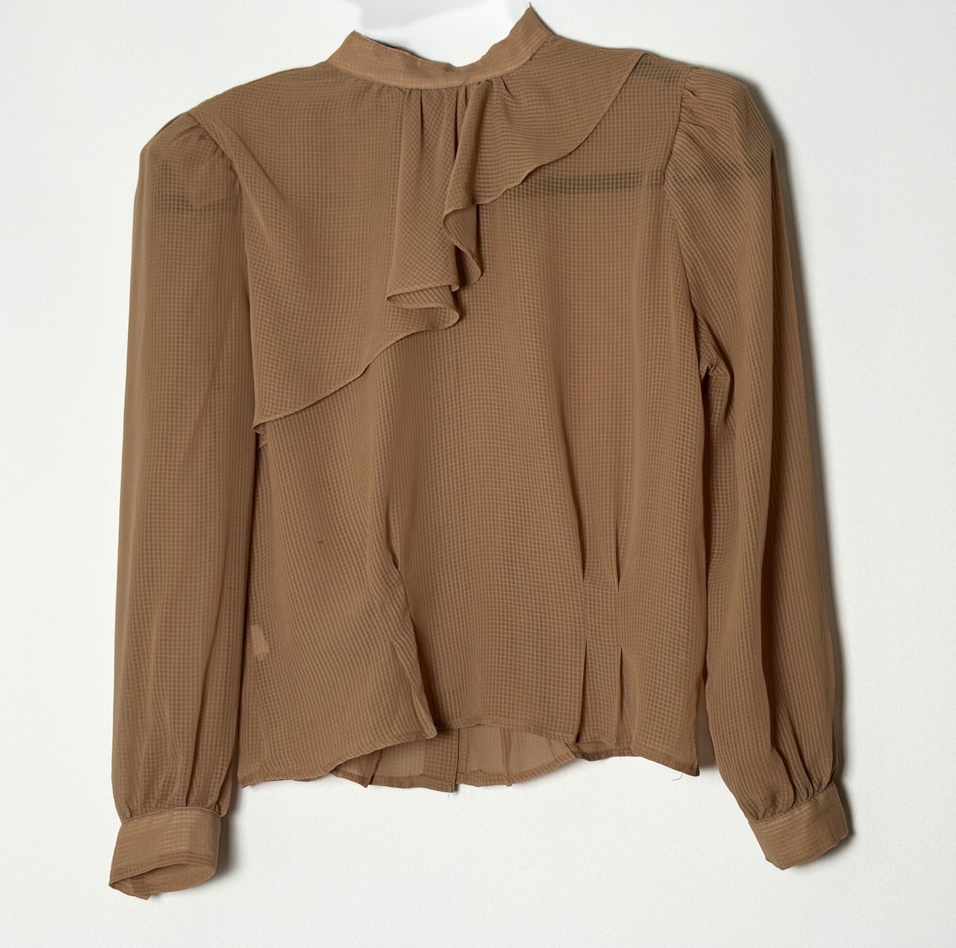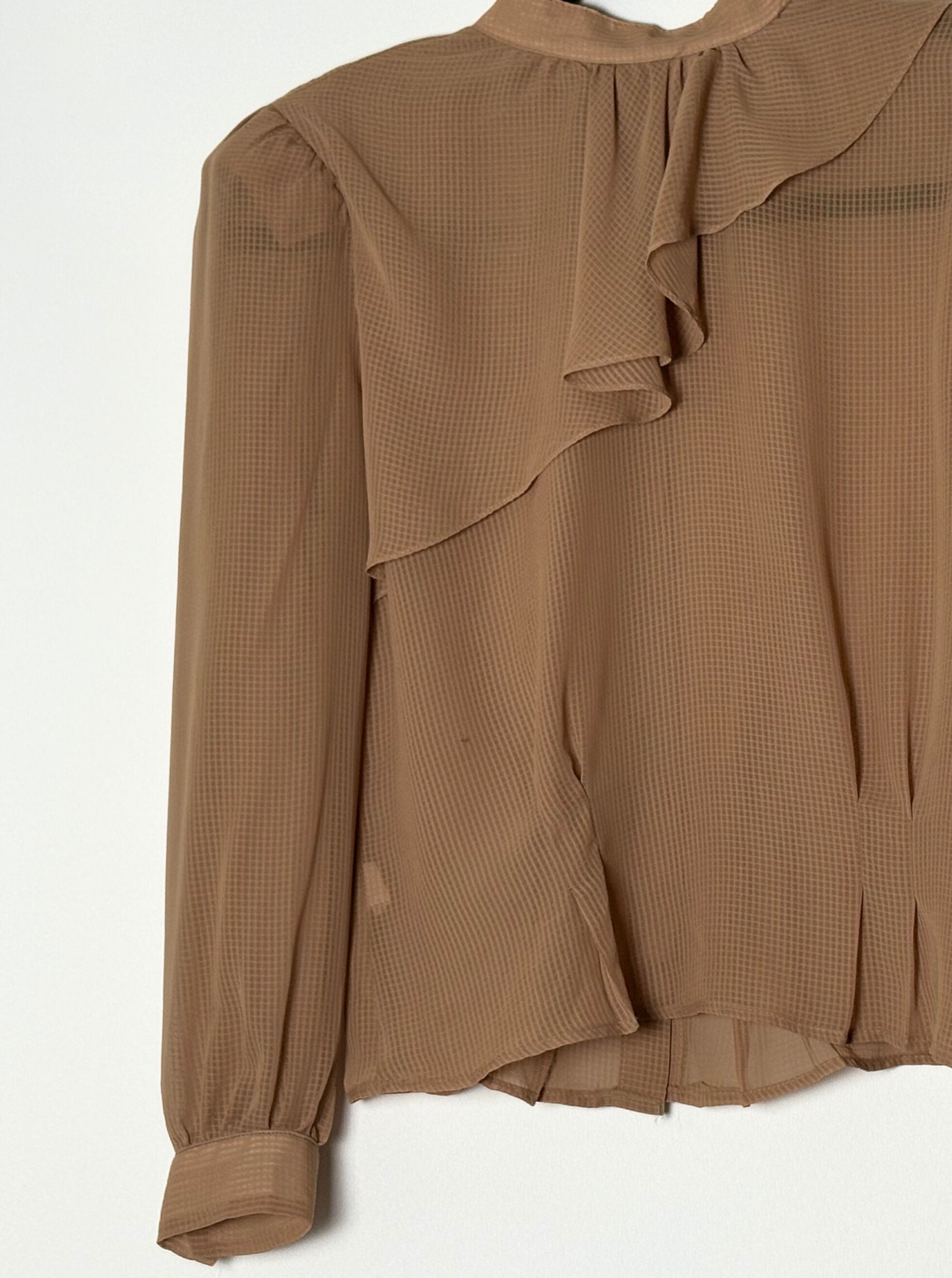 Falleg vintage blússa með pífu framan á. Blússan er úr gegnsæju efni og með tölum aftan á. Aðsniðin til að undirstrika mittið. Framleidd í Bandaríkjunum.