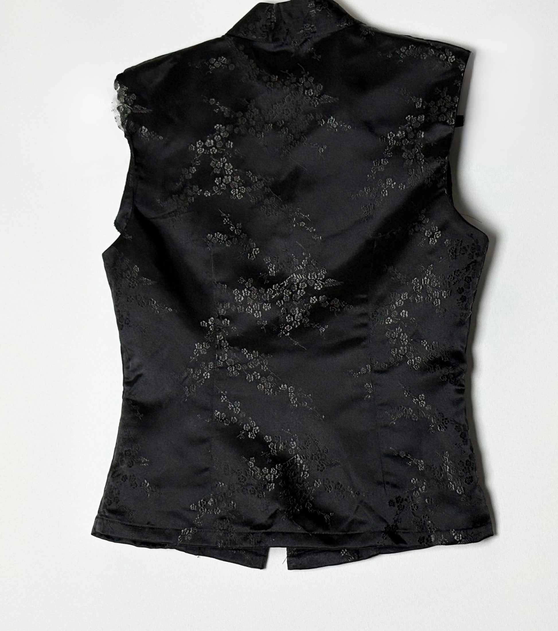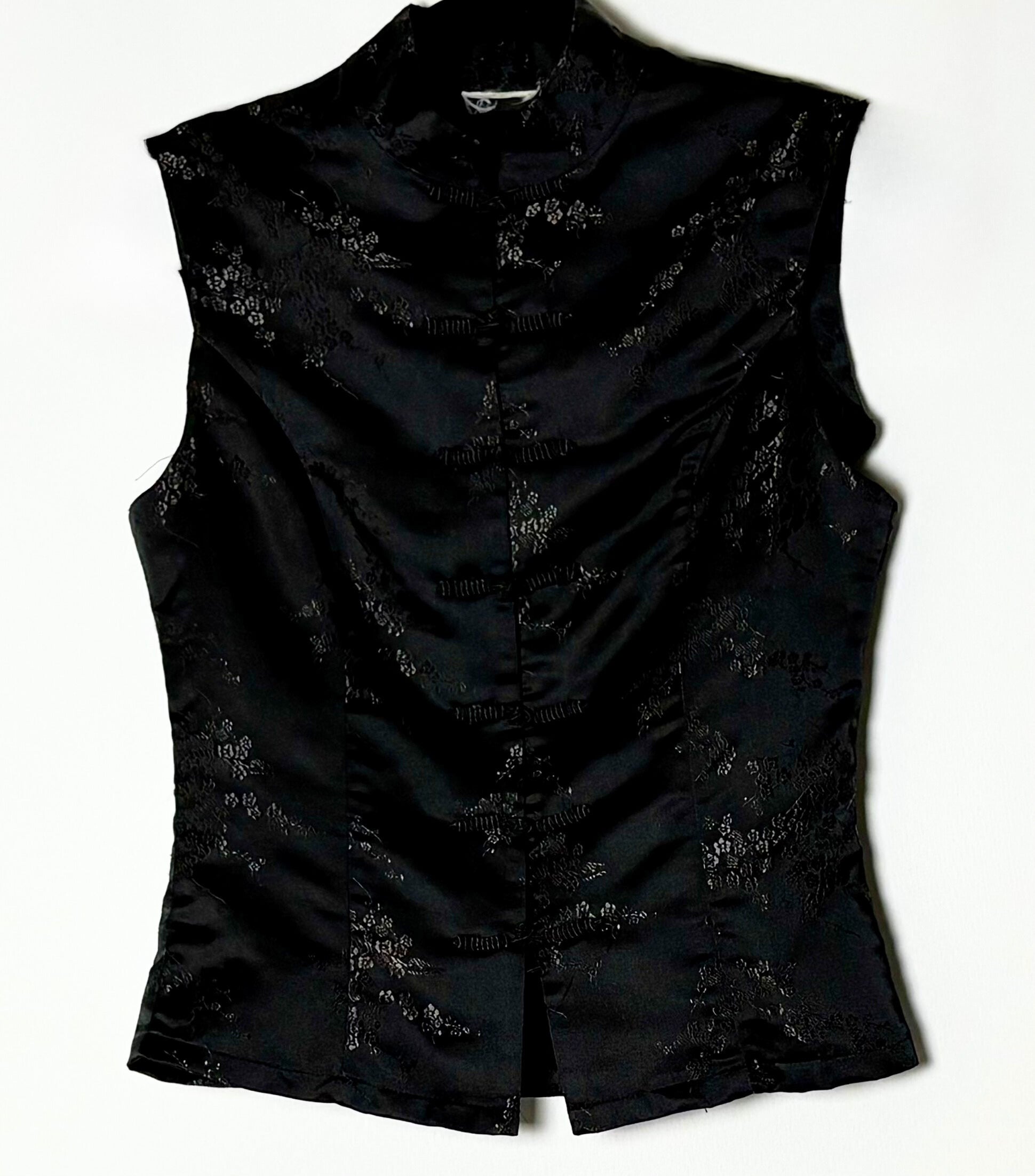 Falleg vintage blússa með blómamunstri. Blússan hneppist að framan og er með háu hálsmáli. Hún er aðsniðin.