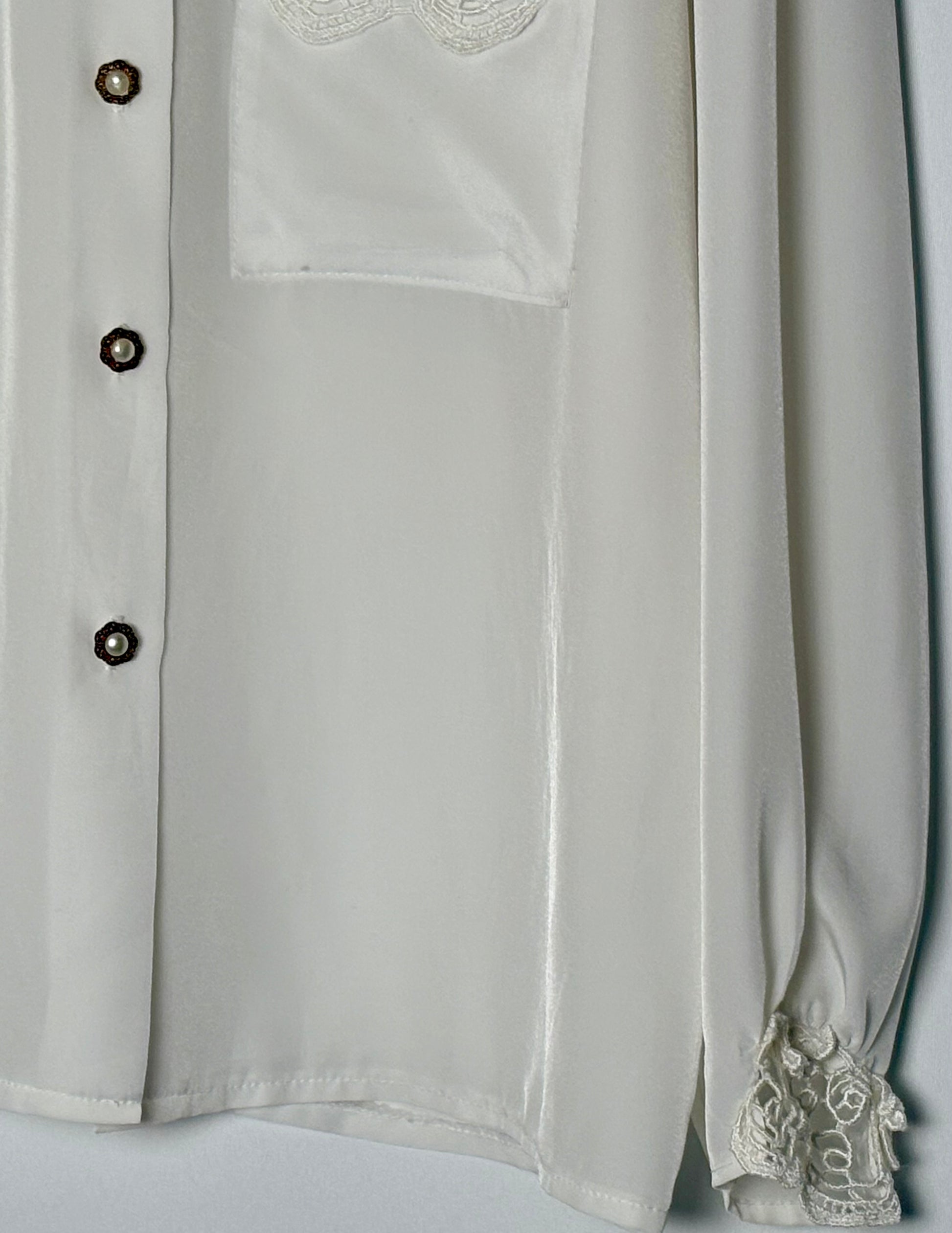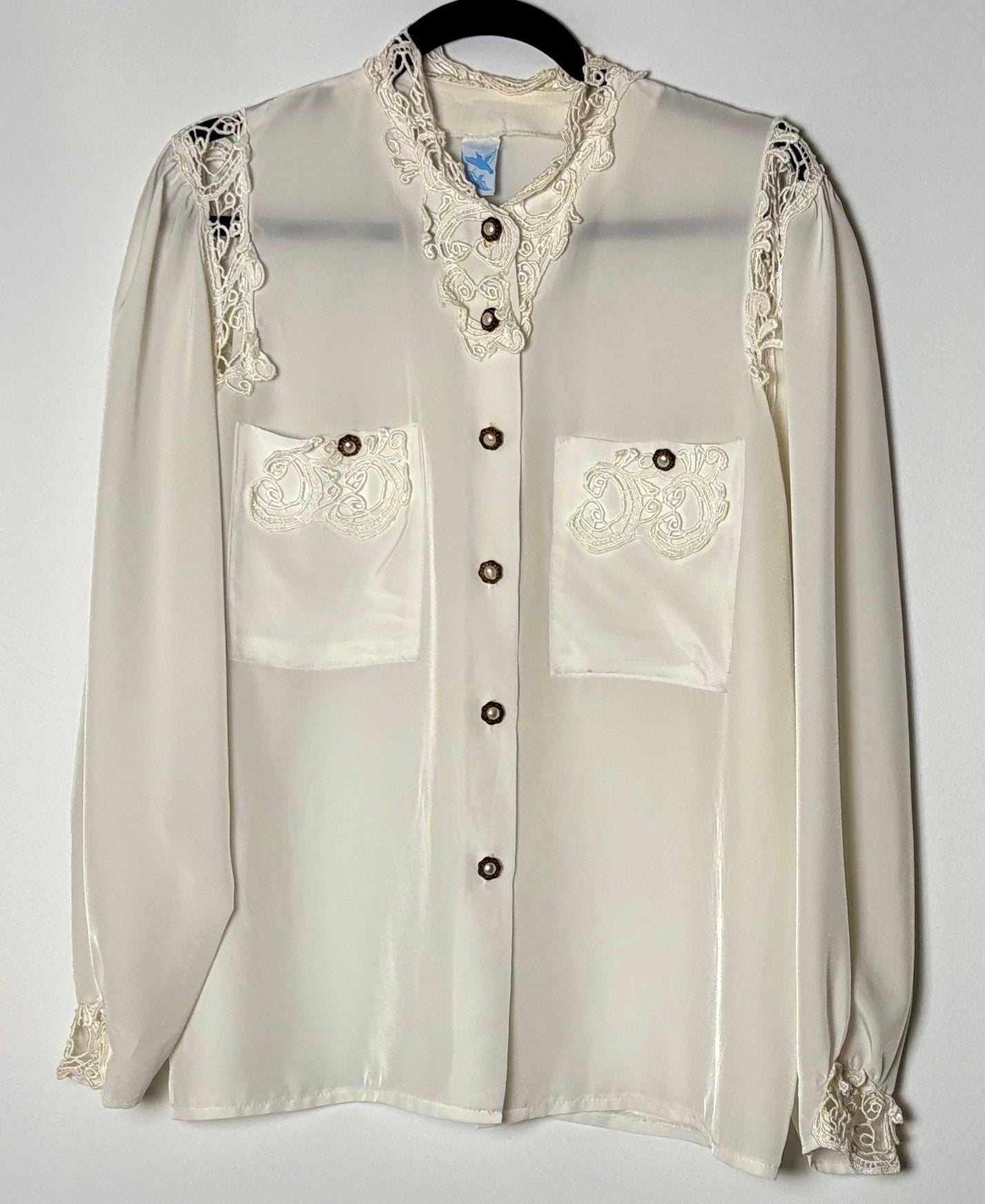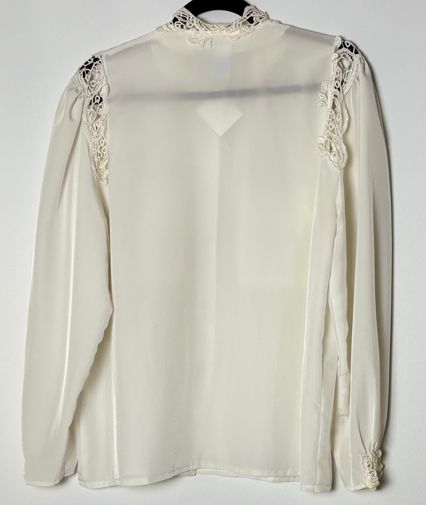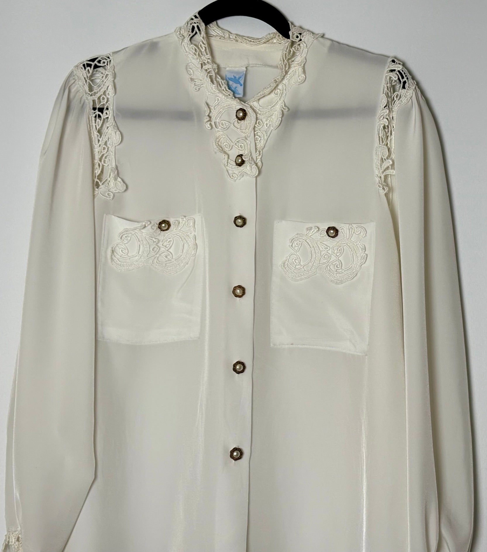 Falleg vintage blússa með hekluðum kraga. Blússan er með. tveim vösum og hneppt að framan.