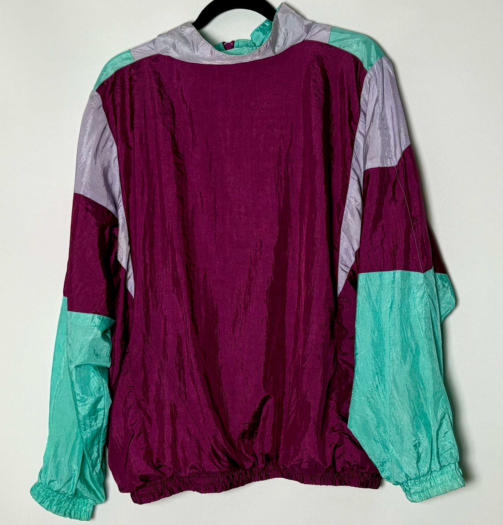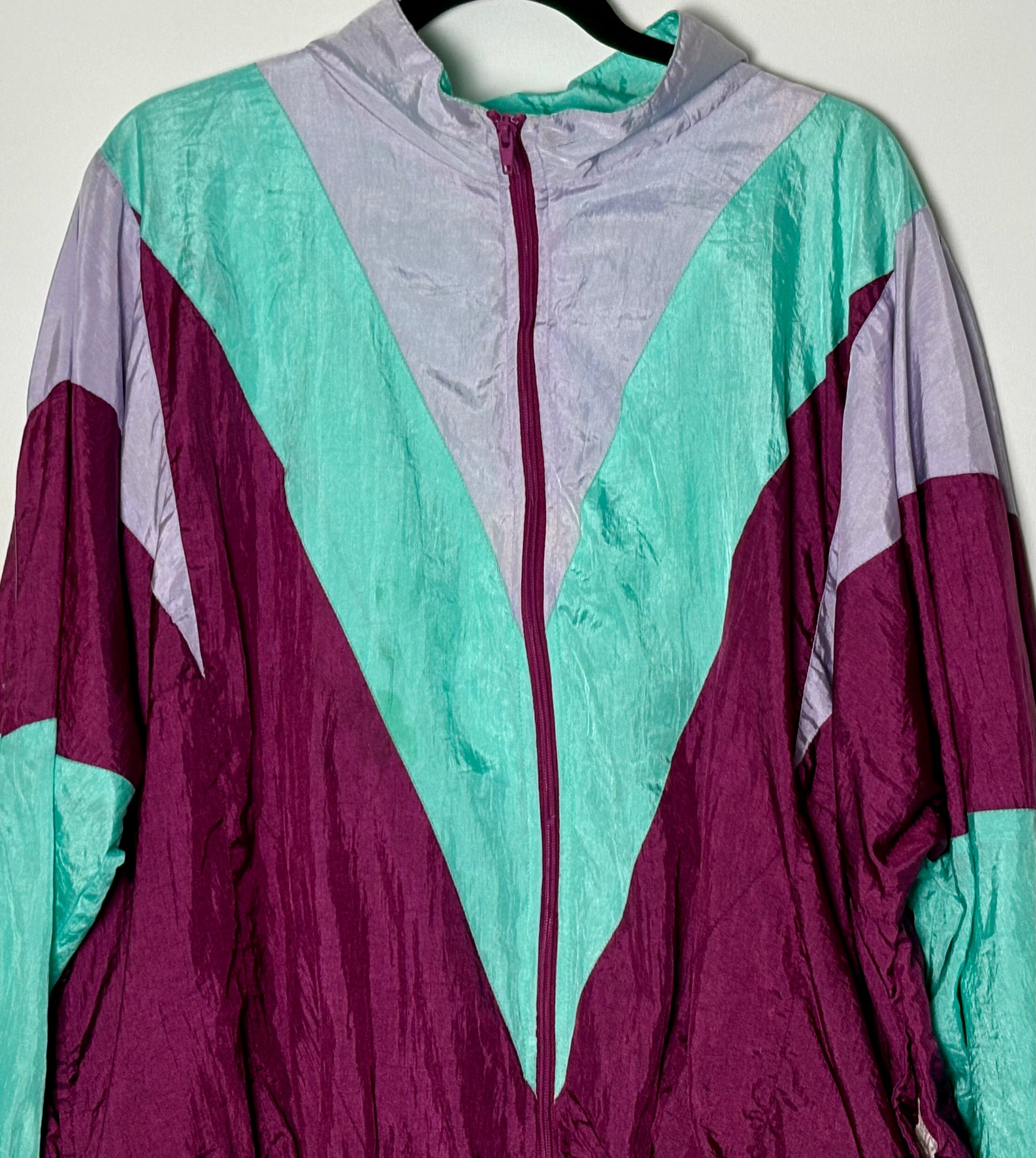 Líflegur vintage 90s jakki. Jakkinn er með rennilás og vösum að framan. Fóðraður að innan með bómullarefni.