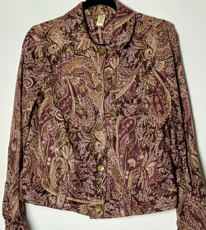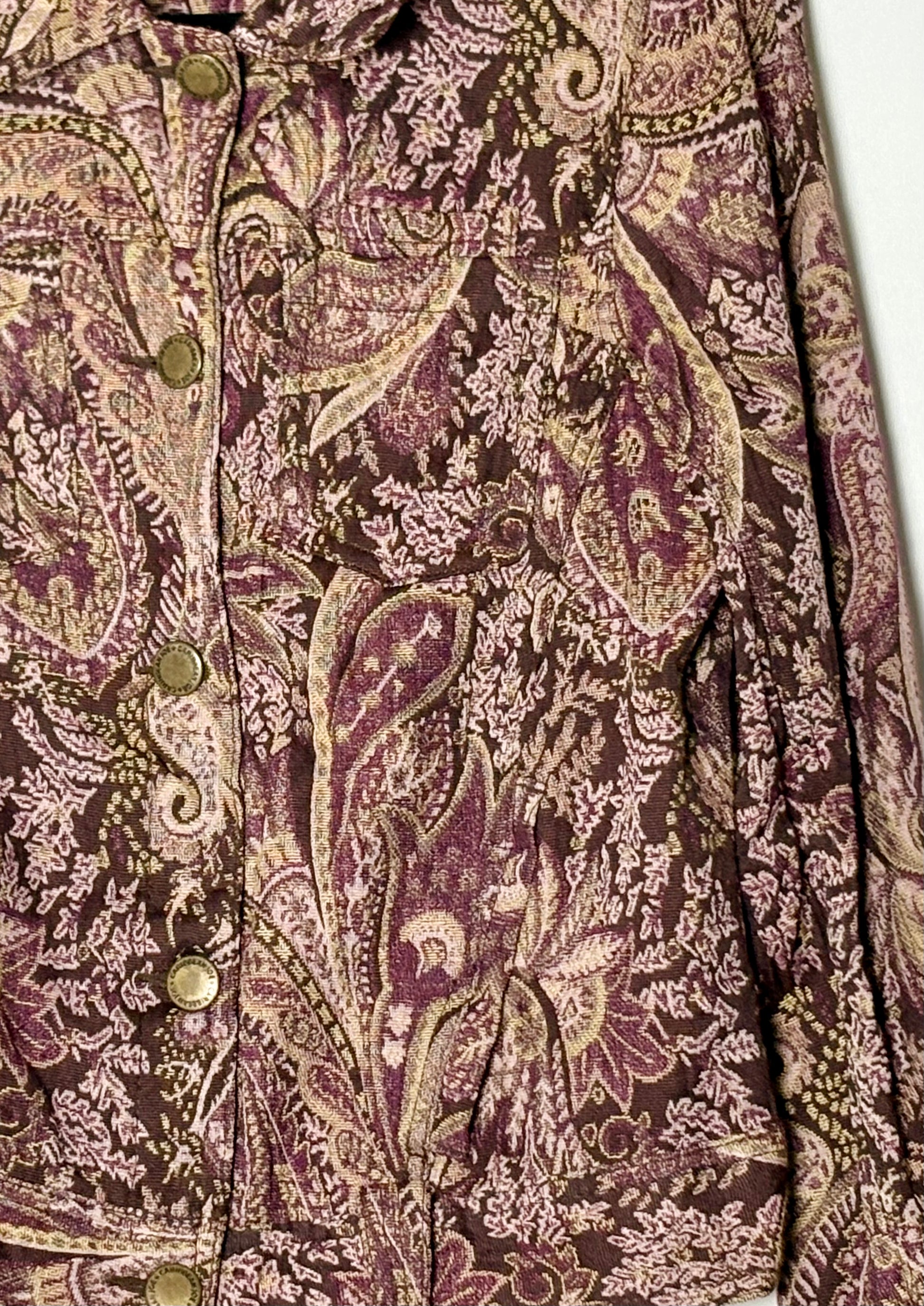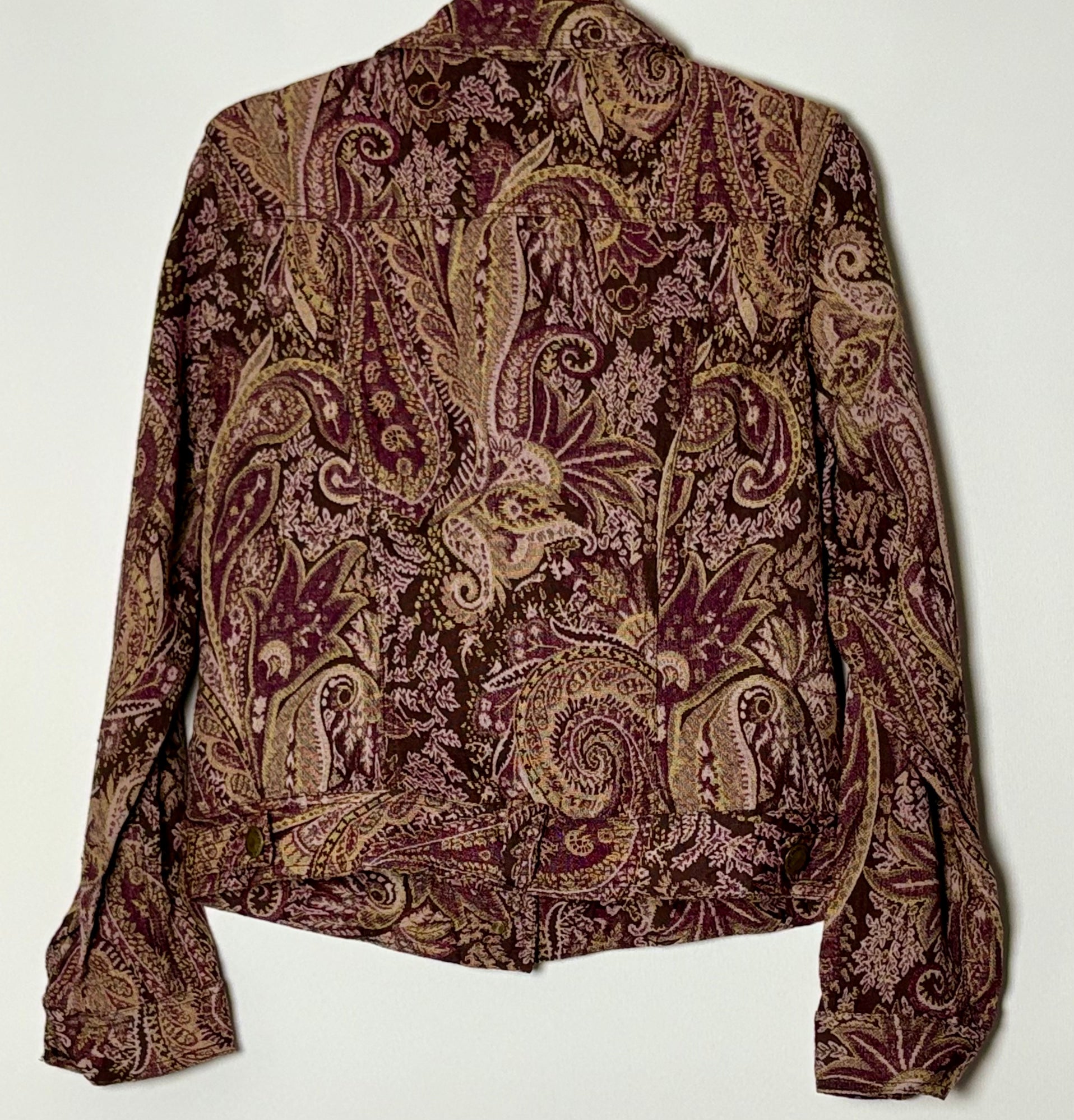 Vintage jakki með skemmtilegu munstri. Jakkinn er í hefðbundnu sniði, með tölum og tveim brjóstvösum að framan. Jakkinn er með kraga. Efnið er teygjanlegt.