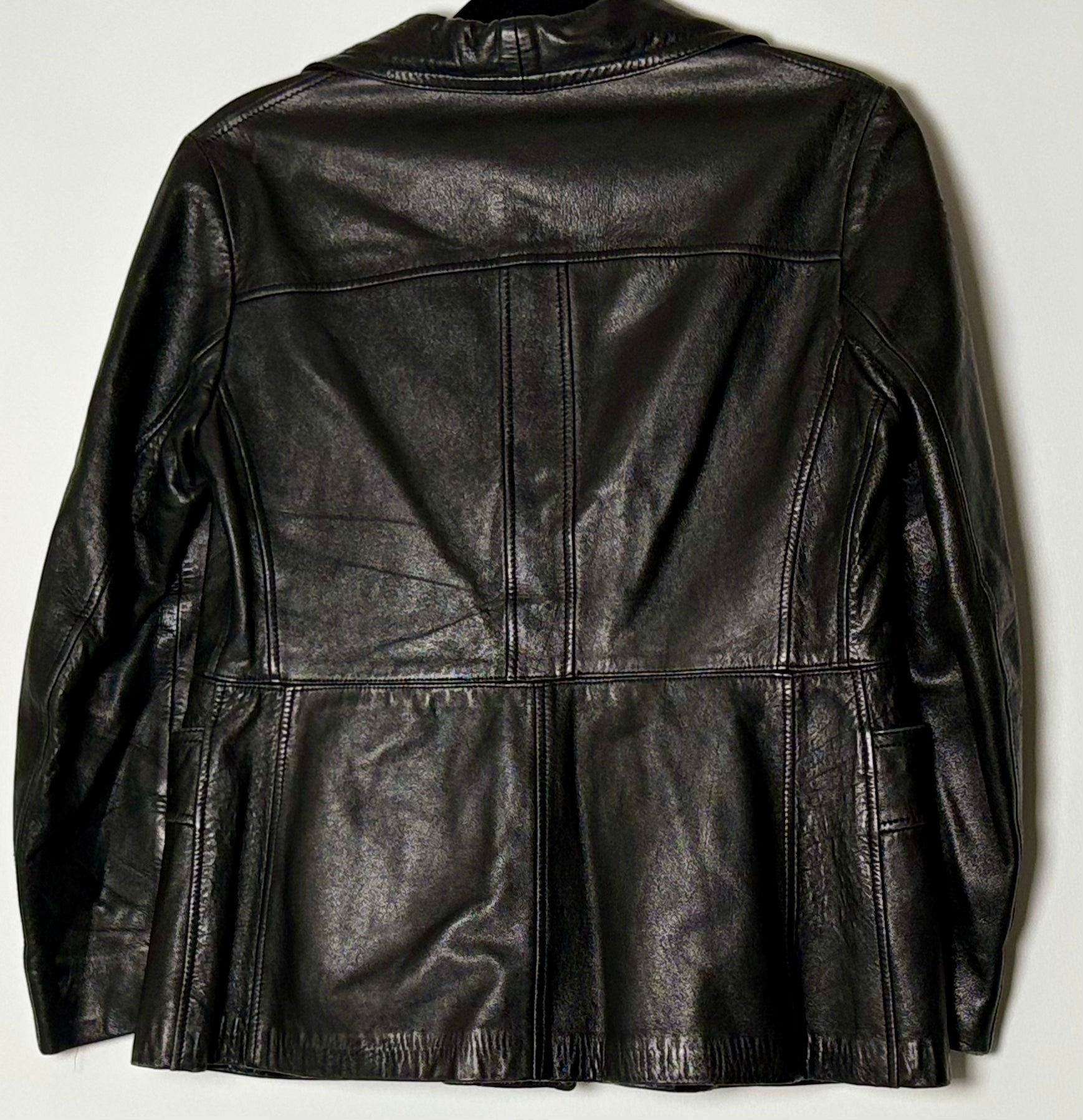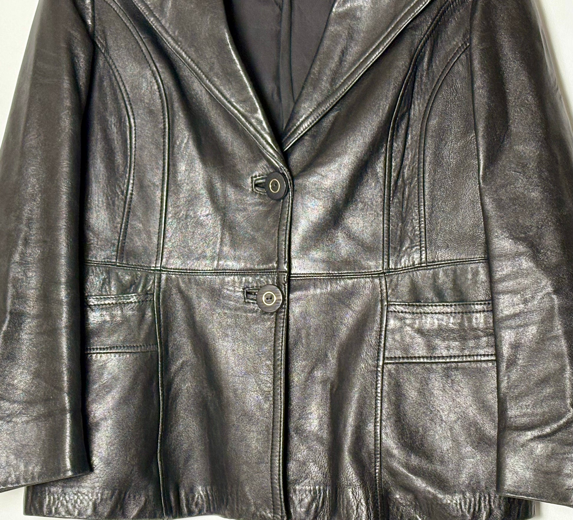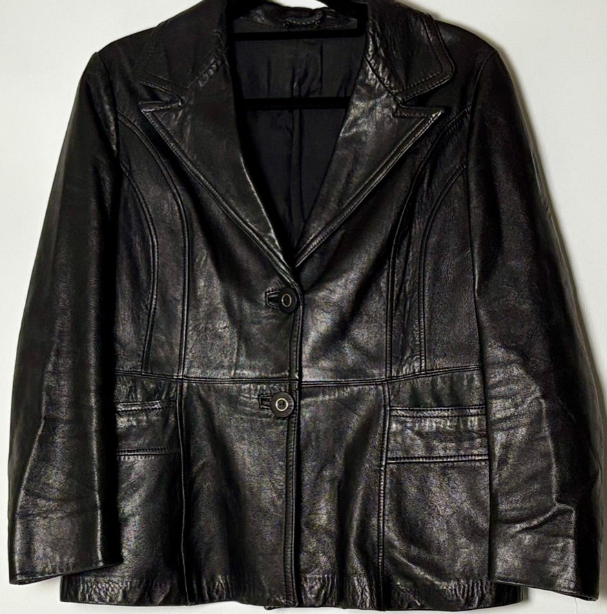 Svartur vintage leðurjakki. Hneppist að framan með tveimur tölum og er með tvo nothæfa vasa. Venjulegt snið.
