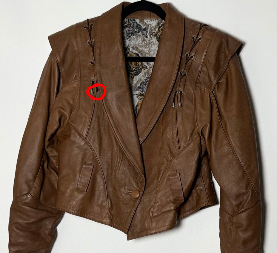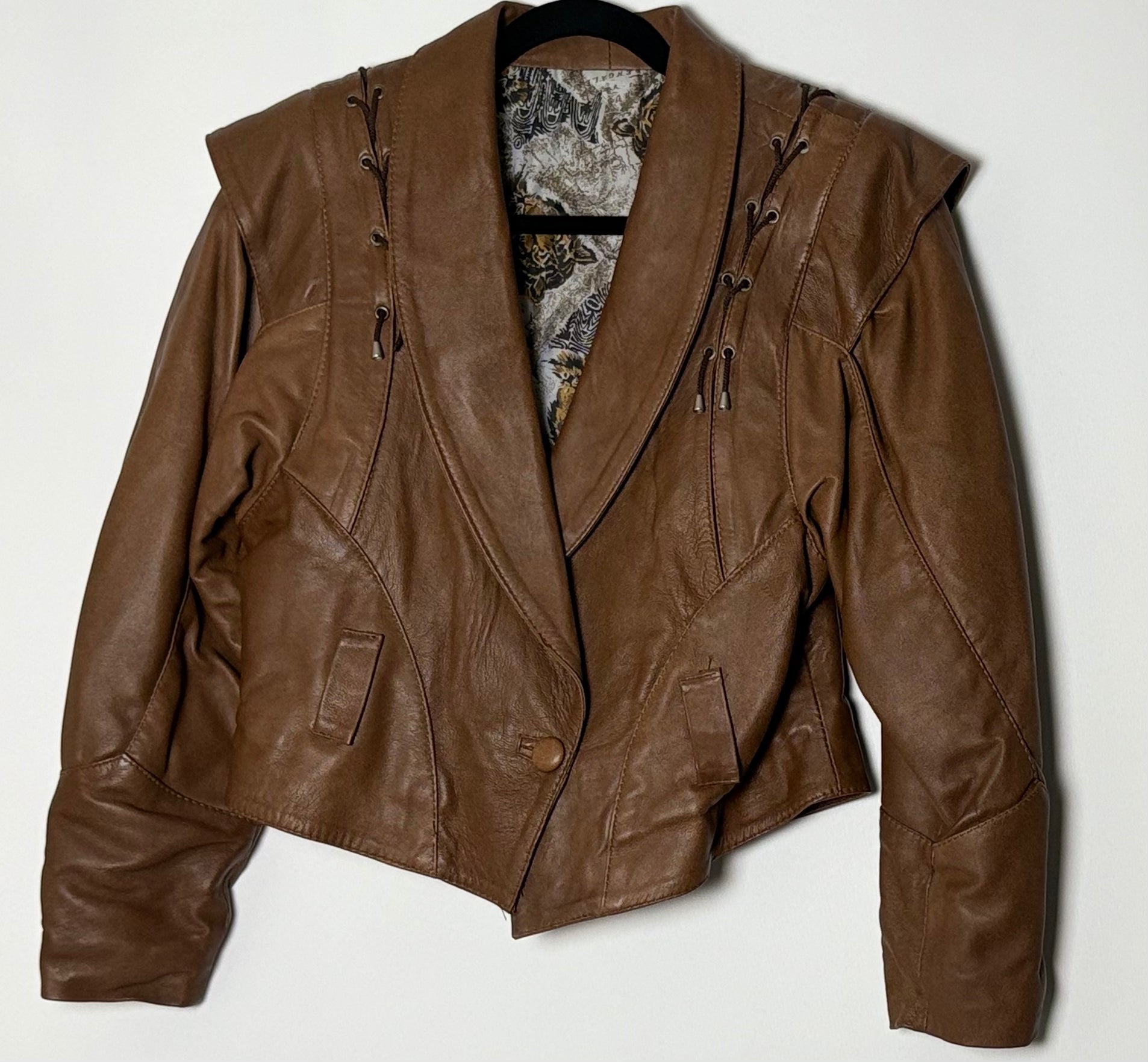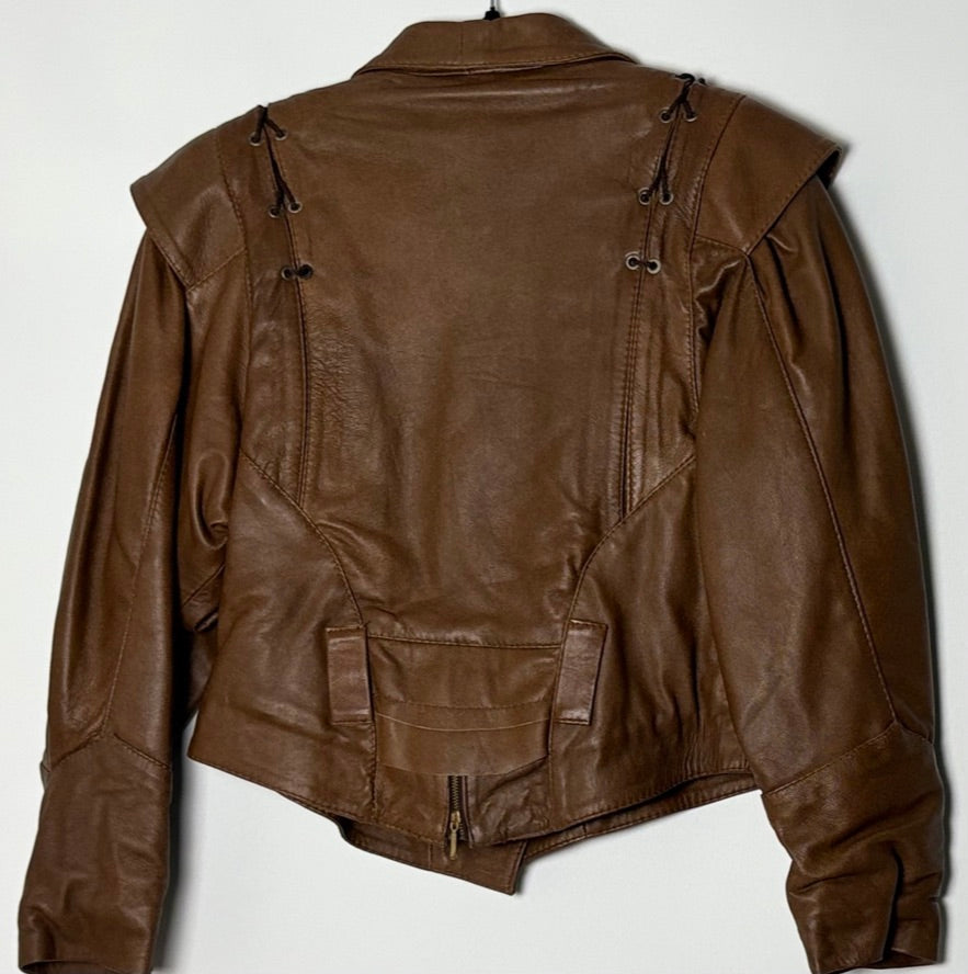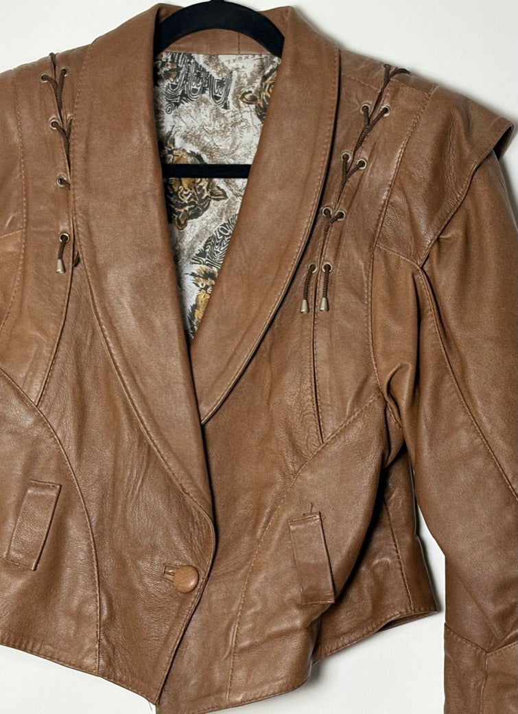 Geggjaður vintage leðurjakki. Jakkinn er stuttur, fóðraður og hneppist með tölu að framan.