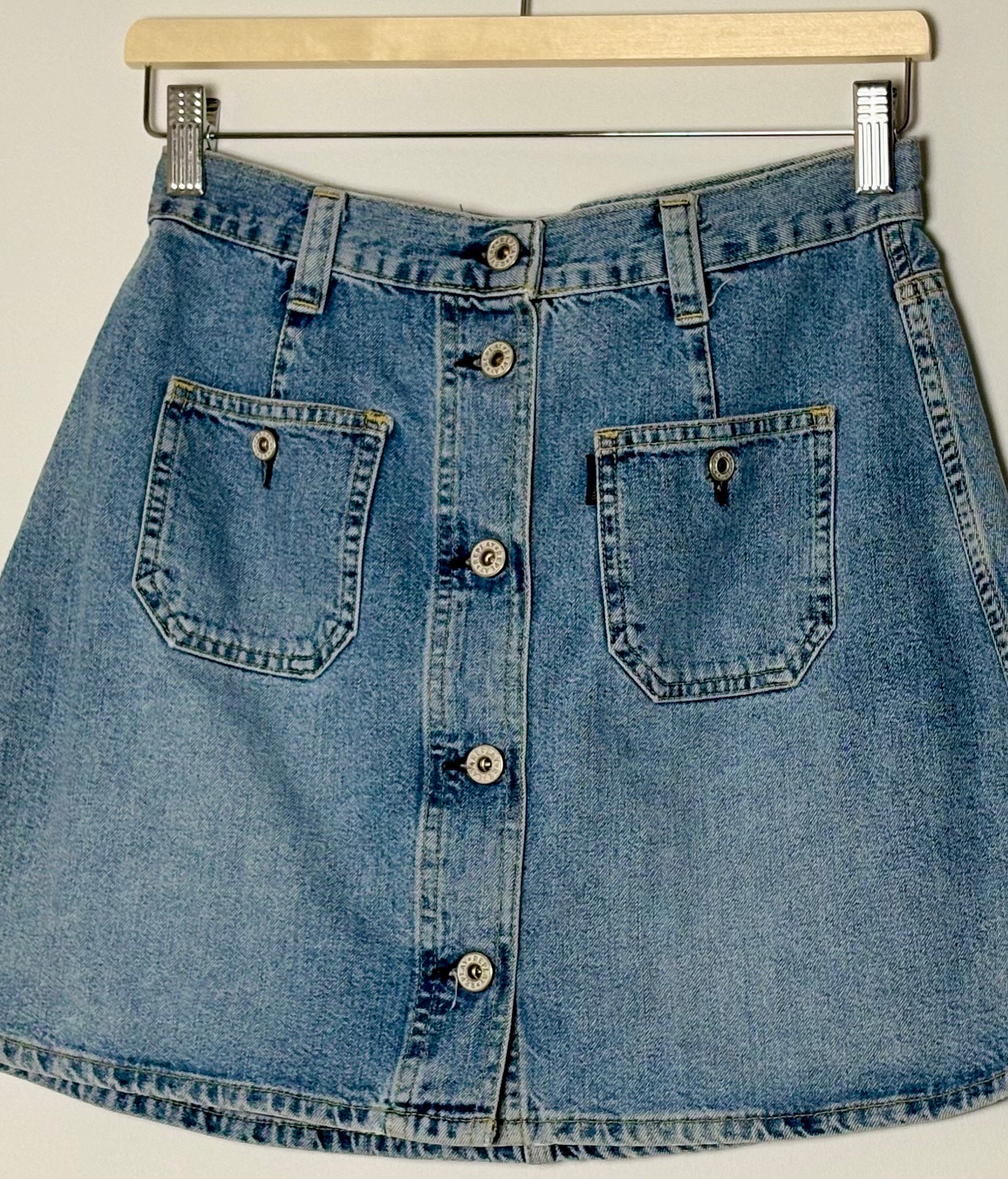 Vintage gallapils frá merkinu Replay. Pilsið er með tölum sem hægt er að hneppa alla leið niður og tveim vösum að framan. Sniðið er A-line.