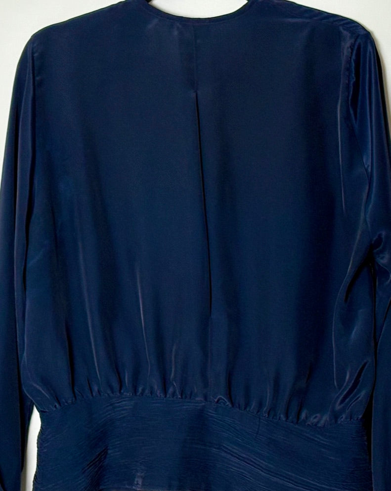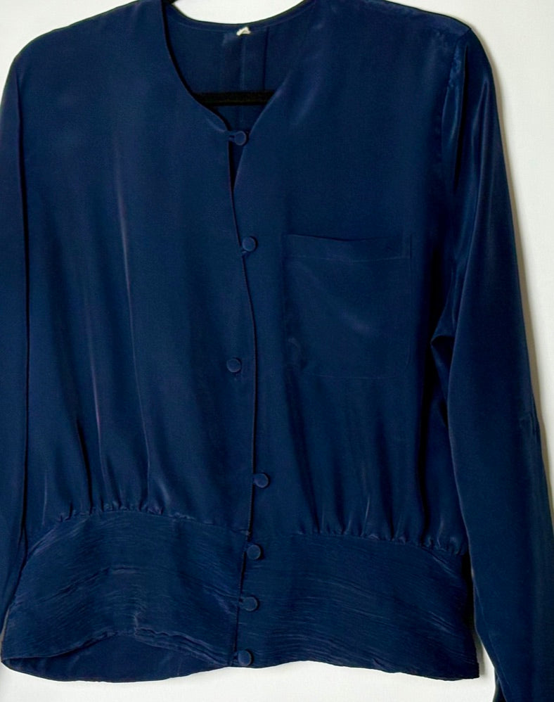 Vintage silkiblússa í fallegum dökkbláum lit. Blússan er með tölum að framan sem og einum litlum brjóstvasa.