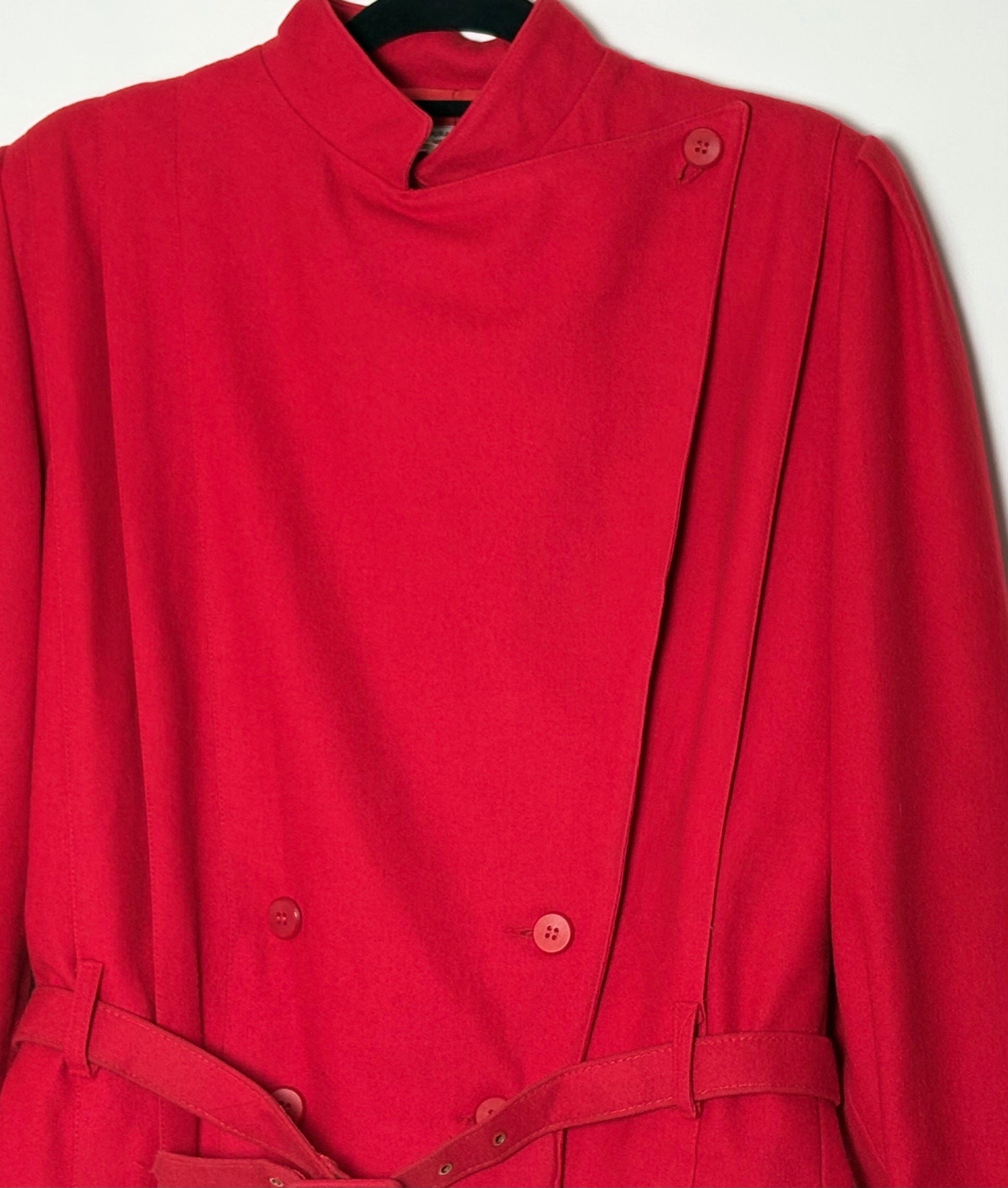 Einstakur vintage ullarjakki. Jakkinn er fóðraður, með vösum og tölum sem hægt er að hneppa uppí háls. Belti fylgir sem hægt er að þrengja mittið með.