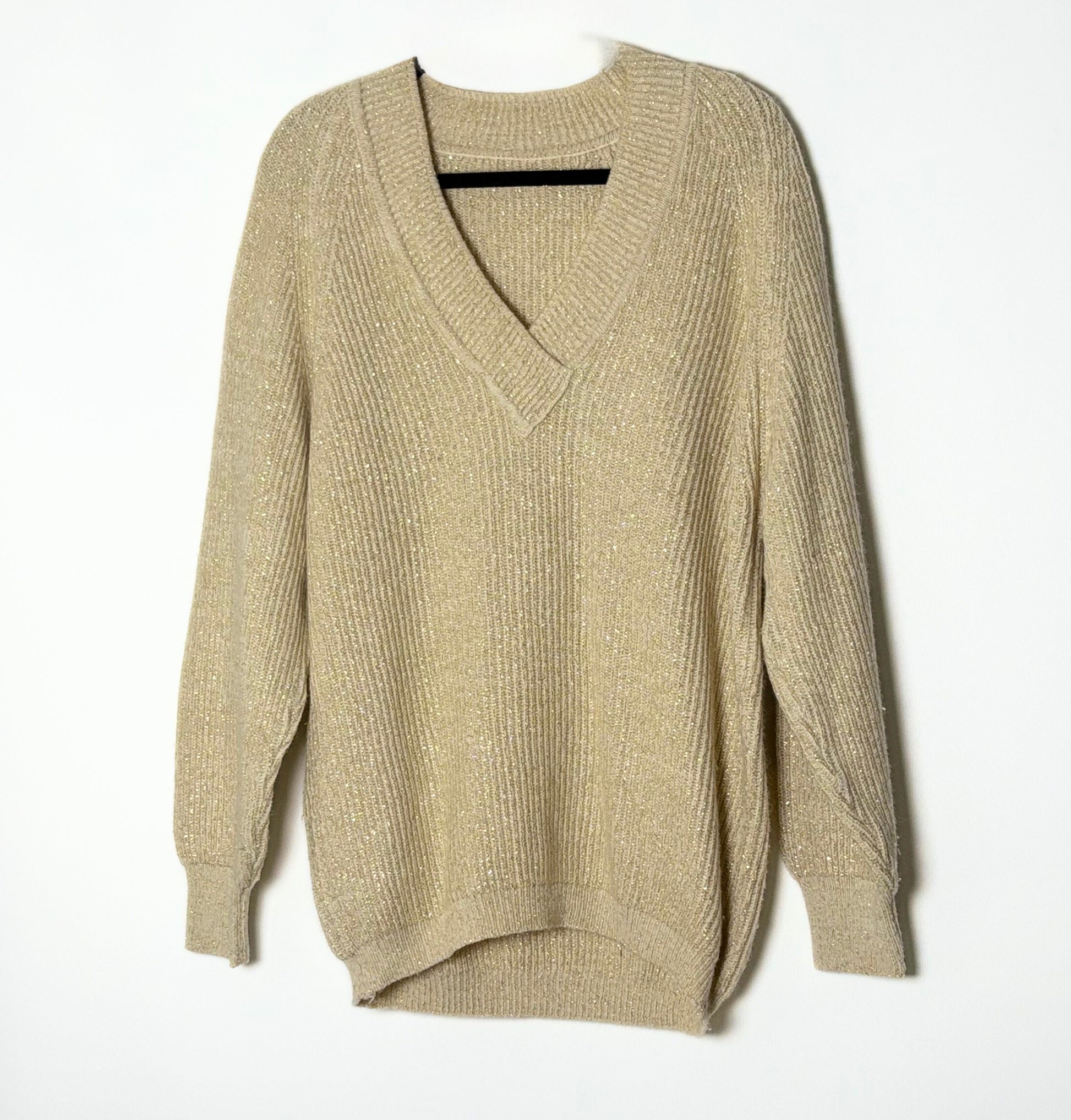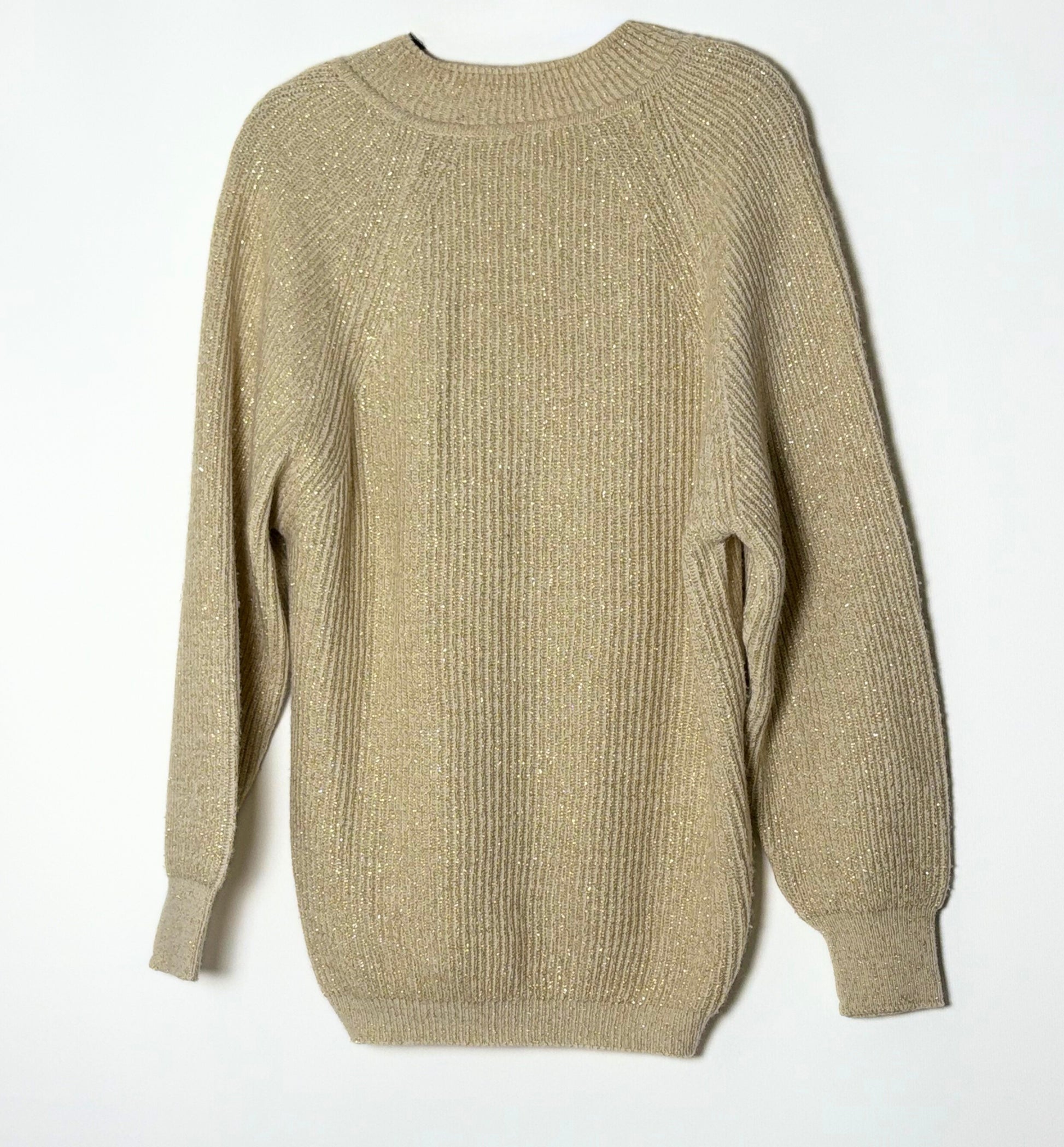 Æðisleg vintage ullarpeysa með glimmer þráðum í gegnum. Peysan er með djúpu v-hálsmáli og tekin saman á ermunum. Hefðbundið snið.