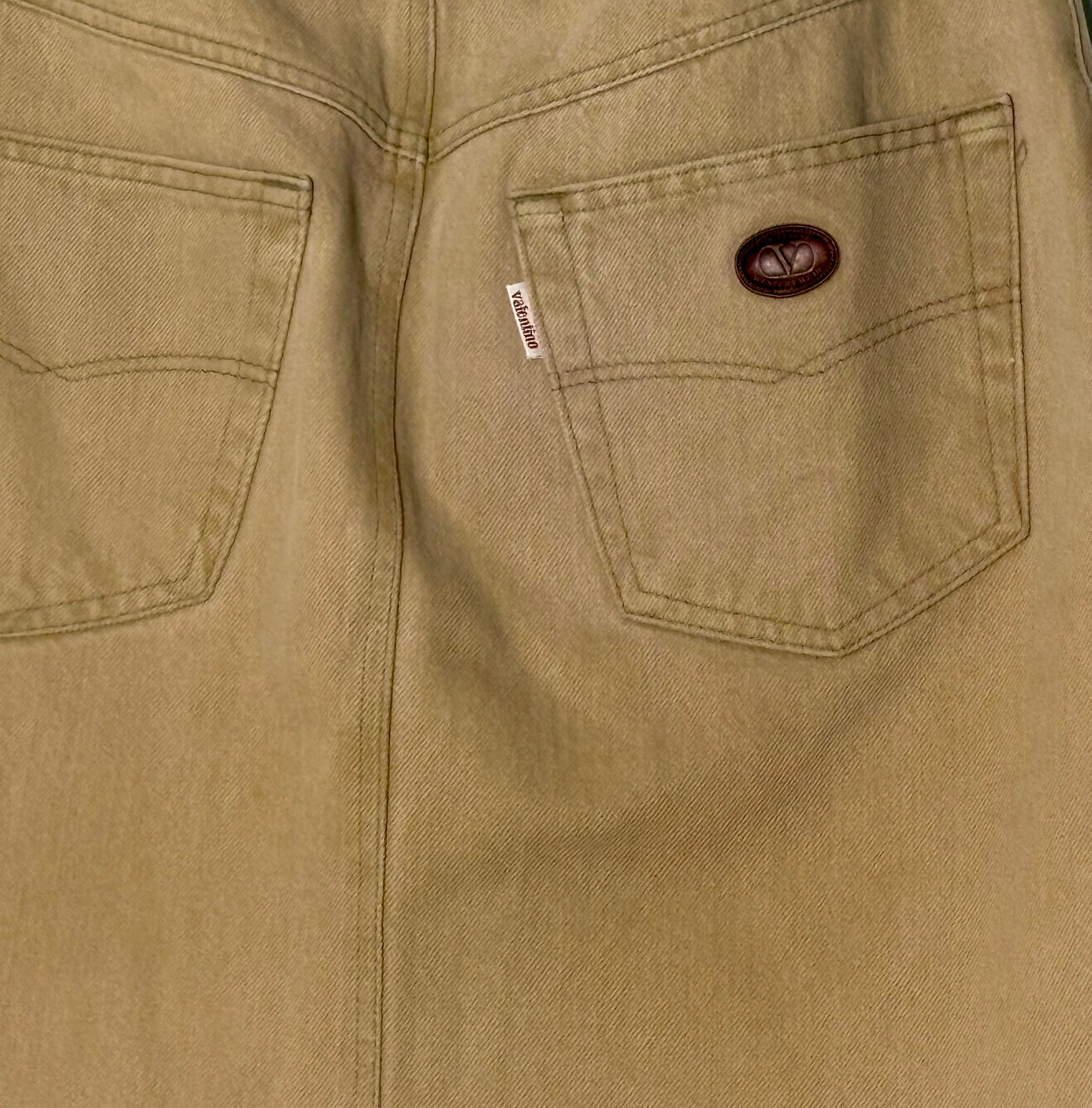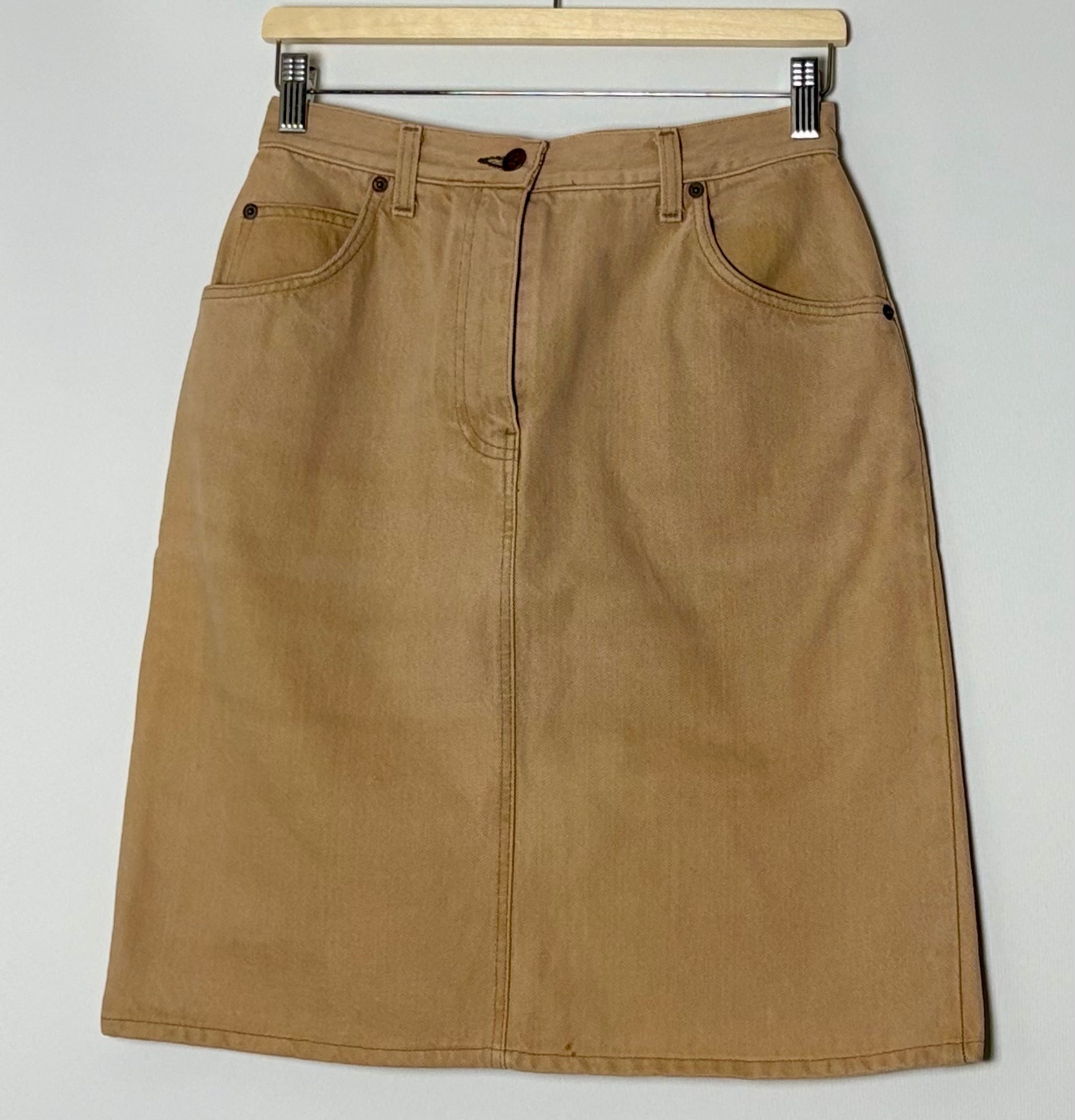 Vintage gallapils frá hátískumerkinu Valentino. Pilsið er ljósbrúnt, með tveim vösum að framan. Það nær niður mitt læri.