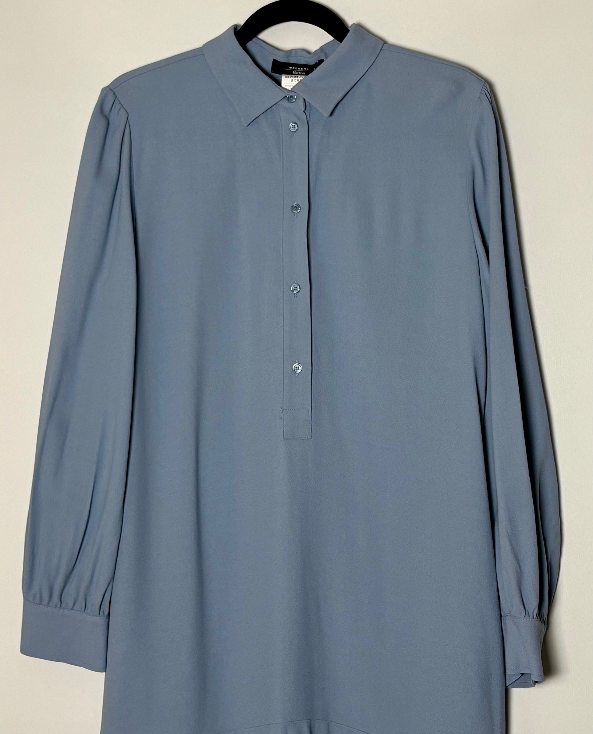 Glæsilegur Weekend Max Mara kjóll í fallegum ljósbláum lit. Kjóllinn hneppist hálfa leið niður að framan, er með kraga og langar ermar. Einnig eru nothæfir vasar að framan.