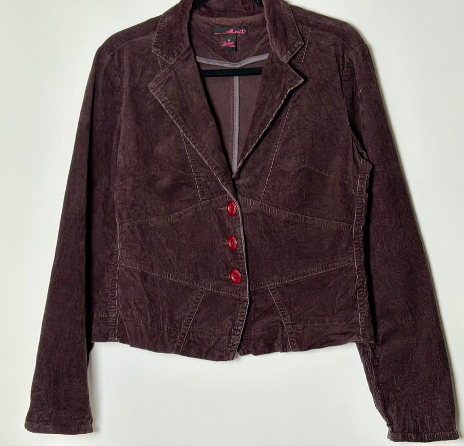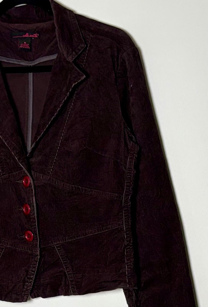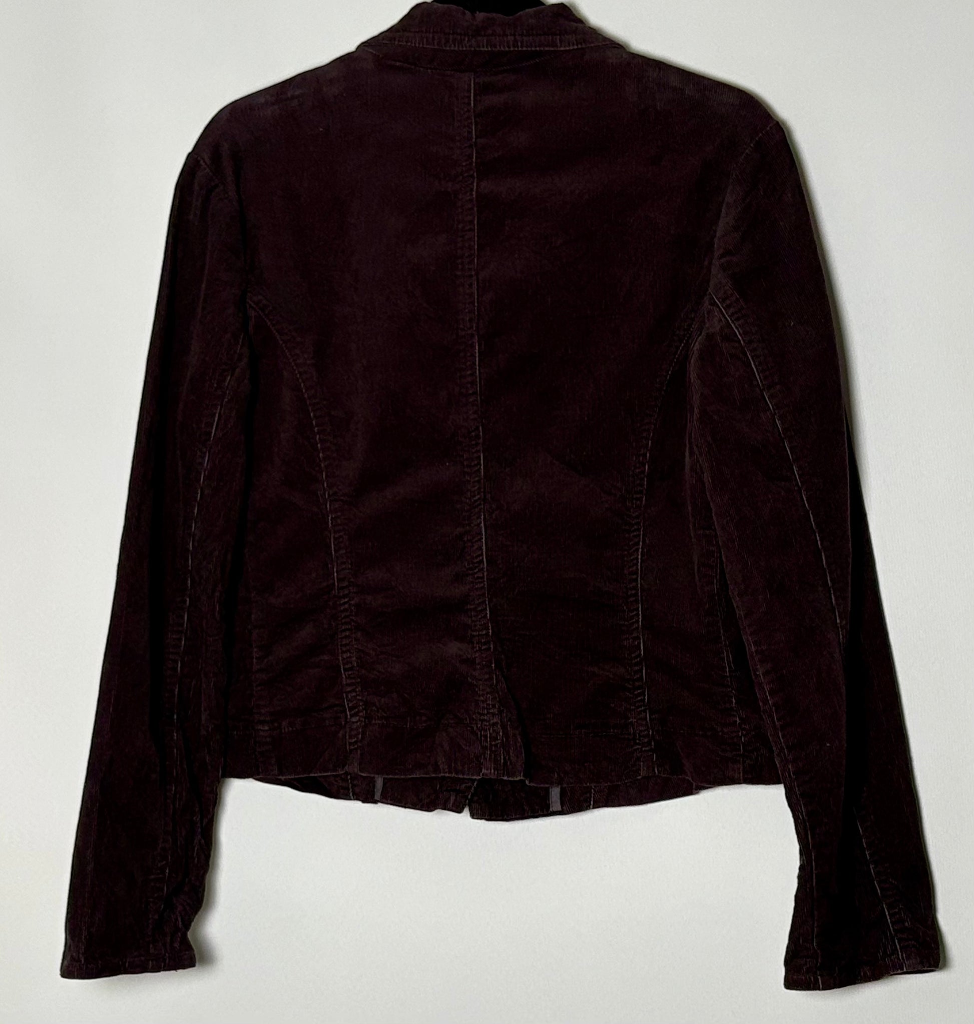 Vintage jakki úr mjúku efni og í fallegum djæupum plómulit. Jakkinn er hnepptur að framan, með djúpu v-hálsmáli. Hann er stuttur og aðsniðinn. Góð teygja er í jakkanum.