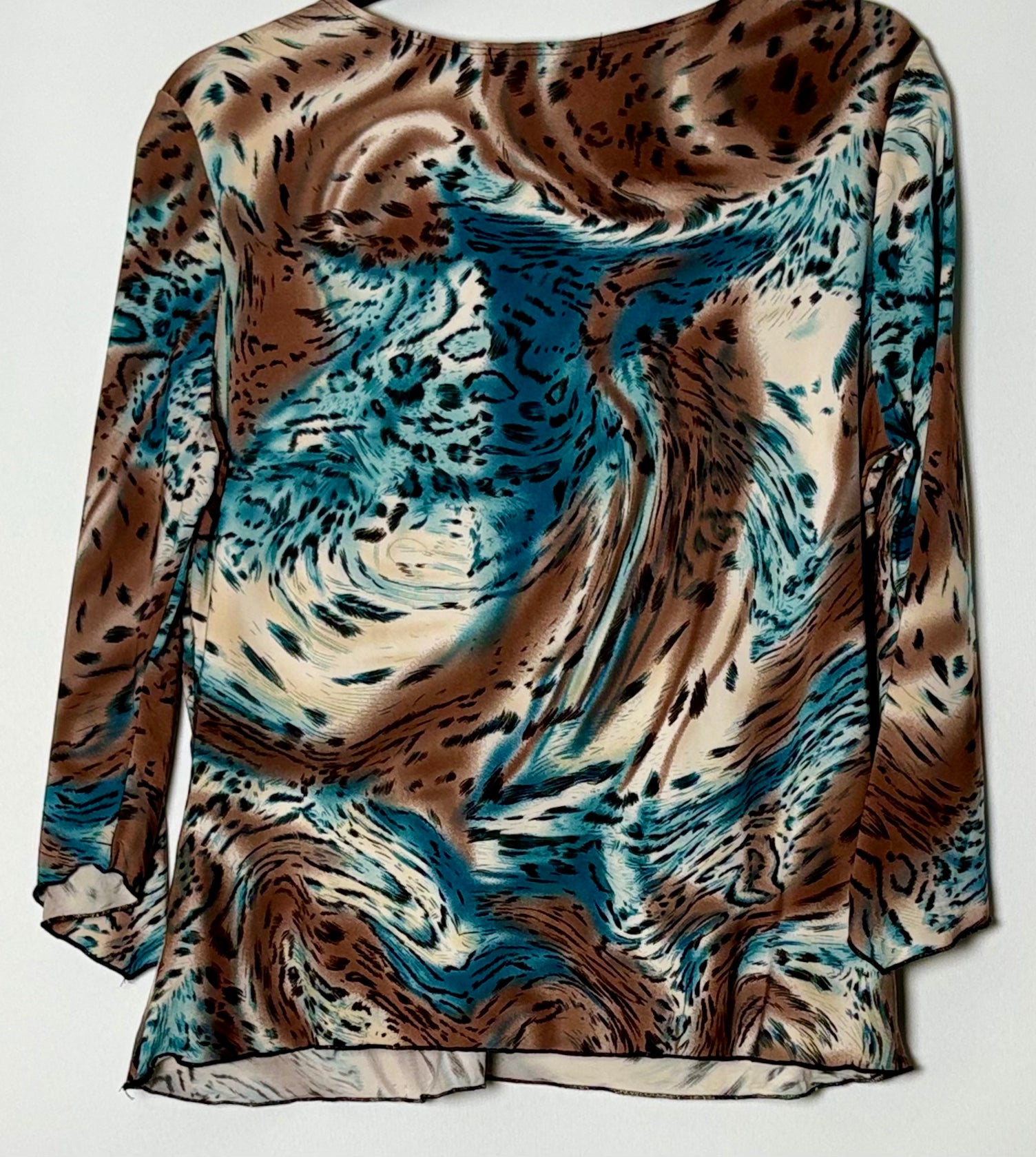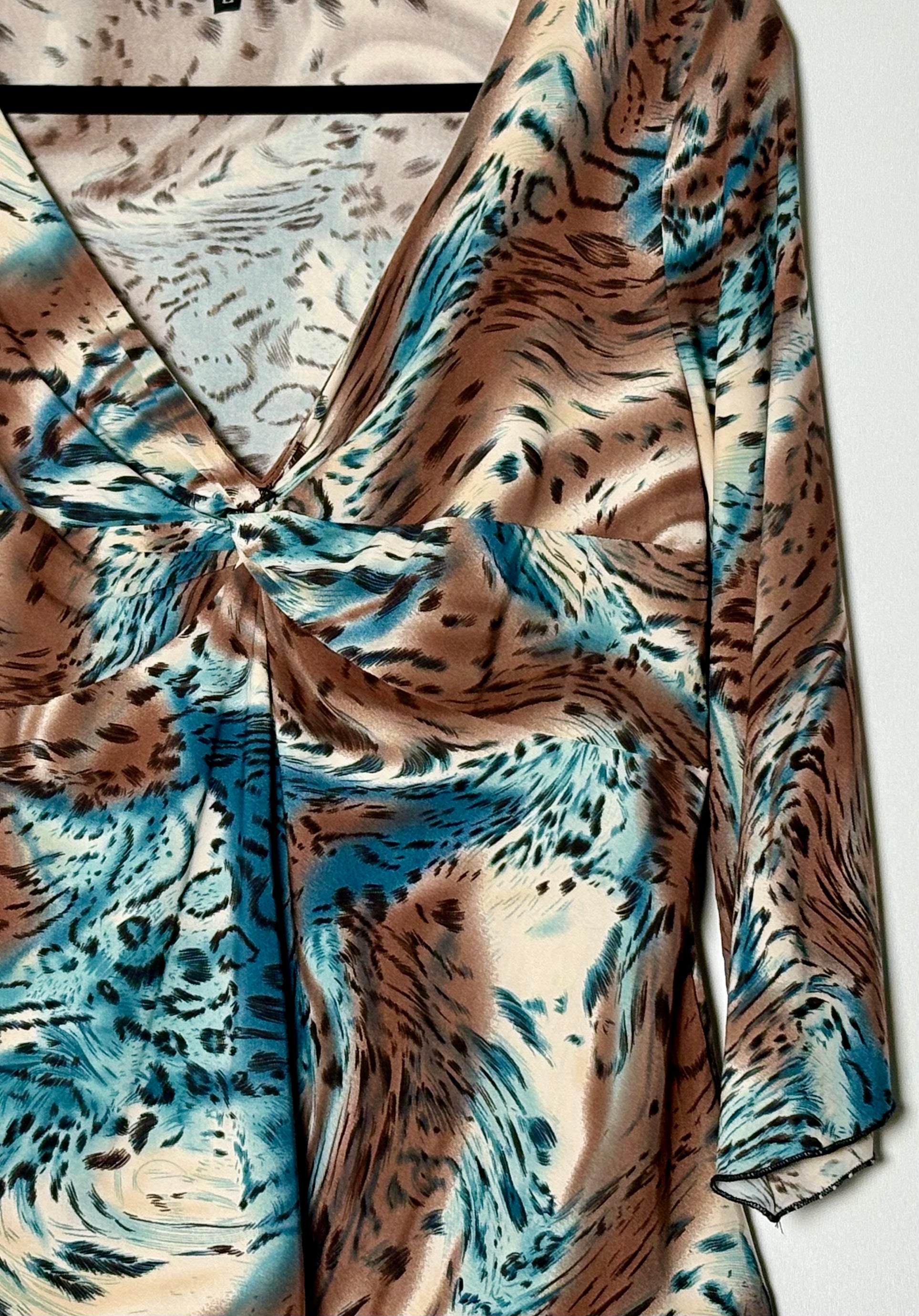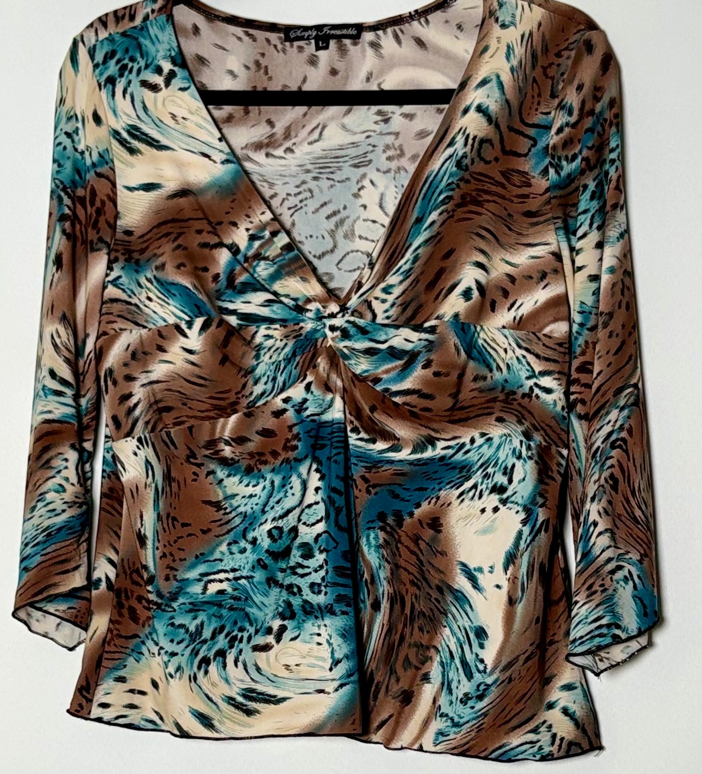 Vintage toppur með skemmtilegu munstri. Toppurinn er með v-hálsmáli og 1/2 ermum. Góð teygja er í efninu. Venjulegt snið.