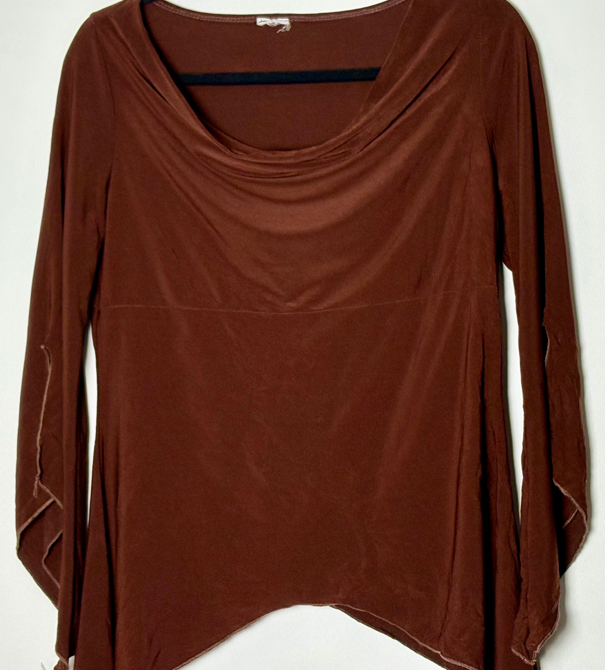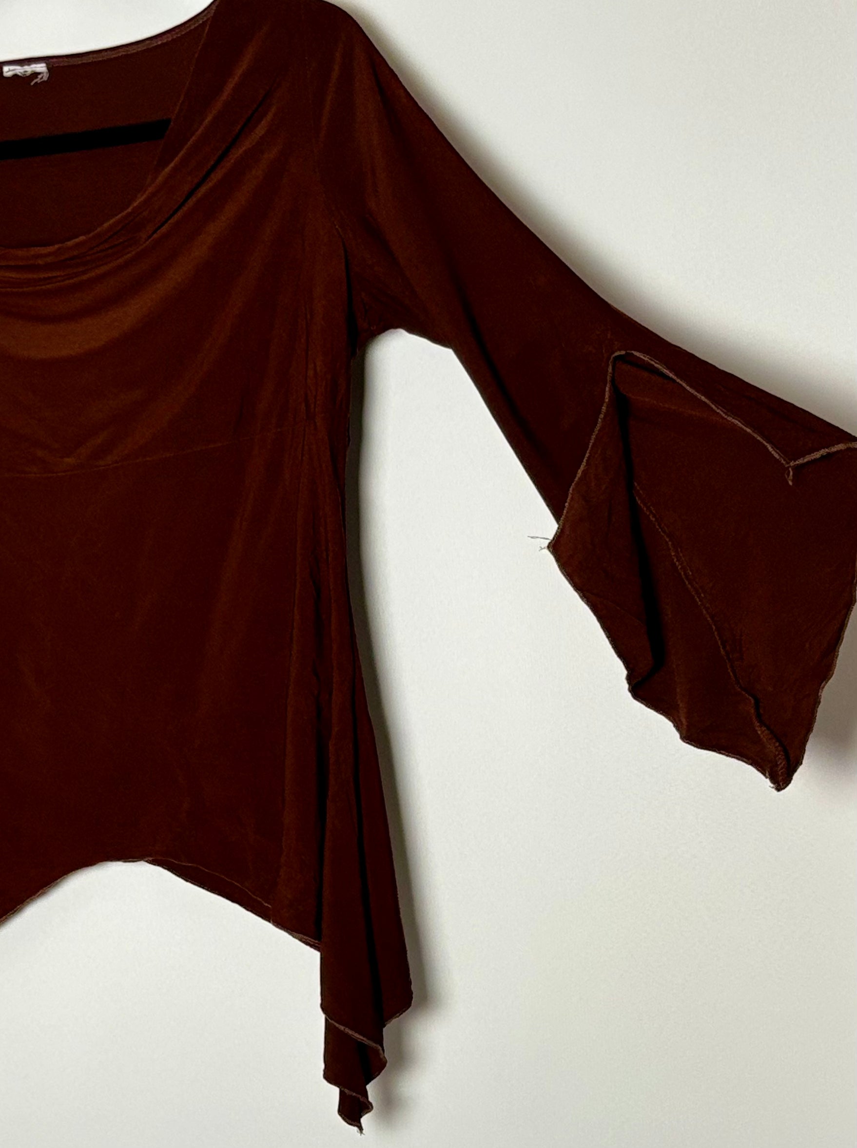 Ekta Y2K toppur í fallegum ríkum brúnum lit. Toppurinn er með útvíðar ermar og missíður á hliðunum. Efnið er teygjanlegt og mjúkt.